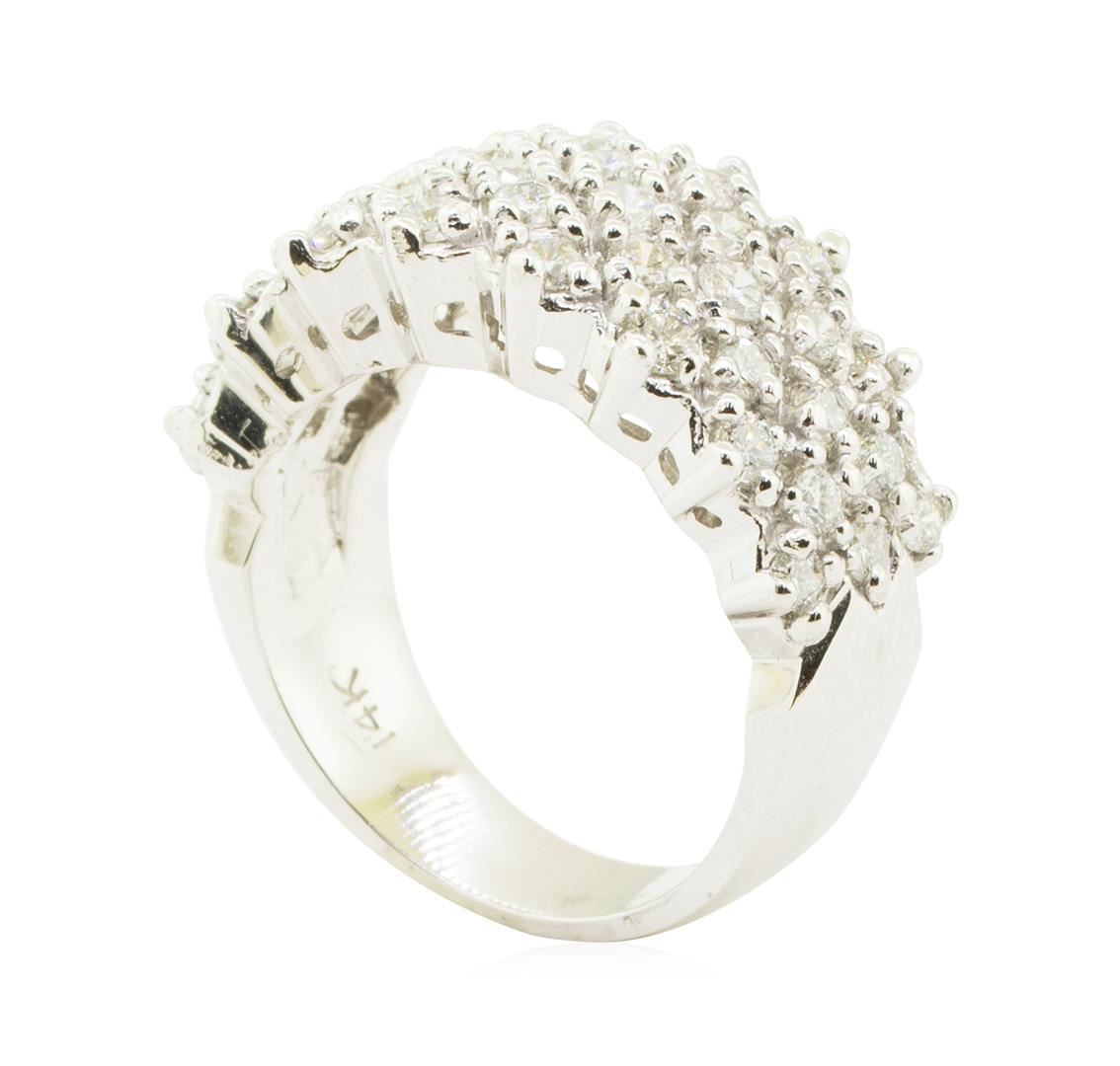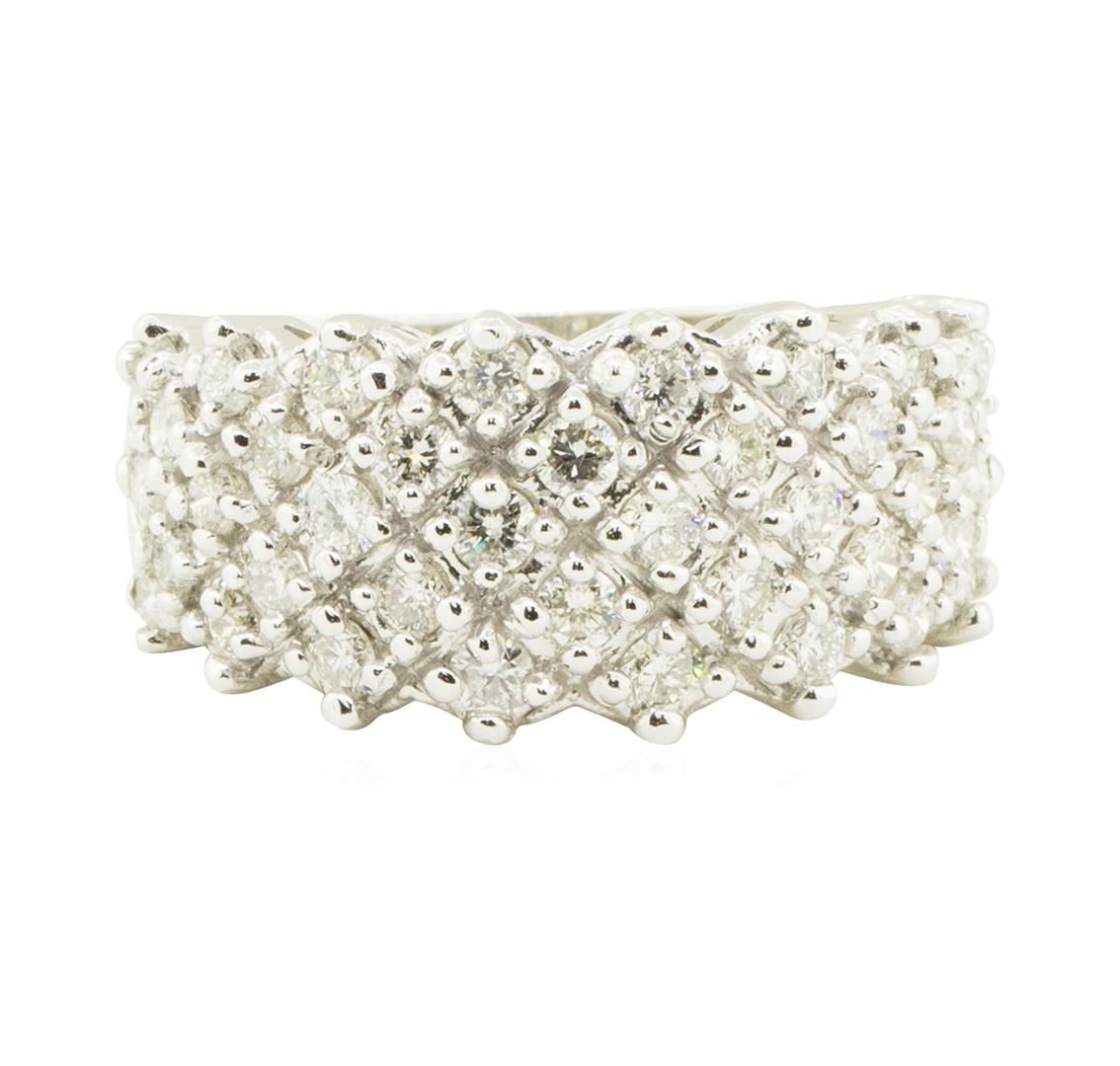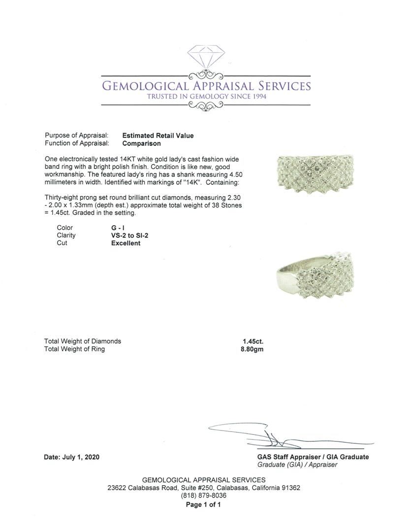 One electronically tested 14KT white gold lady's cast fashion wide band ring with a bright polish finish. The featured lady's ring has a shank measuring 4.50 millimeters in width. Identified with markings of '14K'. Condition is like new, good workmanship. Containing: Thirty-Eight prong set round brilliant cut diamonds, measuring 2.30 - 2.00 x 1.33mm (depth est.) approximate total weight of 38 Stones = 1.45ct. Graded in the setting. Color G - I Clarity VS-2 to SI-2 Cut Excellent. Total Weight of Diamonds 1.45ct.. Total Weight of Ring 8.80gm GAS Appraised at $5445.00. GAS Appraised.