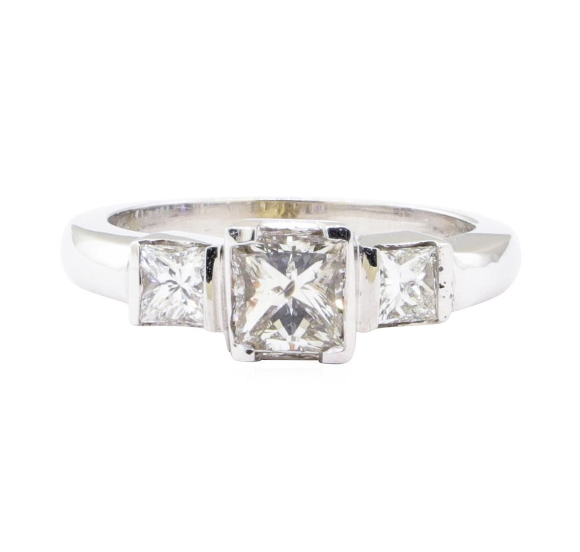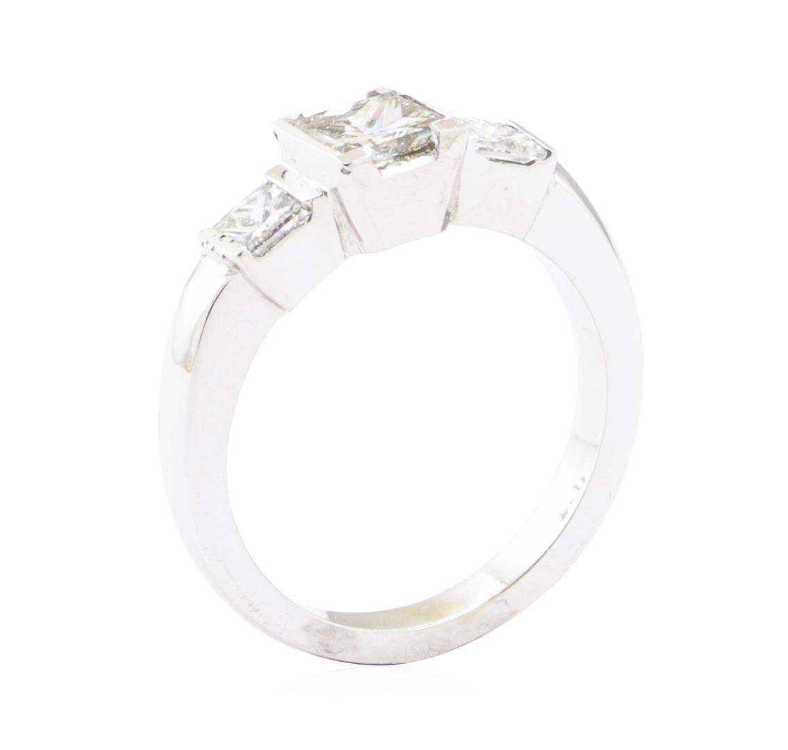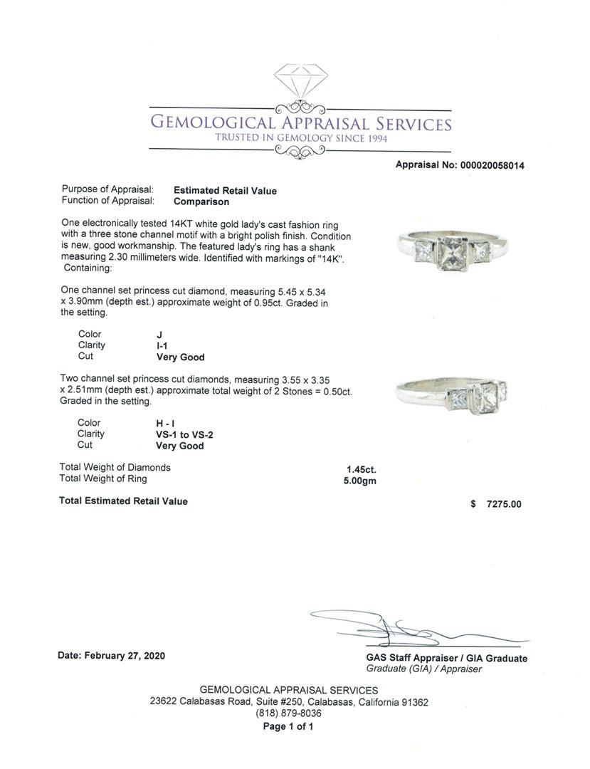 One electronically tested 14KT white gold lady's cast fashion ring with a three stone channel motif with a bright polish finish. The featured lady's ring has a shank measuring 2.30 millimeters wide. Identified with markings of '14K'. Condition is new, good workmanship. Containing: One channel set princess cut diamond, measuring 5.45 x 5.34 x 3.90mm (depth est.) approximate weight of 0.95ct. Graded in the setting. Color J Clarity I-1 Cut Very Good Two channel set princess cut diamonds, measuring 3.55 x 3.35 x 2.51mm (depth est.) approximate total weight of 2 Stones = 0.50 ct. Graded in the setting. Color H - I Clarity VS-1 to VS-2 Cut Very Good. Total Weight of Diamonds 1.45ct.. Total Weight of Ring 5.00gm GAS Appraised at $7275.00. GAS Appraised.