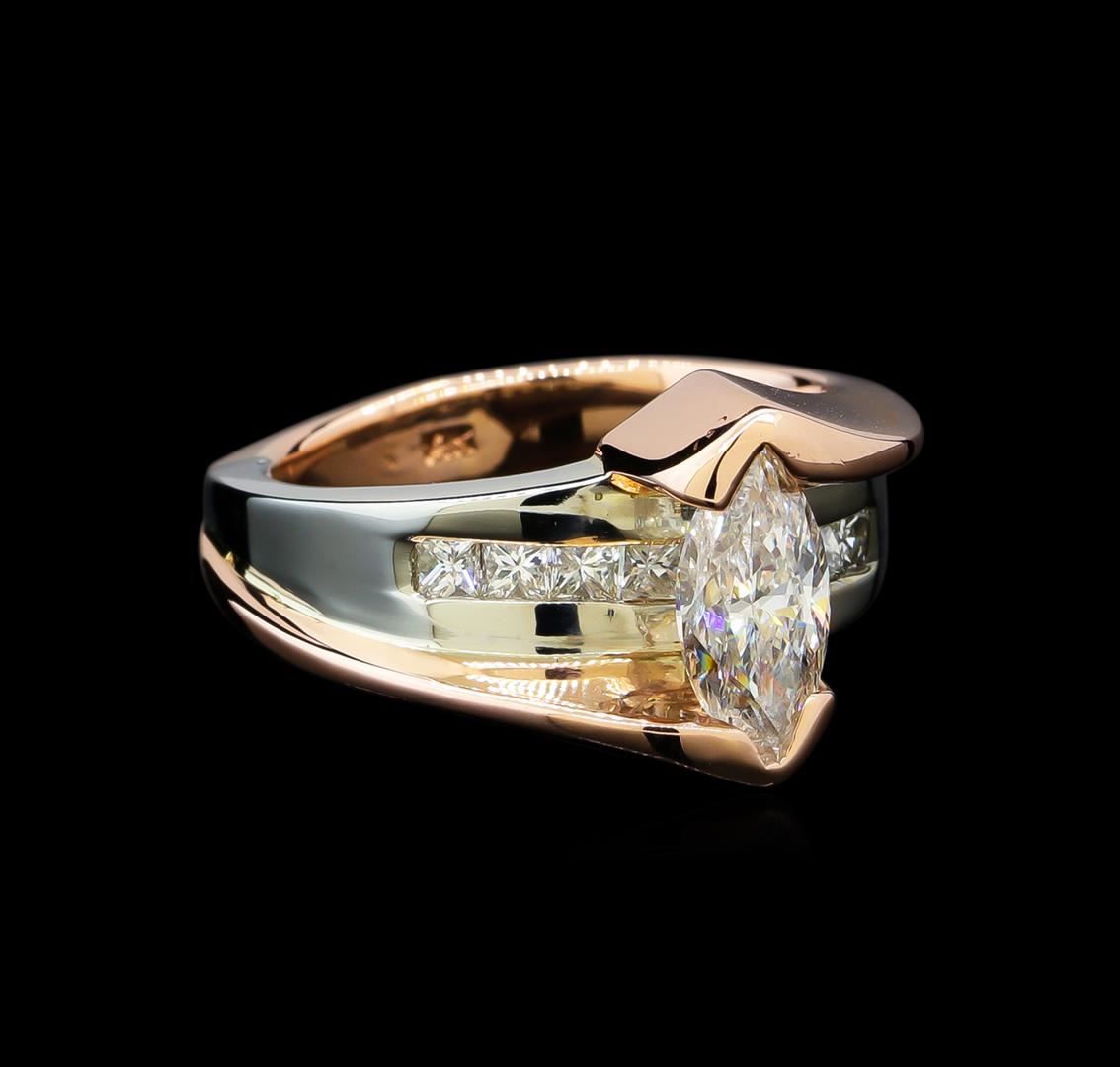 One 14K white and 14K pink gold ring. 9.82 GR. Main Gemstones: Identity: Natural diamond. Carat weight: 1.25 CTS TW. Shape and measurement: Marquis shape. Quality: SI clarity, I-J color. Adjacent Gemstones: Identity: Natural diamonds. Shape: Princess cut diamonds. Carat weight: 0.20 CTS TW. Quality: SI clarity, G-H color. All fine cutting and proportions. Total gemstones weight: 1.45 CTS TW. RBGS Appraised at $9,200.00.