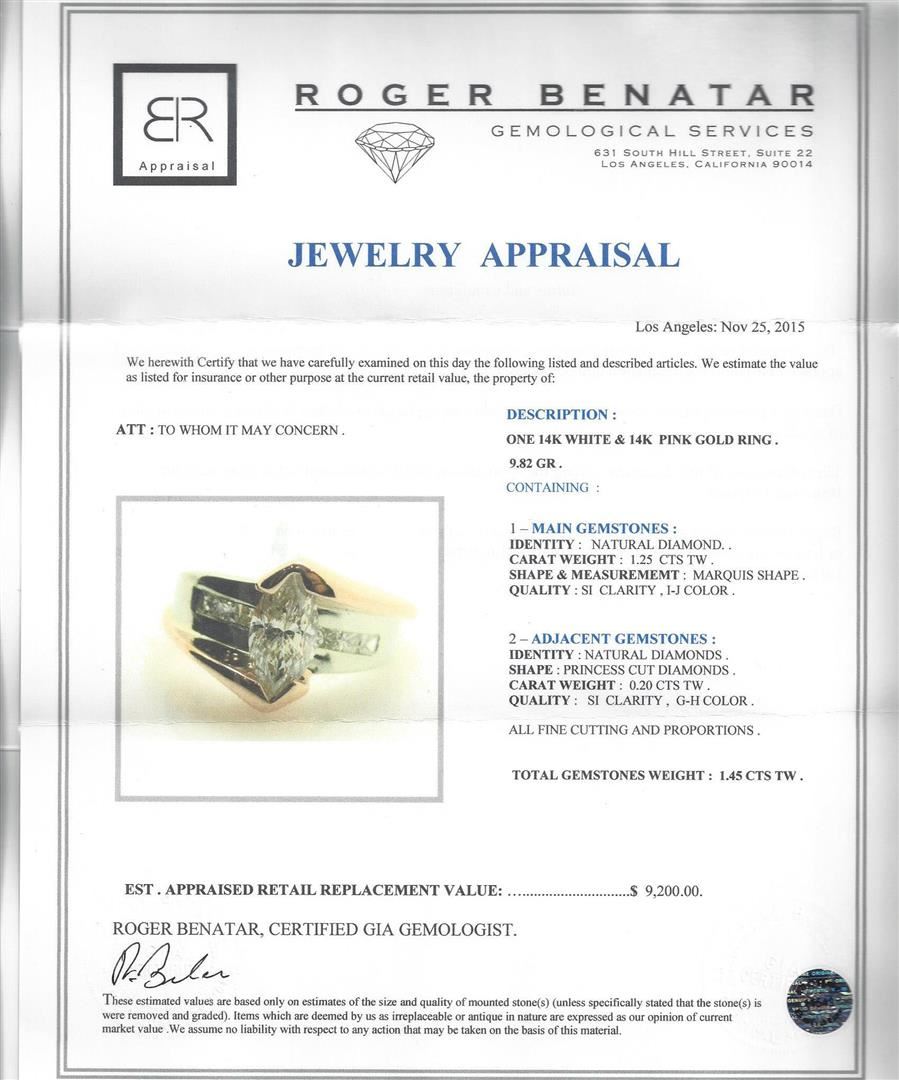 One 14K white and 14K pink gold ring. 9.82 GR. Main Gemstones: Identity: Natural diamond. Carat weight: 1.25 CTS TW. Shape and measurement: Marquis shape. Quality: SI clarity, I-J color. Adjacent Gemstones: Identity: Natural diamonds. Shape: Princess cut diamonds. Carat weight: 0.20 CTS TW. Quality: SI clarity, G-H color. All fine cutting and proportions. Total gemstones weight: 1.45 CTS TW. RBGS Appraised at $9,200.00.