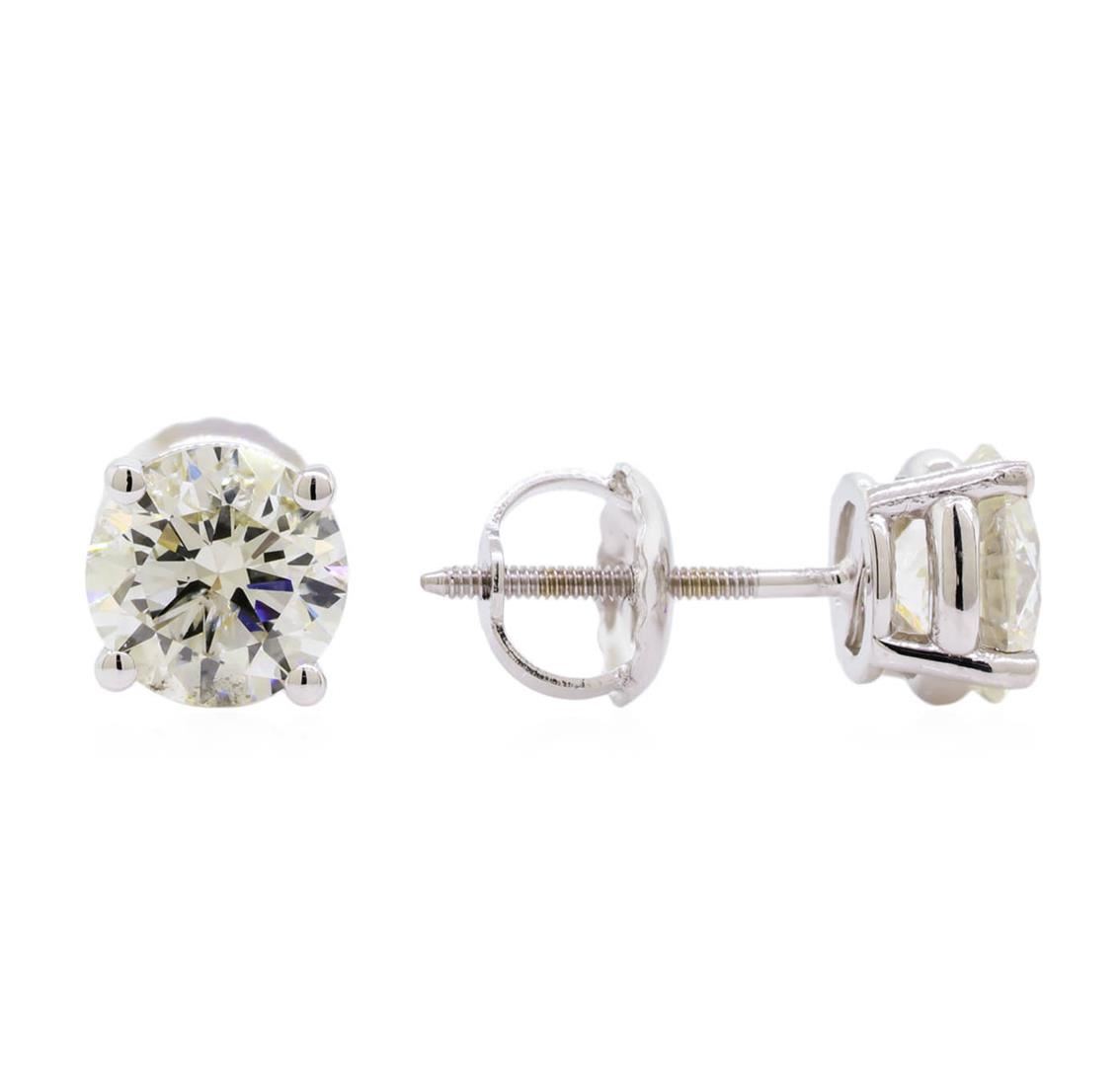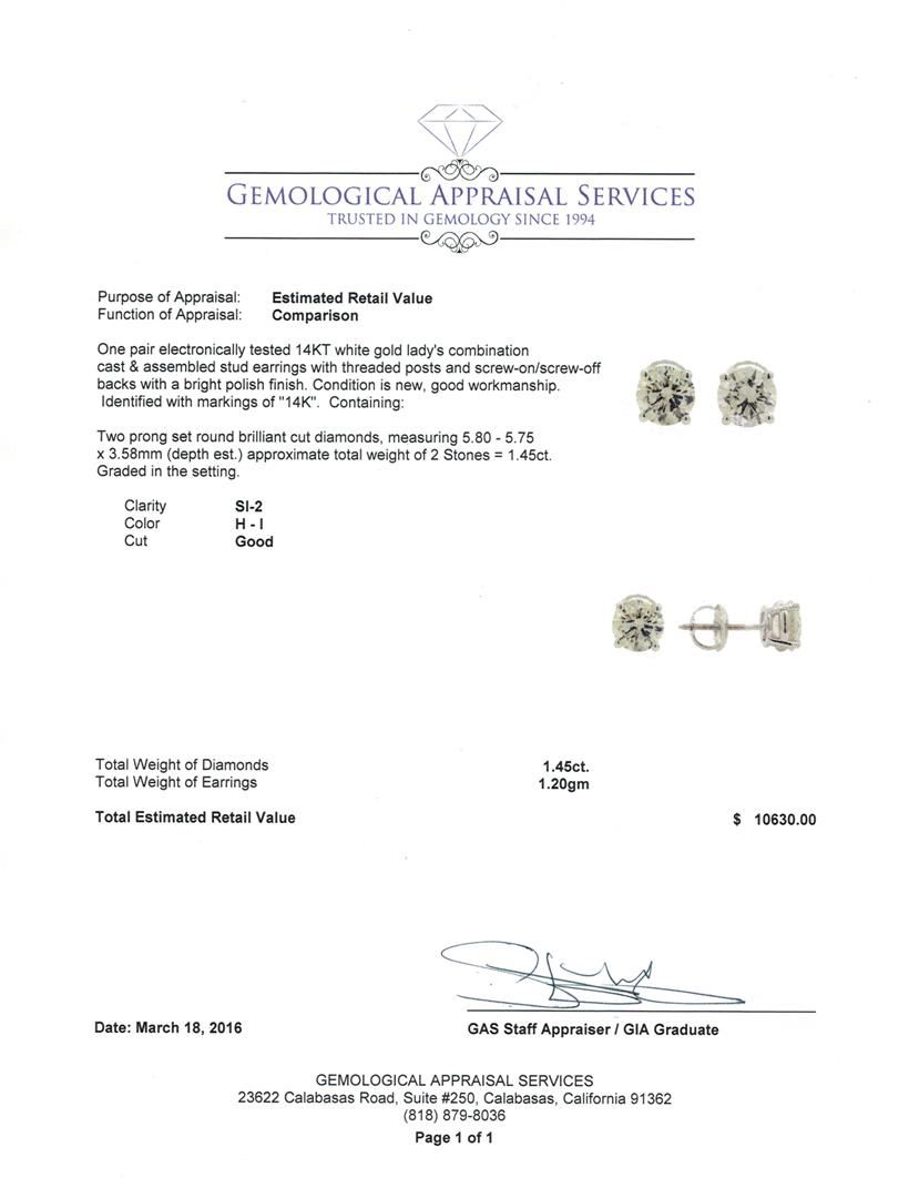 One pair electronically tested 14KT white gold lady's combination cast & assembled stud earrings with threaded posts and screw-on/screw-off backs with a bright polish finish. Identified with markings of "14K". Condition is new, good workmanship. Containing: Two prong set round brilliant cut diamonds, measuring 5.80 - 5.75 x 3.58mm (depth est.) approximate total weight of 2 Stones = 1.45ct. Graded in the setting. Clarity: SI-2. Color: H - I. Cut Good. Total Weight of Diamonds 1.45ct. Total Weight of Earrings 1.20gm. GAS Appraised at $10,630.00.