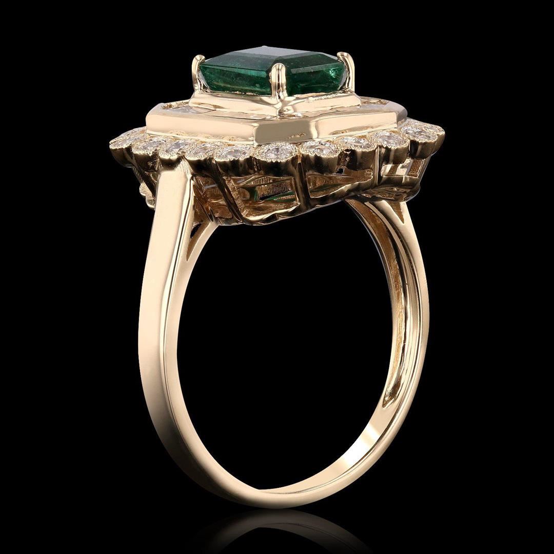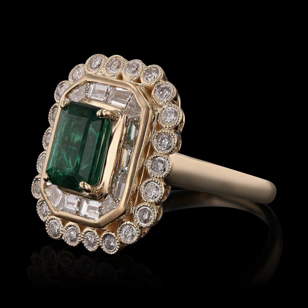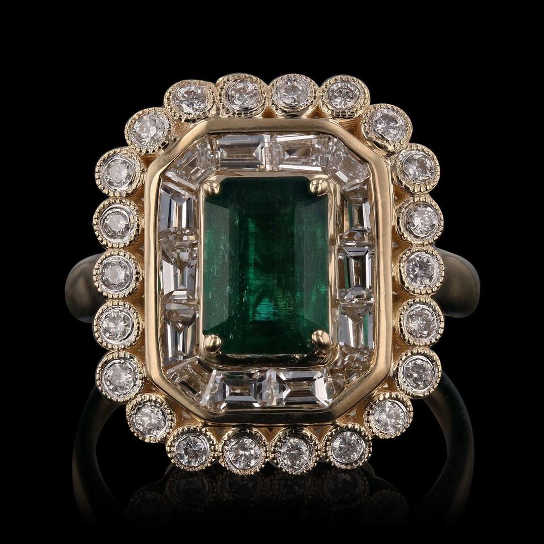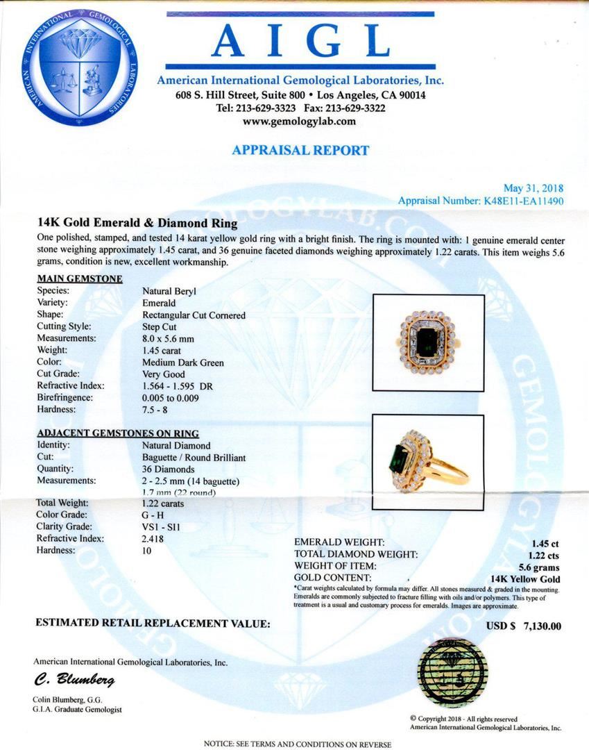 One polished, stamped, and tested 14 karat yellow gold ring with a bright finish. The ring is mounted with: 1 genuine emerald center stone weighing approximately 1.45 carat, and 36 genuine faceted diamonds weighing approximately 1.22 carats. This item weighs 5.6 grams, condition is new, excellent workmanship. MAIN GEMSTONE Species: Natural Beryl Variety: Emerald Shape: Rectangular Cut Cornered Cutting Style: Step Cut Measurements: 8.0 x 5.6 mm Weight: 1.45 carat Color: Medium Dark Green Cut Grade: Very Good Refractive Index: 1.564 - 1.595 DR Birefringence: 0.005 to 0.009 Hardness: 7.5 - 8 ADJACENT GEMSTONES ON RING Identity: Natural Diamond Cut: Baguette / Round Brilliant Quantity: 36 Diamonds Measurements: 2 - 2.5 mm (14 baguette) 1.7 mm (22 round) Total Weight: 1.22 carats Color Grade: G - H Clarity Grade: VS1 â€" SI1 Refractive Index: 2.418 Hardness: 10 EMERALD WEIGHT: 1.45ct TOTAL DIAMOND WEIGHT: 1.22ctw WEIGHT OF ITEM: 5.6 grams GOLD CONTENT: 14K Yellow Gold