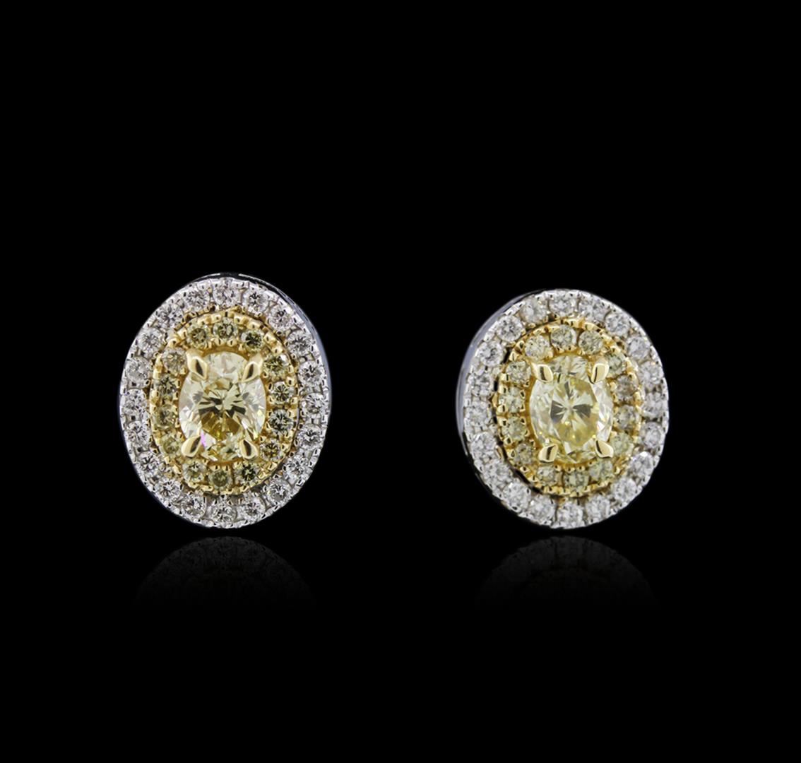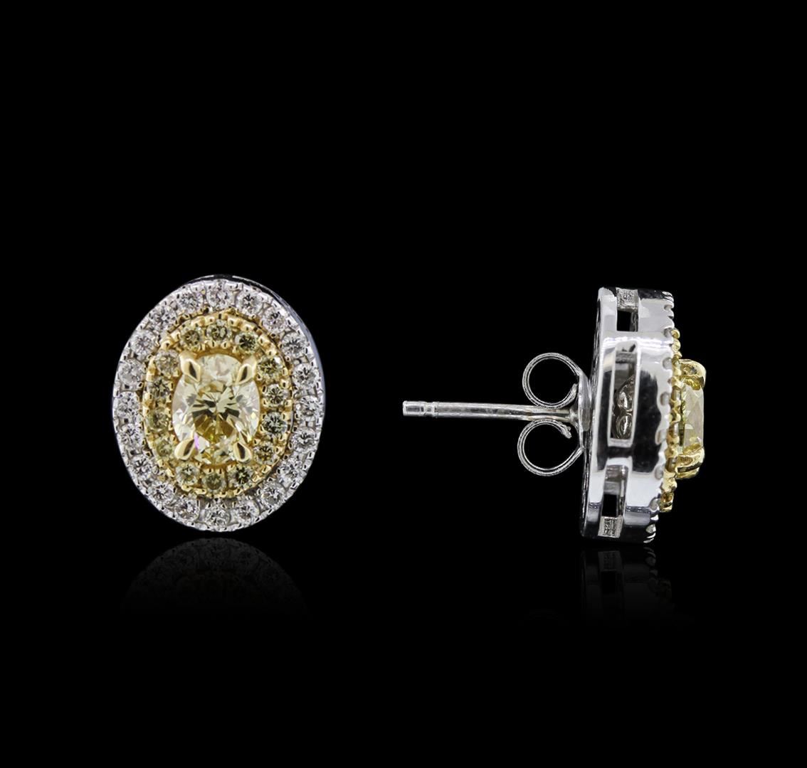 One pair electronically tested 14KT white and yellow gold ladies cast diamond earrings with friction posts with a bright polish finish. Identified with markings of "14K". Condition is new. Containing: Two prong set pear shaped cut diamonds, measuring 5.50 x 4.20 x 2.65mm (depth est.) approximate total weight of 2 Stones = 0.73ct. Clarity: SI-1 to SI-2, color of fancy yellow, cut is Good. Twenty-Eight prong set round brilliant cut diamonds, measuring 1.30 - 1.30 x 0.78mm (depth est.) approximate total weight of 28 Stones = 0.22ct. Clarity: SI-1, color of fancy yellow, cut is Good. Forty prong set round brilliant cut diamonds, measuring 1.50 - 1.50 x 0.90mm (depth est.) approximate total weight of 40 Stones = 0.49ct. Clarity: SI-1 to SI-2. Color: H - I, Cut is Good. Diamonds are graded in the mounting, unless otherwise stated. Total Weight of Diamonds 1.45ct. Total Weight of Earrings 3.40gm. GGL Appraised at $4,330.00.