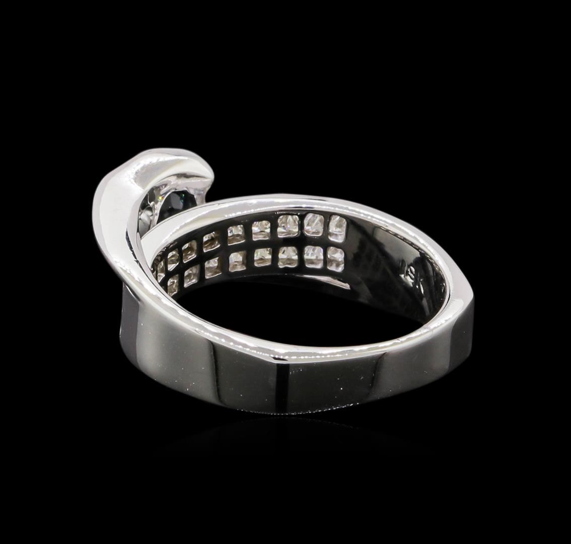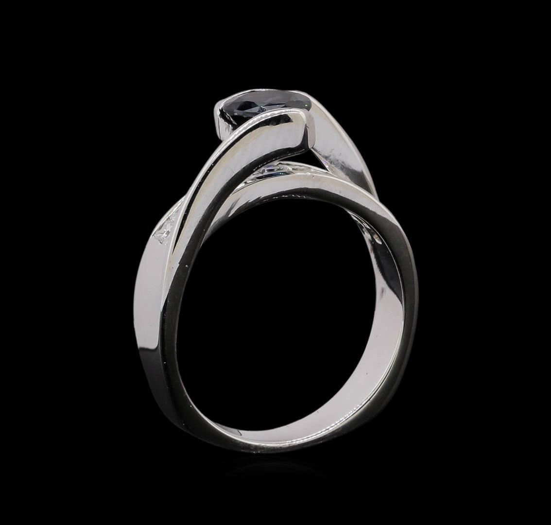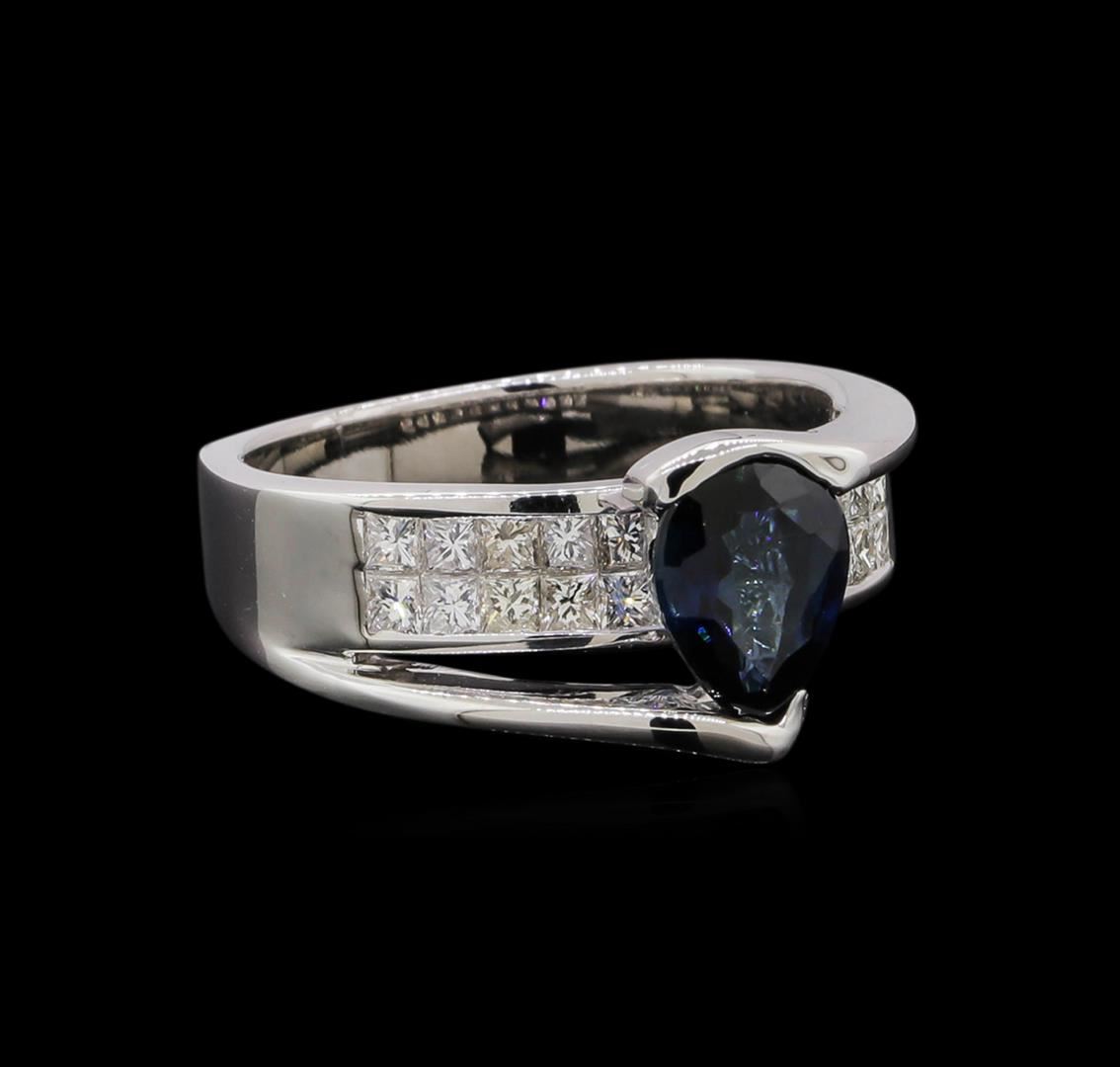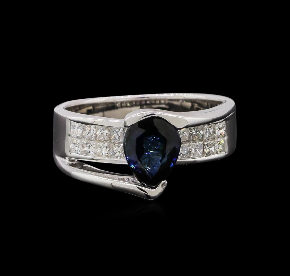 One electronically tested 18KT white gold ladies cast sapphire and diamond ring with a bright polish finish. The featured sapphire is set within a bypass design above a diamond gallery supported by tapering shoulders, completed by a three and one-half millimeter wide European style band. Identified with markings of '18K'. Condition is new, good workmanship. Containing: One prong set pear mixed cut natural blue sapphire, measuring 8.10 x 6.20 x 3.60mm, approximate weight of 1.45ct., clarity is eye clean, type II, dark, very slightly grayish, blue color, (GIA B 7/3), cut is good. Transmitting light with no distortion, transparent. Graded in the setting. Twenty-Two invisible set princess cut diamonds, measuring 1.90 x 1.80 x 1.35mm (depth est.) approximate total weight of 22 Stones = 0.88ct. Graded in the setting. Clarity VS-1 to SI-1. Color: F - H. Total Weight of Colored Stones 1.45ct.. Total Weight of Diamonds 0.88ct.. Total Weight of Ring 7.14gm. AIG Appraised at $5,232.00.