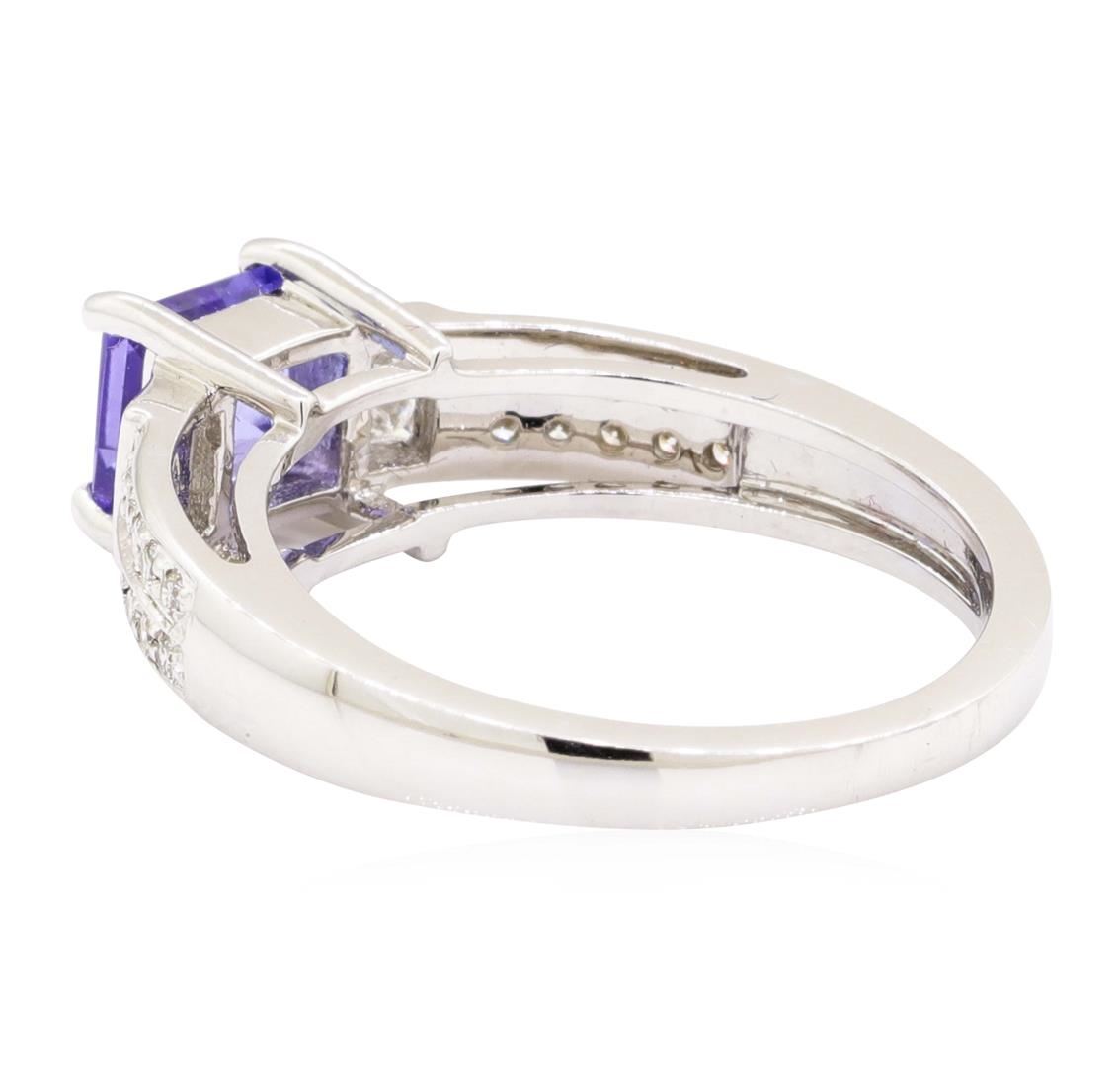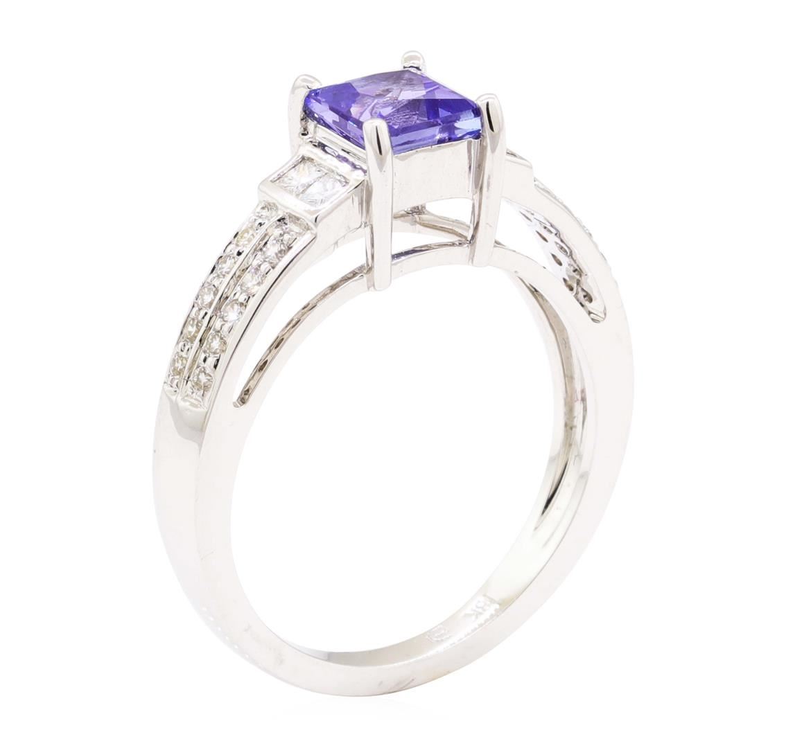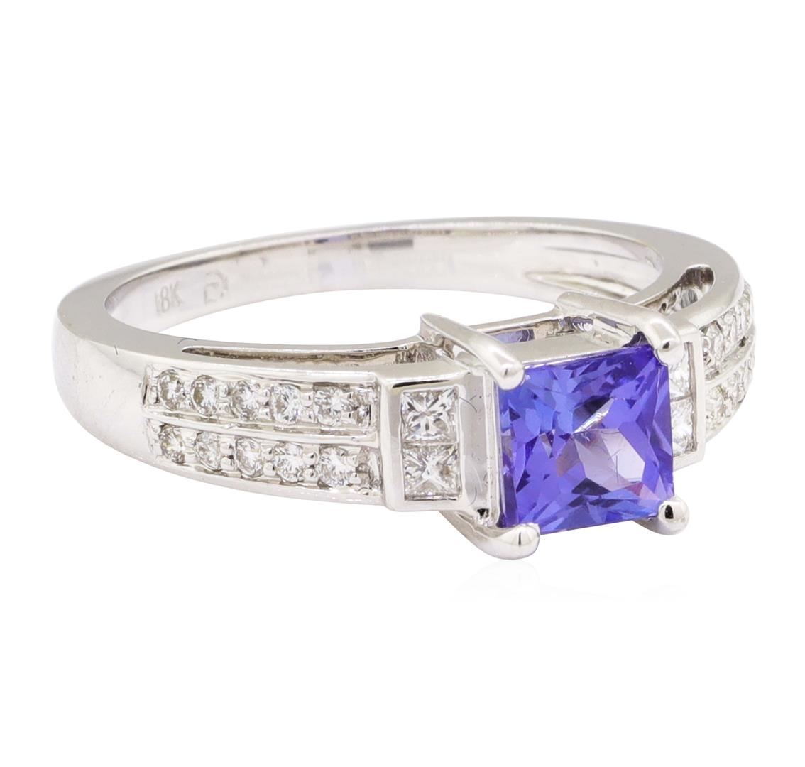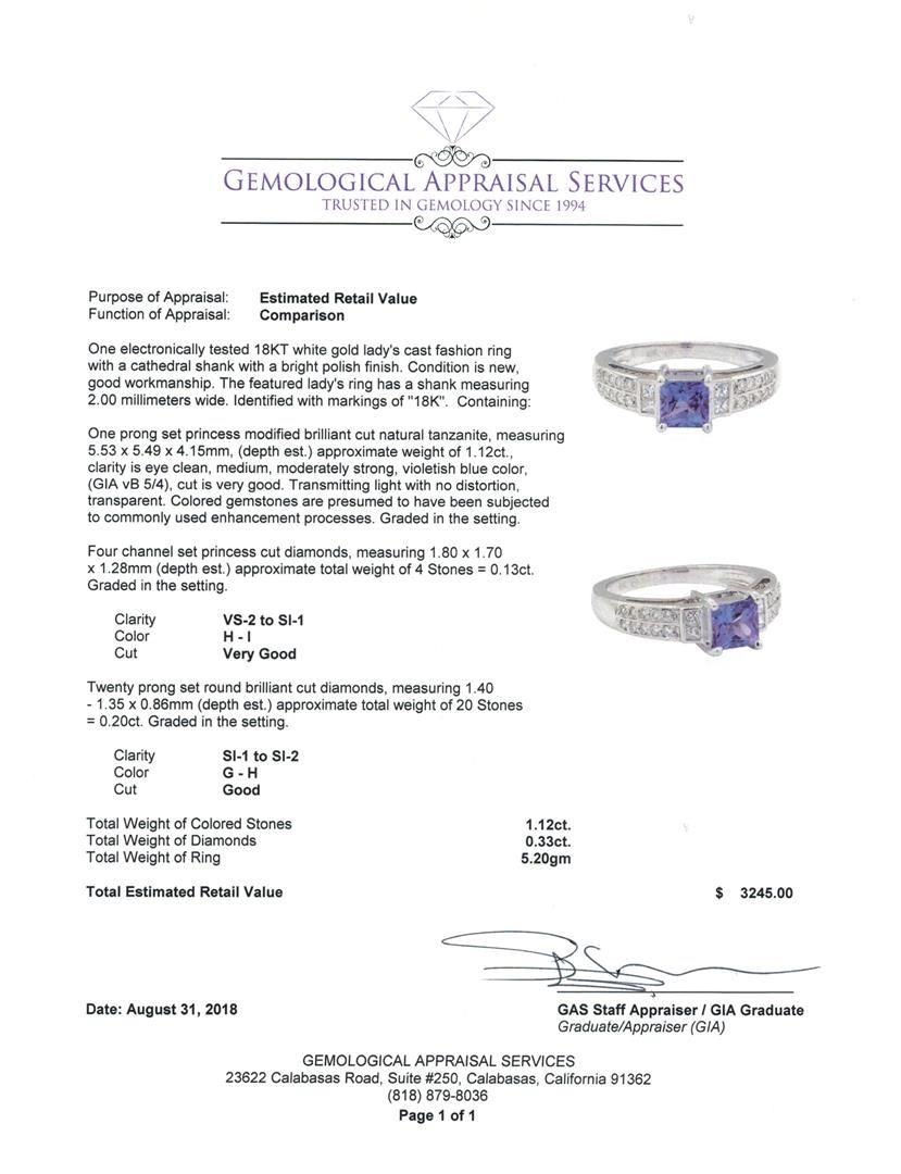 One electronically tested 18KT white gold lady's cast fashion ring with a cathedral shank with a bright polish finish. The featured lady's ring has a shank measuring 2.00 millimeters wide. Identified with markings of '18K'. Condition is new, good workmanship. Containing: One prong set princess modified brilliant cut natural tanzanite, measuring 5.53 x 5.49 x 4.15mm, (depth est.) approximate weight of 1.12ct., clarity is eye clean, medium, moderately strong, violetish blue color, (GIA vB 5/4), cut is very good. Transmitting light with no distortion, transparent. Colored gemstones are presumed to have been subjected to commonly used enhancement processes. Graded in the setting. Four channel set princess cut diamonds, measuring 1.80 x 1.70 x 1.28mm (depth est.) approximate total weight of 4 Stones = 0.13ct. Graded in the setting. Color H - I Clarity VS-2 to SI-1 Cut Very Good Twenty prong set round brilliant cut diamonds, measuring 1.40 - 1.35 x 0.86mm (depth est.) approximate total weight of 20 Stones = 0.20ct. Graded in the setting. Color G - H Clarity SI-1 to SI-2 Cut Good. Total Weight of Colored Stones 1.12ct.. Total Weight of Diamonds 0.33ct.. Total Weight of Ring 5.20gm GAS Appraised at $3245.00. GAS Appraised at $3,245.00.