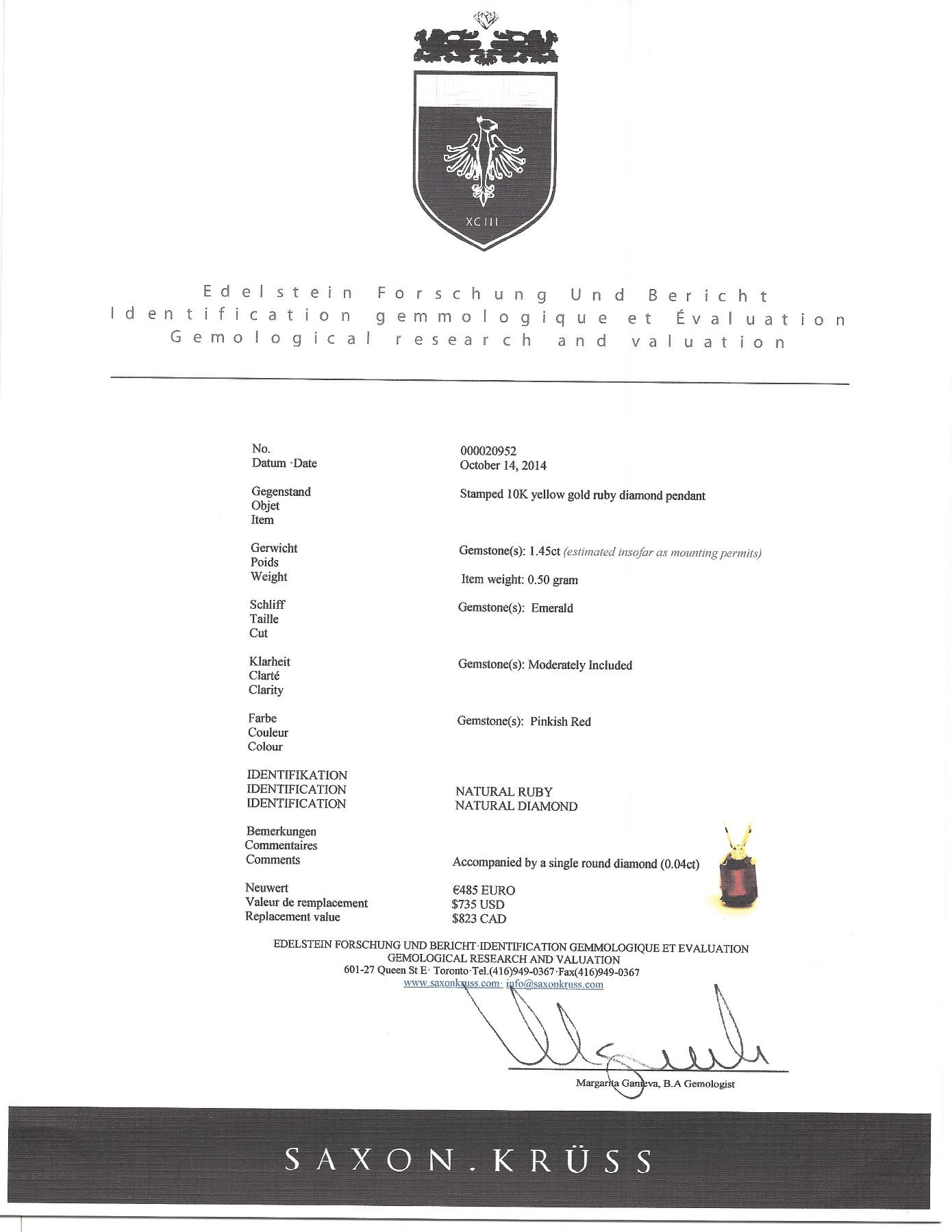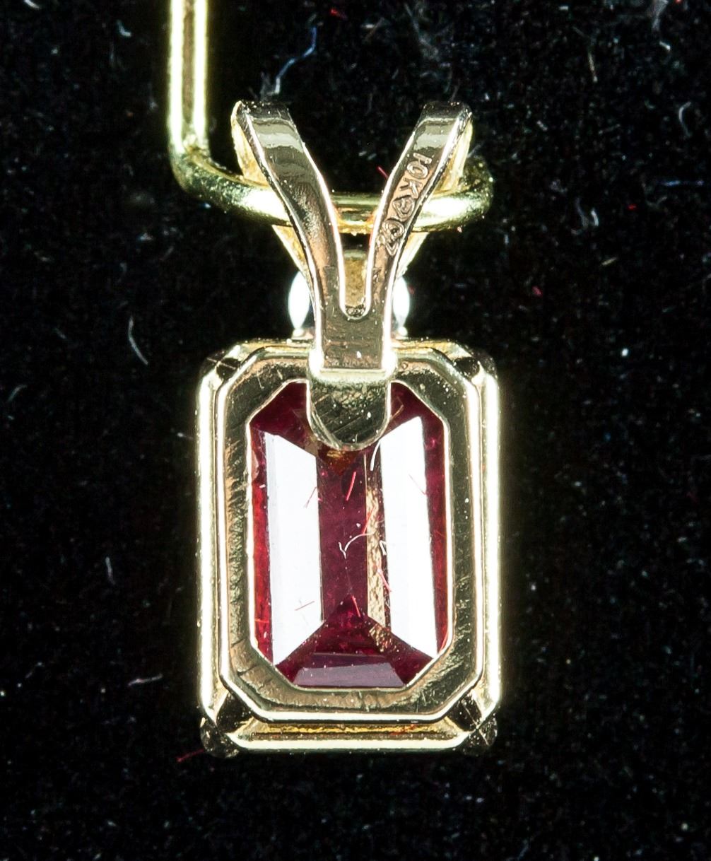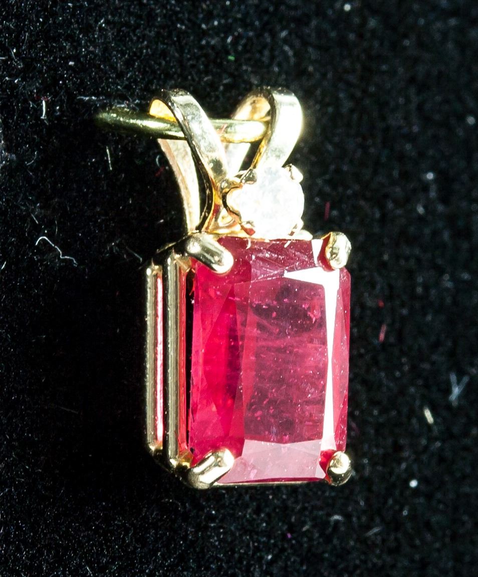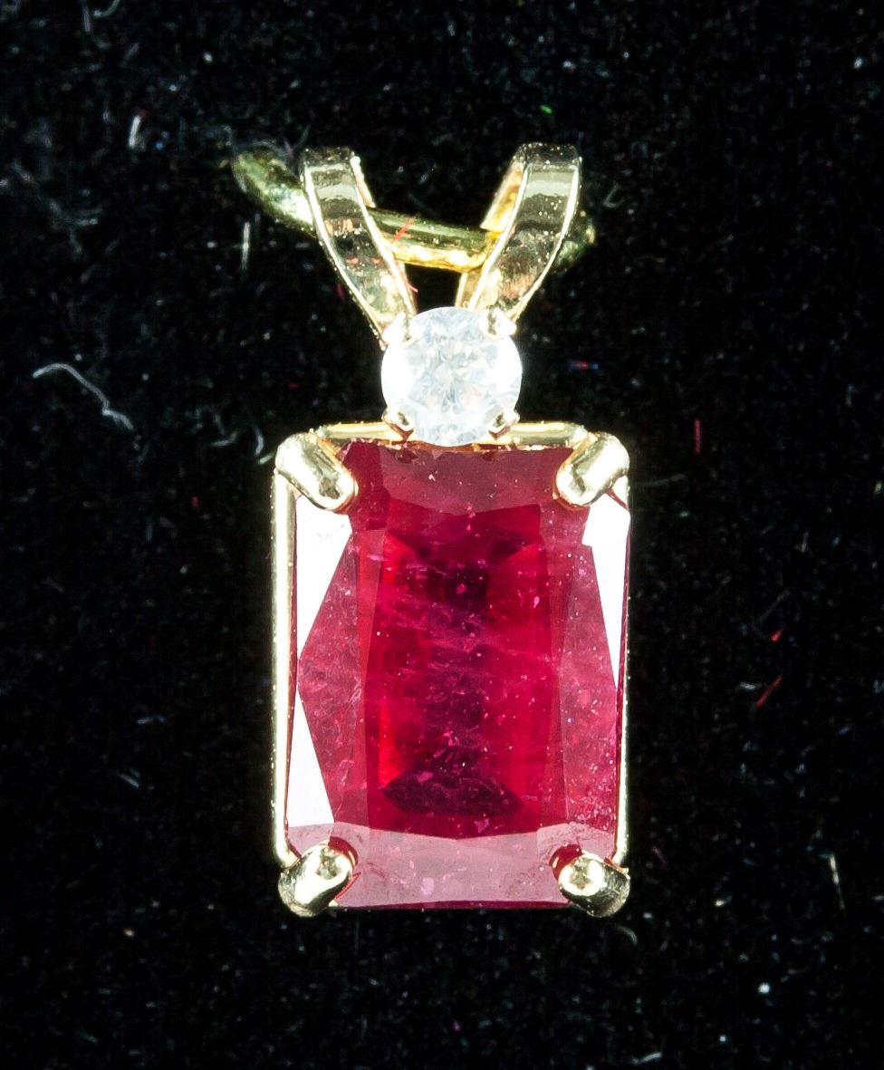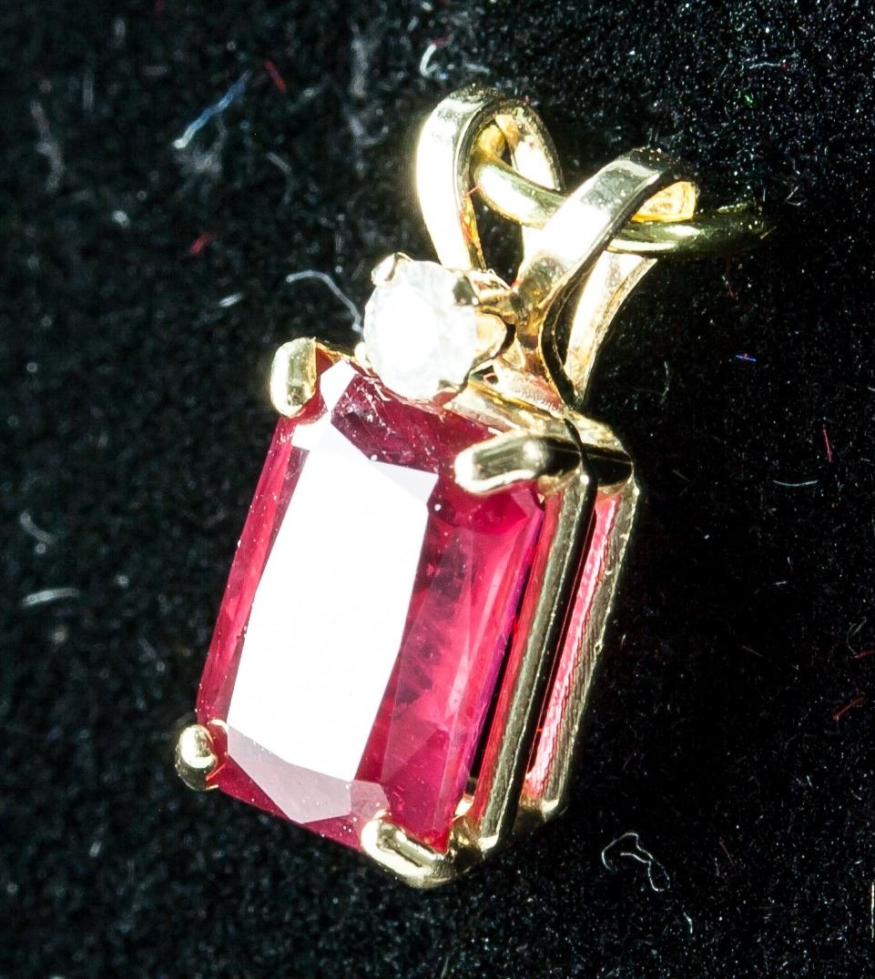 Stamped 10k yellow gold pendant, set with 1.45ct emerald cut, moderately included pinkish red ruby with 0.04ct single round cut diamond. Certified replacement value $823. 0.50 grams.