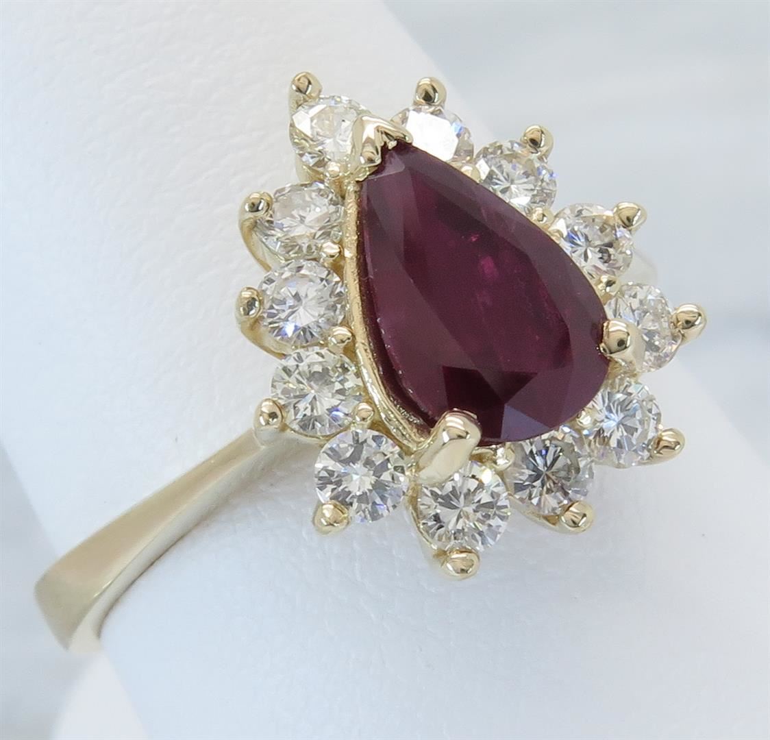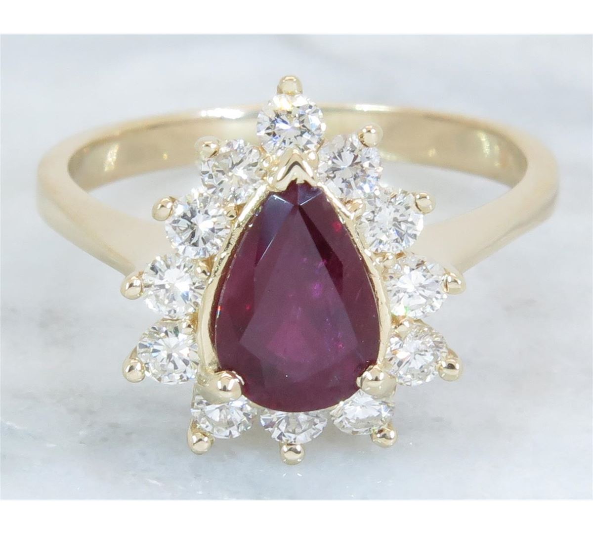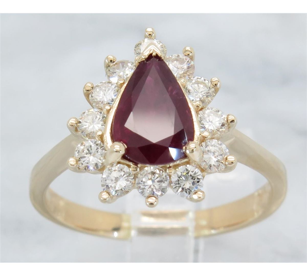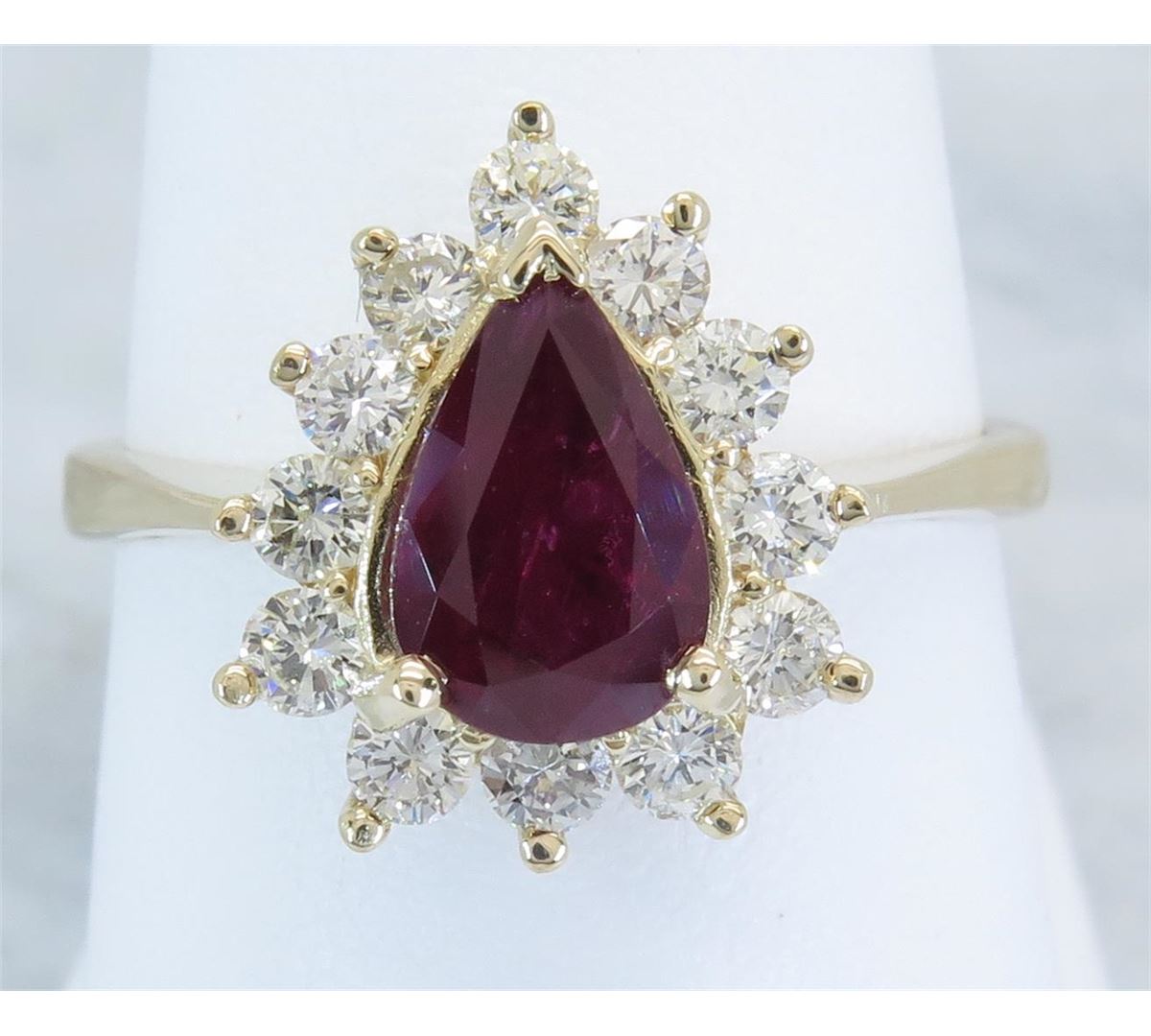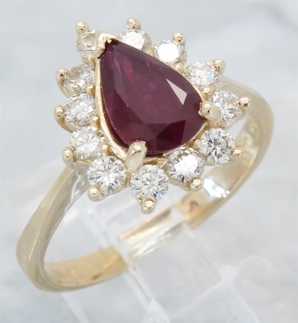 One tested 14K yellow gold diamond and ruby ring. Containing: One 8.5MM X 5.8MM 1.45CT ruby, 12 Round Brilliant Cut Diamonds. Approximate total diamond weight: .60CTW. Diamonds are graded in the mounting, unless otherwise stated. Weight: 3.9 grams, Size: 7.0.