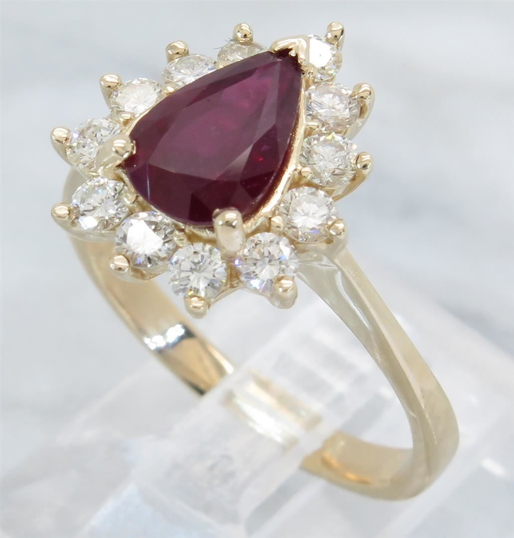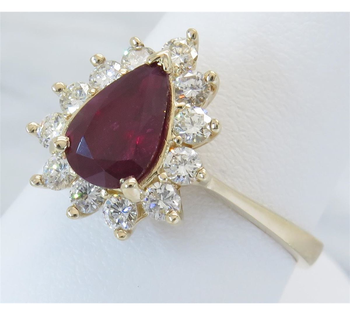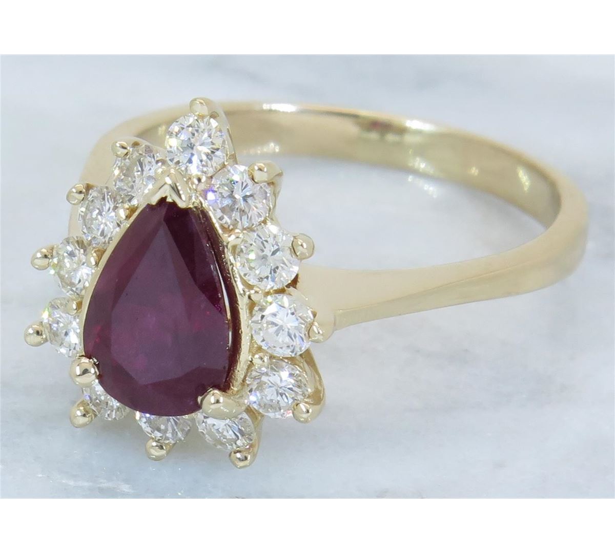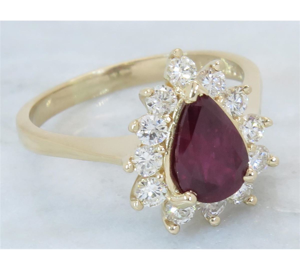 One tested 14K yellow gold diamond and ruby ring. Containing: One 8.5MM X 5.8MM 1.45CT ruby, 12 Round Brilliant Cut Diamonds. Approximate total diamond weight: .60CTW. Diamonds are graded in the mounting, unless otherwise stated. Weight: 3.9 grams, Size: 7.0.