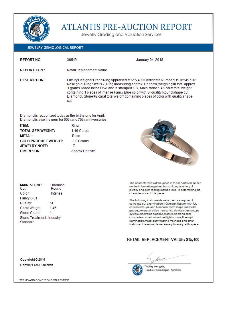 REF-210M2H -36549 ---- 1.46 CTW Certified Intense Blue SI Diamond Solitaire Engagement Ring 10K Rose Gold ---- Luxury Designer Brand Ring Appraised at $15,400 Certificate Number US36549 10k Rose gold, Ring Size is 7, Ring measuring approx. Uniform, weighing in total approx. 3 grams. Made in the USA and is stamped 10k, Main stone 1.46 carat total weight containing 1 pieces of Intense Fancy Blue color with SI quality Round shape cut Diamond , Stone #2 carat total weight containing pieces of color with quality shape cut
