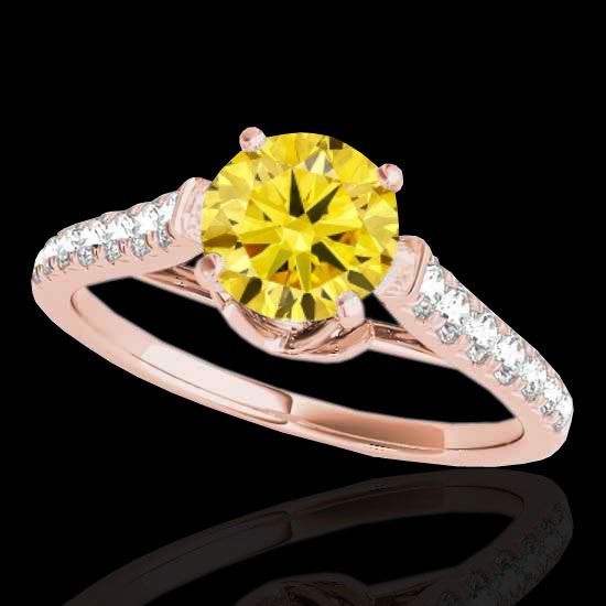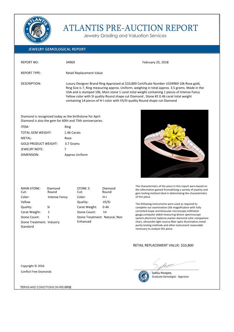 REF-163K6W -34969 ---- 1.46 CTW Certified Si/I Fancy Intense Yellow Diamond Solitaire Ring 10K Rose Gold ---- Luxury Designer Brand Ring Appraised at $10,800 Certificate Number US34969 10k Rose gold, Ring Size is 7, Ring measuring approx. Uniform, weighing in total approx. 3.5 grams. Made in the USA and is stamped 10k, Main stone 1 carat total weight containing 1 pieces of Intense Fancy Yellow color with SI quality Round shape cut Diamond , Stone #2 0.46 carat total weight containing 14 pieces of H-I color with VS/SI quality Round shape cut Diamond