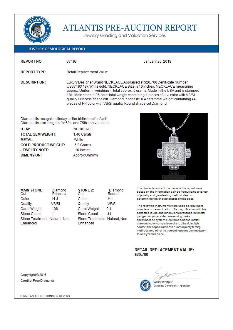 REF-418W2F -37193 ---- 1.46 CTW Princess VS/SI Diamond Solitaire Micro Pave Necklace 18K White Gold ---- Luxury Designer Brand NECKLACE Appraised at $20,700 Certificate Number US37193 18k White gold, NECKLACE Size is 16 Inches, NECKLACE measuring approx. Uniform, weighing in total approx. 5 grams. Made in the USA and is stamped 18k, Main stone 1.06 carat total weight containing 1 pieces of H-J color with VS/SI quality Princess shape cut Diamond , Stone #2 0.4 carat total weight containing 44 pieces of H-I color with VS/SI quality Round shape cut Diamond