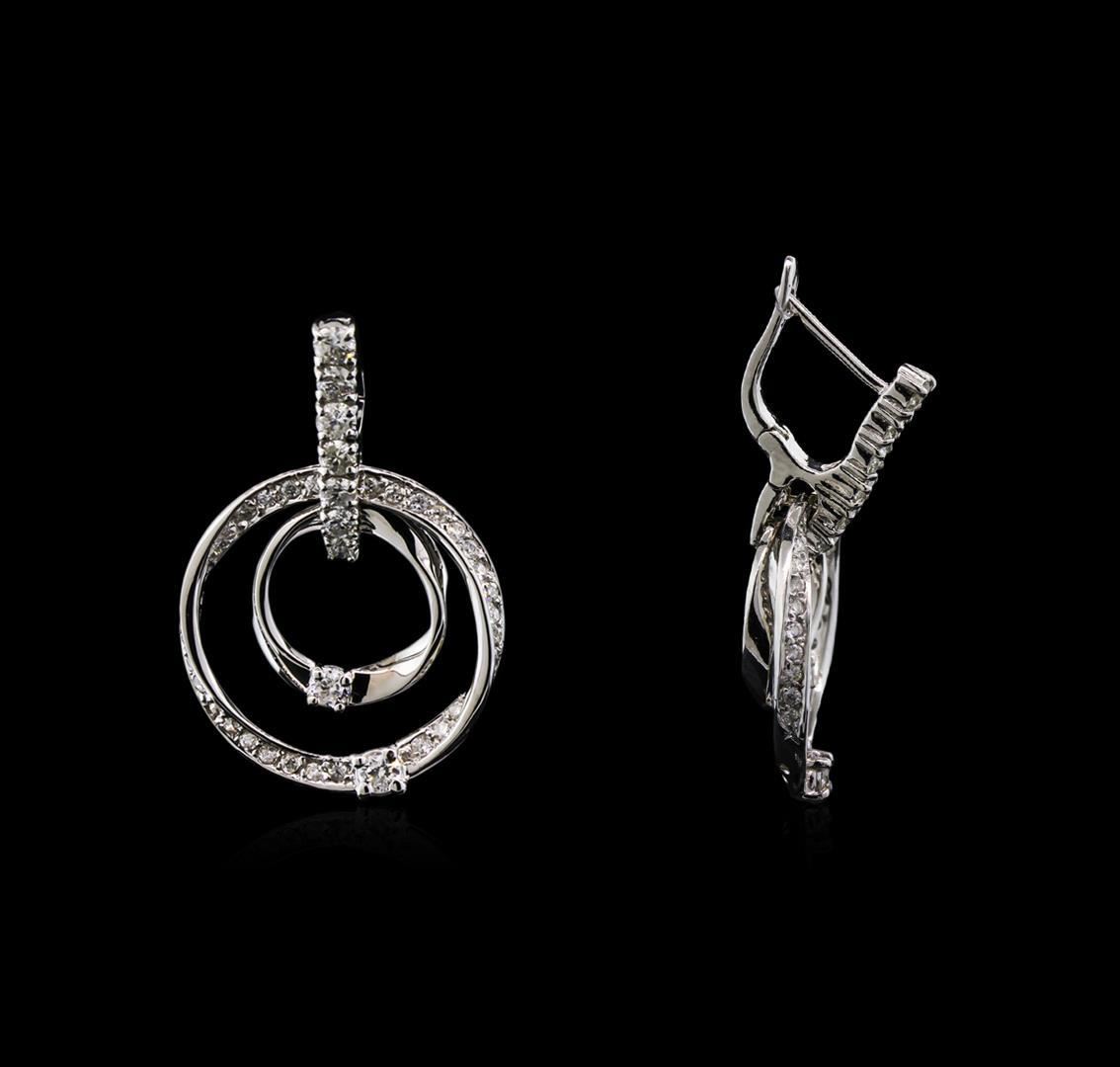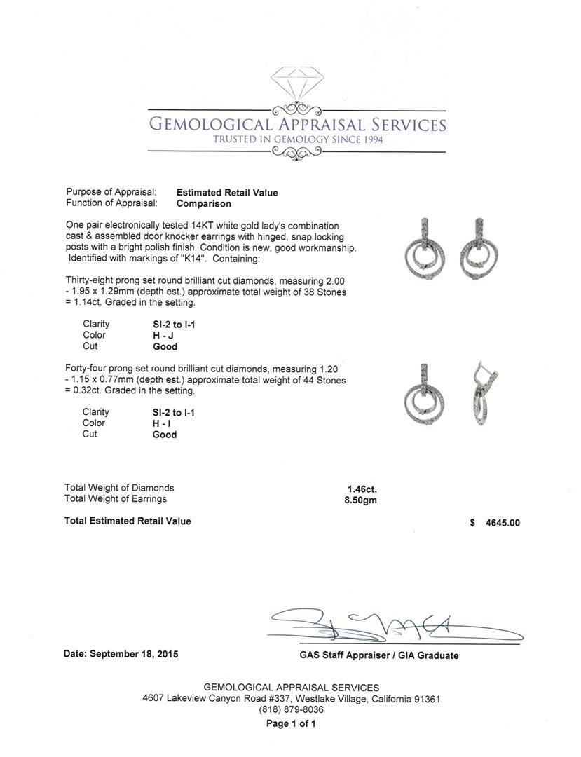 One pair electronically tested 14KT white gold lady's combination cast & assembled door knocker earrings with hinged, snap locking posts with a bright polish finish. Identified with markings of "K14". Condition is new, good workmanship. Containing: Thirty-Eight prong set round brilliant cut diamonds, measuring 2.00 - 1.95 x 1.29mm (depth est.) approximate total weight of 38 Stones = 1.14ct. Graded in the setting. Clarity: SI-2 to I-1. Color: H - Good Forty-Four prong set round brilliant cut diamonds, measuring 1.20 - 1.15 x 0.77mm (depth est.) approximate total weight of 44 Stones = 0.32ct. Graded in the setting. Clarity: SI-2 to I-1. Color: H - I. Cut Good. Total Weight of Diamonds 1.46ct. Total Weight of Earrings 8.50gm. GAS Appraised.