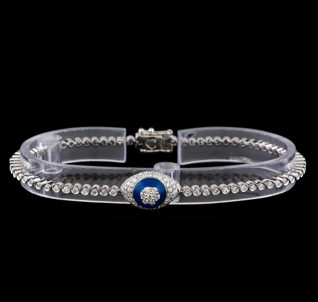 One electronically tested 14KT white gold ladies cast & assembled diamond bracelet. Seven and one-half inch length bracelet features a blue enamel and diamond encrusted "evil eye" center supported by a flexible diamond ribbon, terminating in a concealed clasp with twin safeties. Bright polish finish. Indenting with markings of "14KT 585".The "evil eye" is thought to be a good luck charm by reflecting evil. It is believed to guard against misfortune by keeping one's life in balance. Condition is new, good workmanship. Containing: Seventy-Nine prong & bezel set round brilliant cut diamonds, measuring 1.70 - 1.50 x 0.96mm (depth est.) approximate total weight of 79 Stones = 1.18ct. Graded in the setting. Clarity: I-1 to I-2. Color: F - H Fifty-Eight prong set round brilliant cut diamonds, measuring 1.20 - 1.00 x 0.66mm (depth est.) approximate total weight of 58 Stones = 0.28ct. Graded in the setting. Clarity: I-1 to I-2. Color: F - H. Total Weight of Diamonds 1.46ct. Total Weight of Bracelet 10.01gm. AIG Appraised.