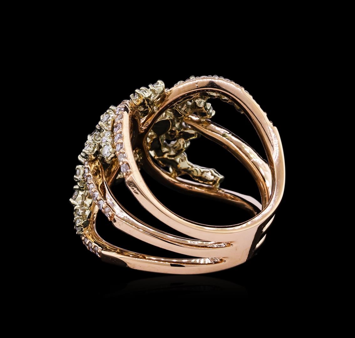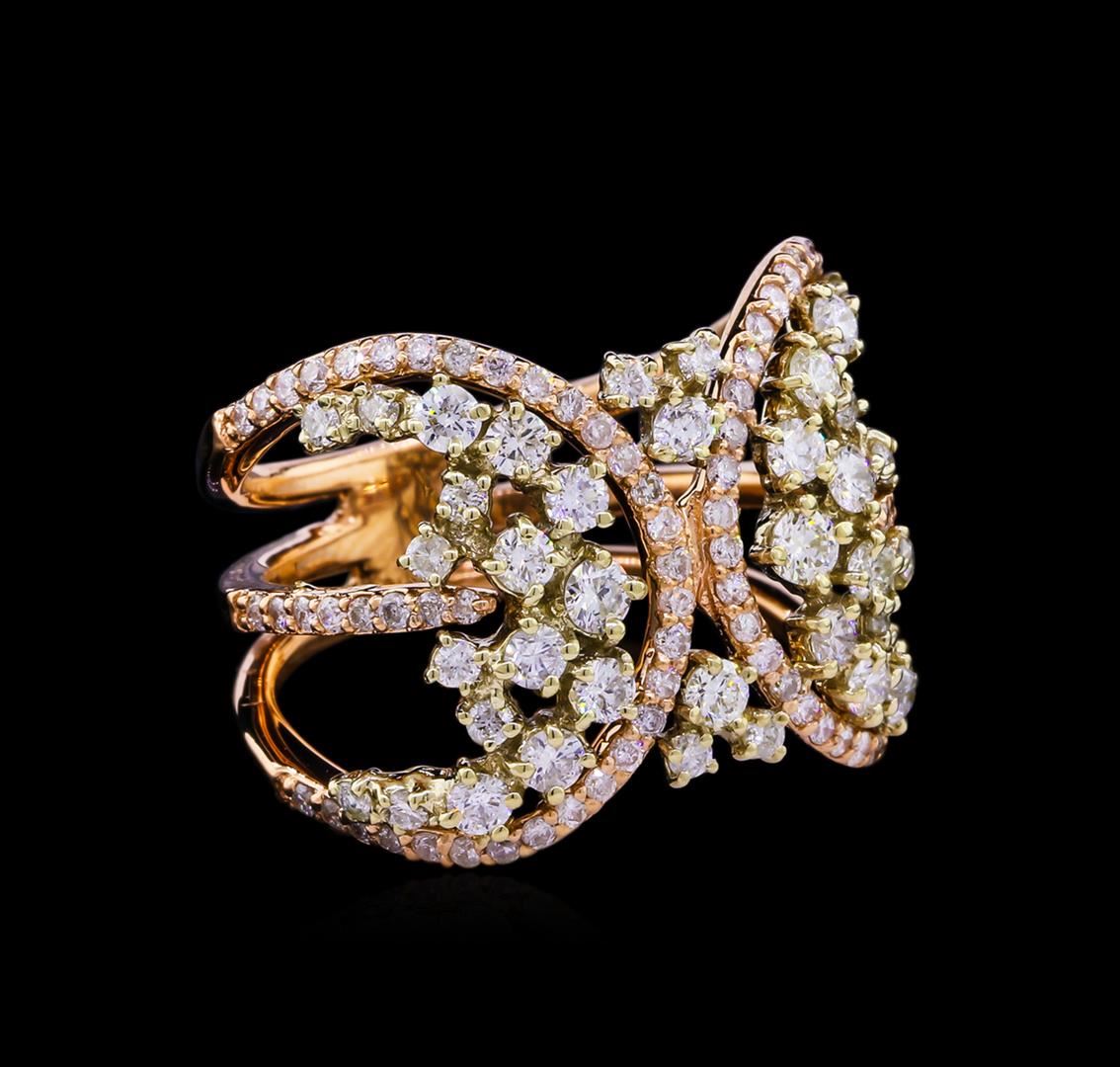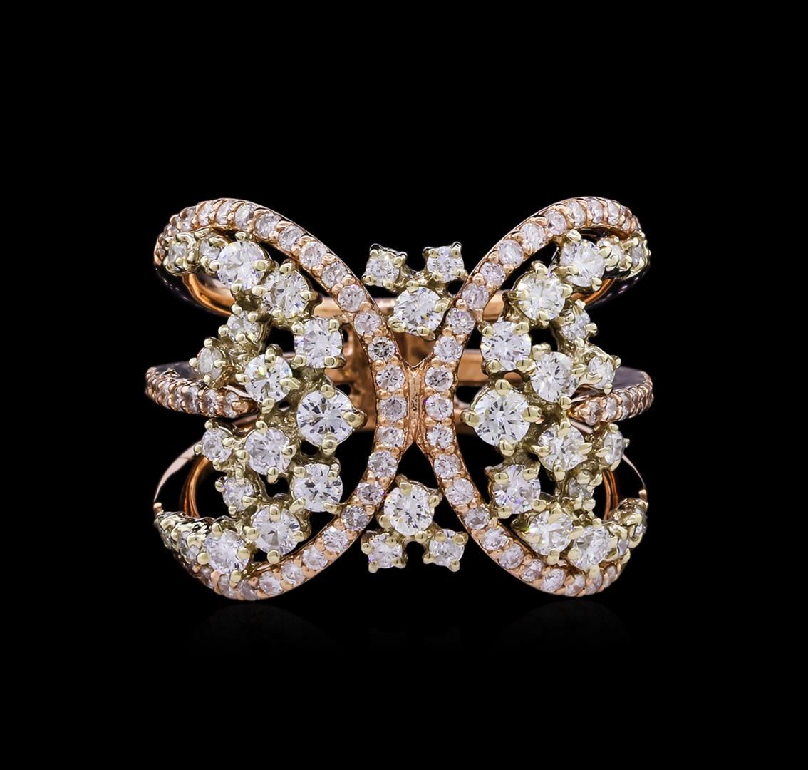 One electronically tested 14KT yellow and rose gold lady's cast fashion ring with a split shank with a bright polish finish. The featured lady's ring has a wide band split shank cluster motif with the shank measuring 5.82 millimeters wide. Identified with markings of "14K". Condition is new, good workmanship. Containing: Two prong set round brilliant cut diamonds, measuring 2.45 - 2.40 x 1.46mm (depth est.) approximate total weight of 2 Stones = 0.10ct. Graded in the setting. Clarity: VS-2 to SI-1. Color: G - Good Eighteen prong set round brilliant cut diamonds, measuring 2.10 - 2.00 x 1.29mm (depth est.) approximate total weight of 18 Stones = 0.60ct. Graded in the setting. Clarity: VS-2 to SI-1. Color: H - I. Cut Good Twenty prong set round brilliant cut diamonds, measuring 1.50 - 1.45 x 0.90mm (depth est.) approximate total weight of 20 Stones = 0.24ct. Graded in the setting. Clarity: SI-1 to SI-2. Color: H - I. Cut Good Seventy-Eight prong set round brilliant cut diamonds, measuring 1.25 - 1.20 x 0.74mm (depth est.) approximate total weight of 78 Stones = 0.52ct. Graded in the setting. Clarity: SI-1 to I-1. Color: G - Good. Total Weight of Diamonds 1.46ct. Total Weight of Ring 6.50gm. GAS Appraised at $5,105.00.