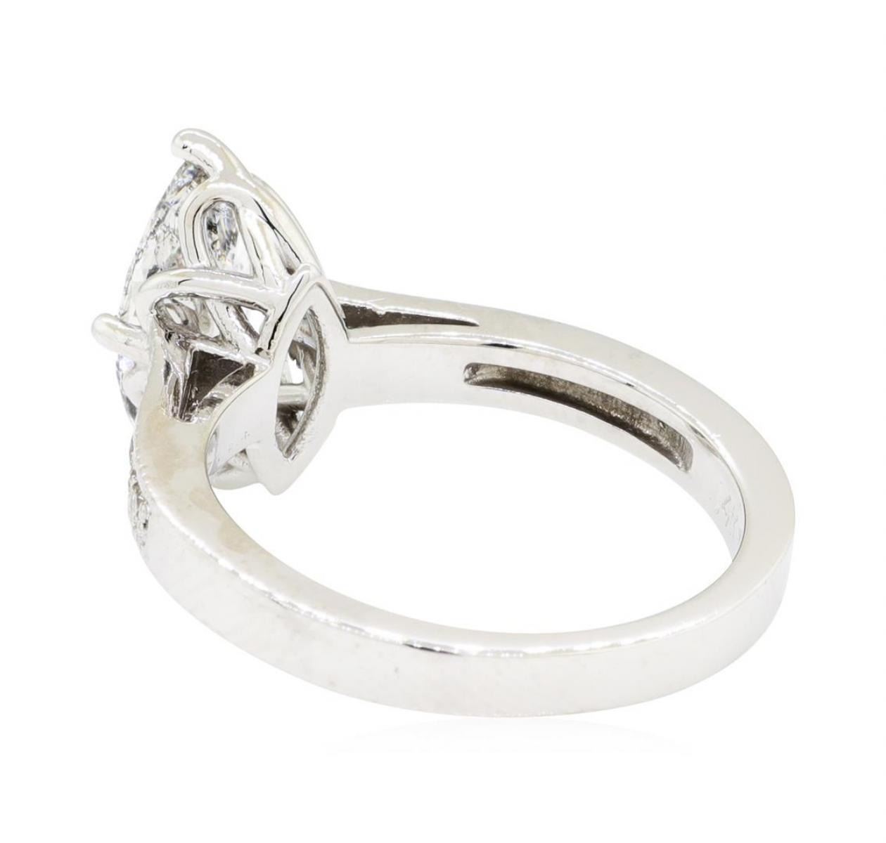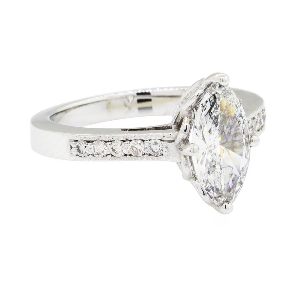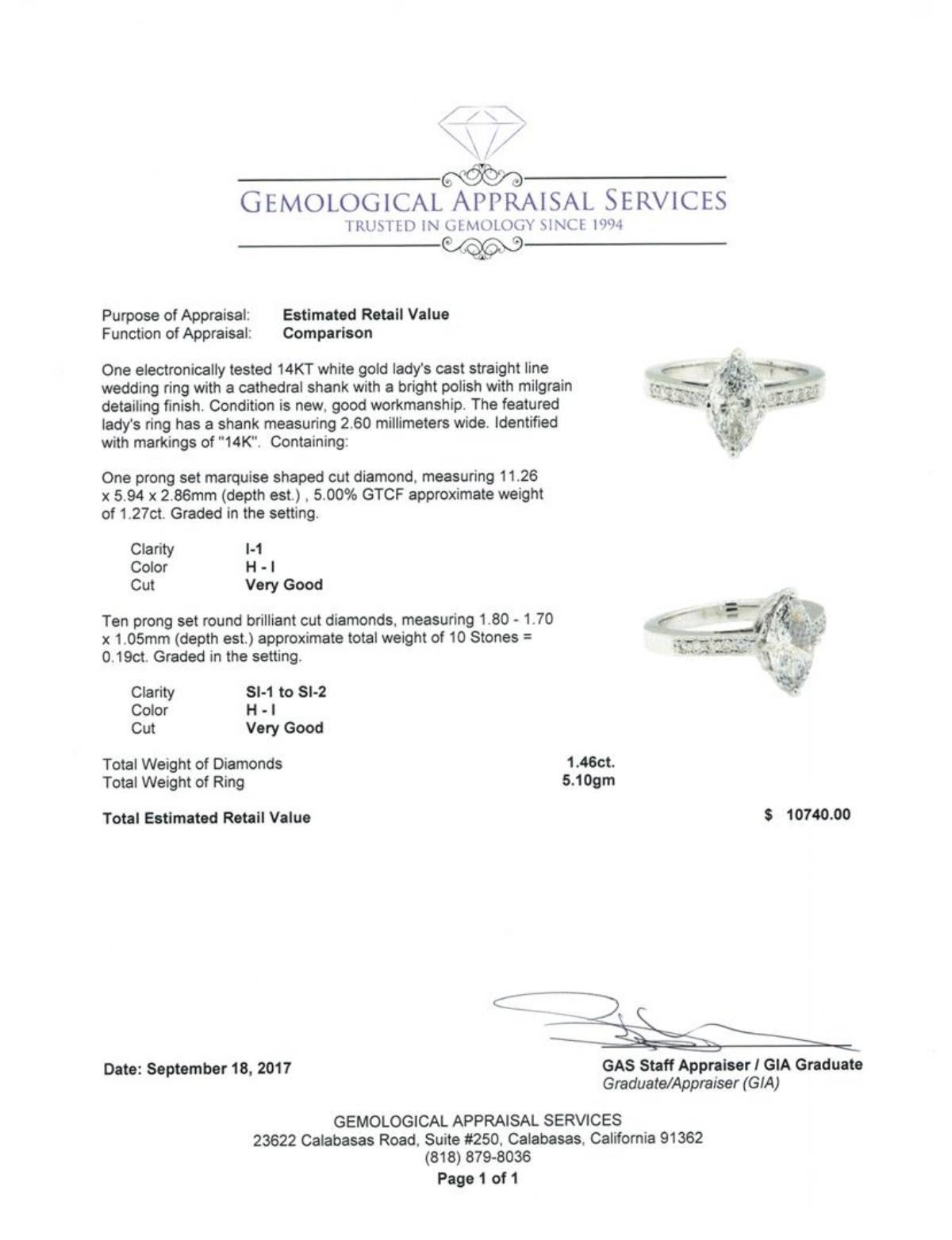 One electronically tested 14KT white gold lady's cast straight line wedding ring with a cathedral shank with a bright polish with milgrain detailing finish. The featured lady's ring has a shank measuring 2.60 millimeters wide. Identified with markings of '14K'. Condition is new, good workmanship. Containing: One prong set marquise shaped cut diamond, measuring 11.26 x 5.94 x 2.86mm (depth est.) , 5.00.%. GTCF approximate weight of 1.27ct. Graded in the setting. Color H - I Clarity I-1 Cut Very Good Ten prong set round brilliant cut diamonds, measuring 1.80 - 1.70 x 1.05mm (depth est.) approximate total weight of 10 Stones = 0.19ct. Graded in the setting. Color H - I Clarity SI-1 to SI-2 Cut Very Good. Total Weight of Diamonds 1.46ct.. Total Weight of Ring 5.10gm GAS Appraised at  $10740.00. GAS Appraised.