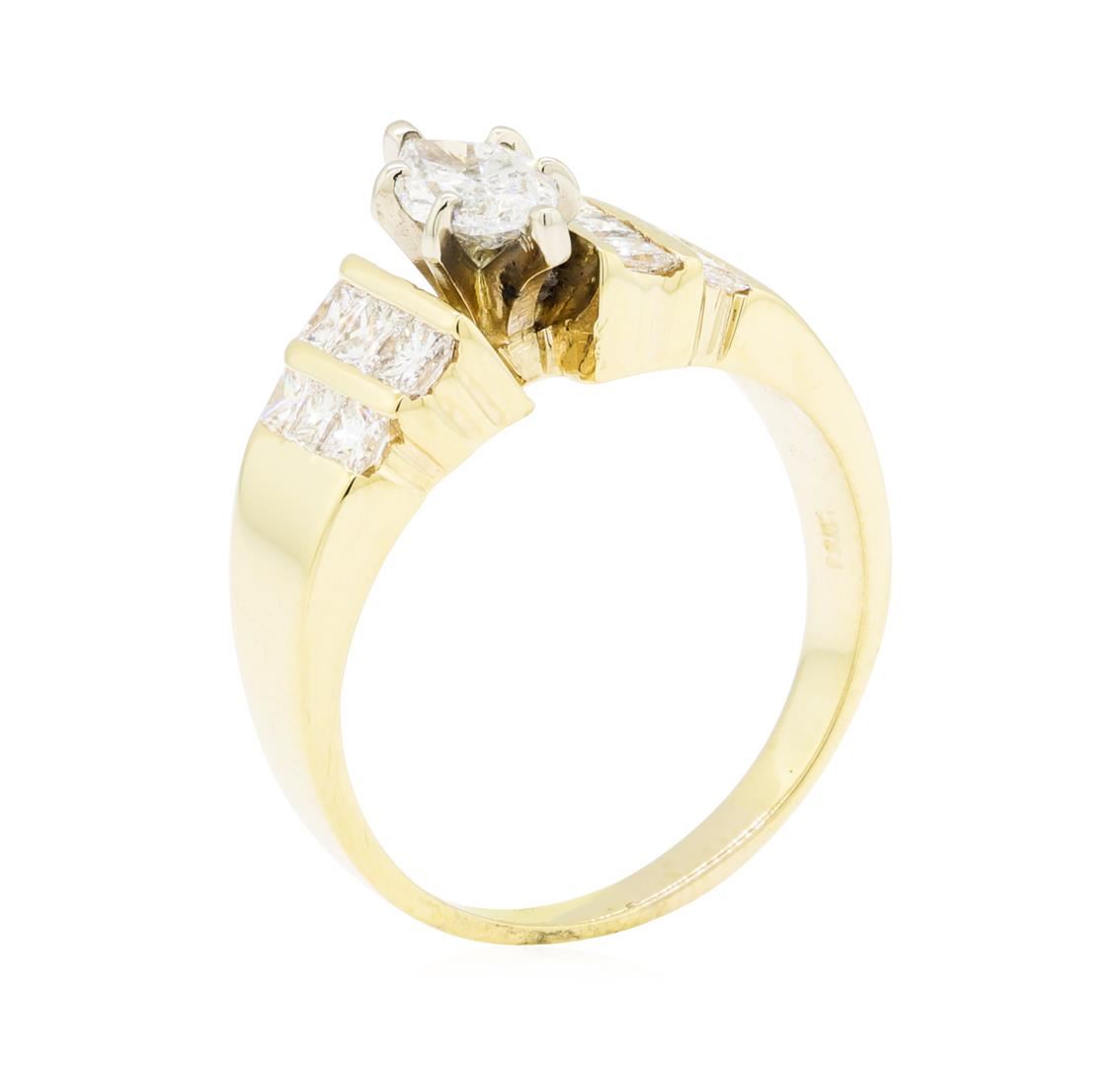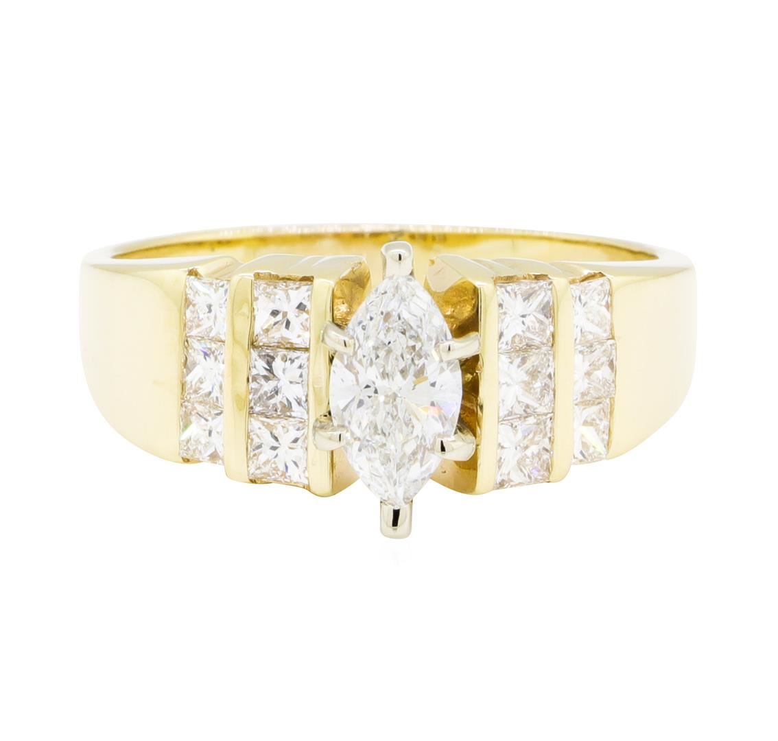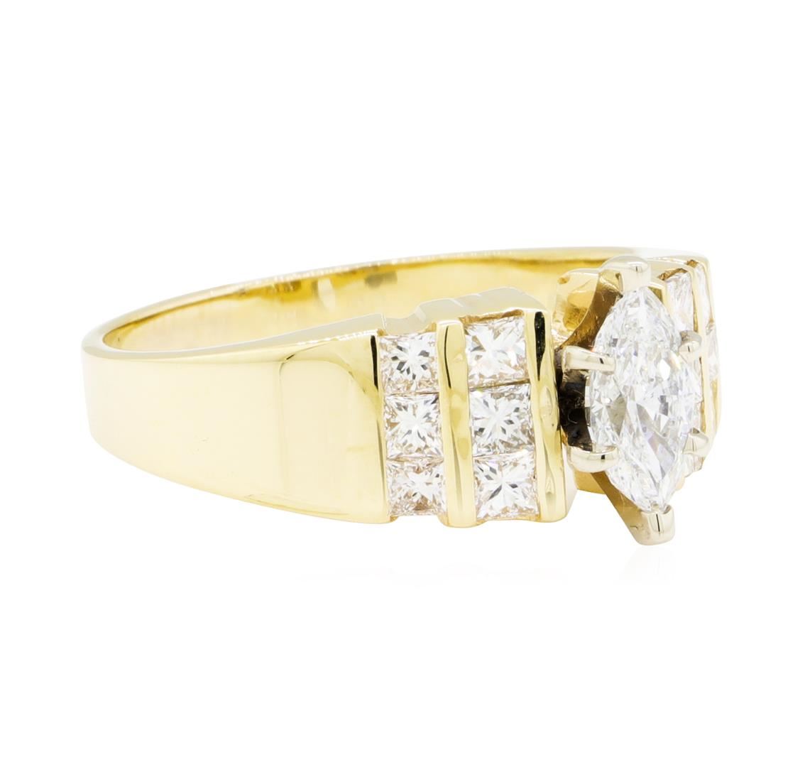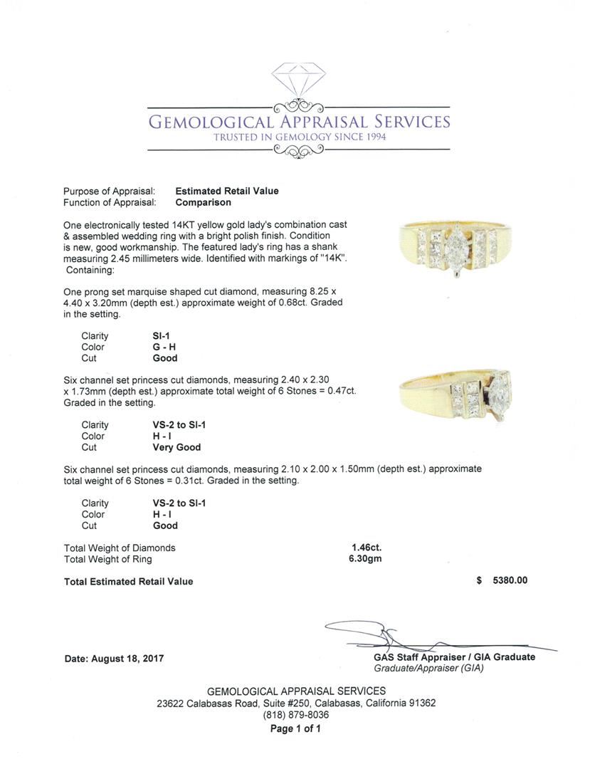 One electronically tested 14KT yellow gold lady's combination cast & assembled wedding ring with a bright polish finish. The featured lady's ring has a shank measuring 2.45 millimeters wide. Identified with markings of '14K'. Condition is new, good workmanship. Containing: One prong set marquise shaped cut diamond, measuring 8.25 x 4.40 x 3.20mm (depth est.) approximate weight of 0.68ct. Graded in the setting. Color G - H Clarity SI-1 Cut Good Six channel set princess cut diamonds, measuring 2.40 x 2.30 x 1.73mm (depth est.) approximate total weight of 6 Stones = 0.47ct. Graded in the setting. Color H - I Clarity VS-2 to SI-1 Cut Very Good Six channel set princess cut diamonds, measuring 2.10 x 2.00 x 1.50mm (depth est.) approximate total weight of 6 Stones = 0.31ct. Graded in the setting. Color H - I Clarity VS-2 to SI-1 Cut Good. Total Weight of Diamonds 1.46ct.. Total Weight of Ring 6.30gm GAS Appraised at $5380.00. GAS Appraised at $5,380.00.
