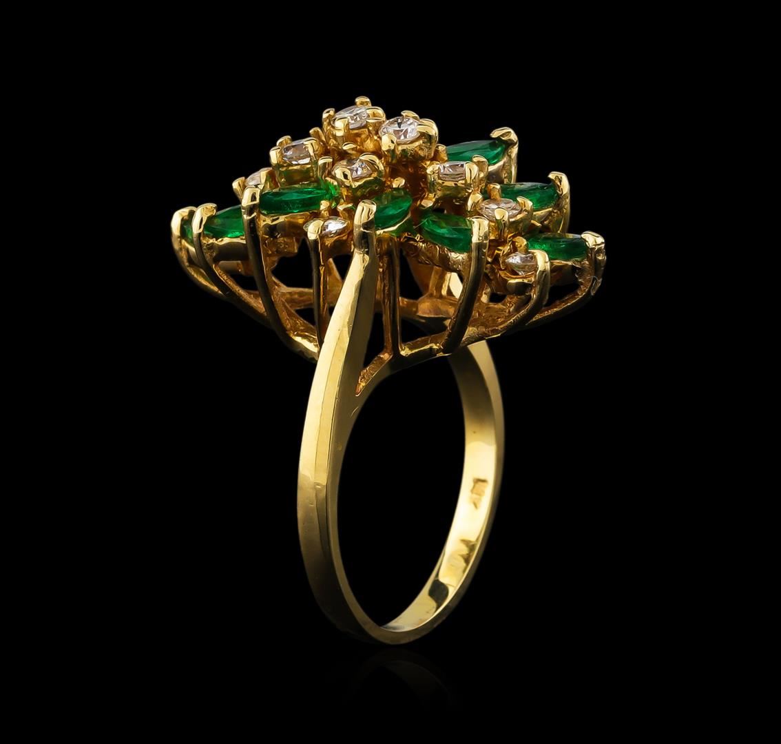 One electronically tested 14KT yellow gold lady's cast fashion ring with a basket halo with a bright polish finish. The featured lady's ring has a shank measuring 2.04 millimeters wide. Identified with markings of "14K". Condition is new, good workmanship. Containing: Ten prong set marquise modified brilliant cut natural emeralds, measuring 5.20 x 2.80 x 1.83mm, approximate total weight of 1.46ct., clarity is moderately included, type III, medium light, very slightly grayish, green color, (GIA G 4/3), cut is good. Transmitting light somewhat diffusely, transparent to translucent. Naturally occurring internal & external characteristics are present. Indications of oil residue. Graded in the setting. Twelve prong set round brilliant cut diamonds, measuring 2.55 - 2.45 x 1.55mm (depth est.) approximate total weight of 12 Stones = 0.72ct. Graded in the setting. Clarity: VS-2 to SI-2. Color: G - Good. Total Weight of Colored Stones 1.46ct. Total Weight of Diamonds 0.72ct. Total Weight of Ring 6.30gm. GAS Appraised at $3,115.00.