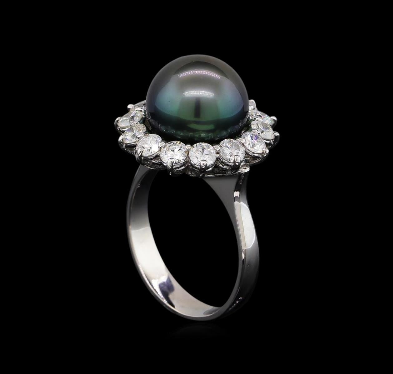 One electronically tested 14KT white gold lady's cast fashion ring with a basket halo with a bright polish finish. The featured lady's ring has a shank measuring 3.69 millimeters wide. Identified with markings of "K14". Condition is new, good workmanship. Containing: One Tahitian pearl, 11.4mm in size to 11.4mm in size. The pearl is black in color, green overtone with a very good luster, round, and mostly clean. Graded in the setting. Fourteen prong set round brilliant cut diamonds, measuring 3.10 - 3.00 x 1.83mm (depth est.) approximate total weight of 14 Stones = 1.46ct. Graded in the setting. Clarity: SI-1 to SI-2. Color: G - Very Good. Total Weight of Diamonds 1.46ct. Total Weight of Ring 7.40gm. GAS Appraised.