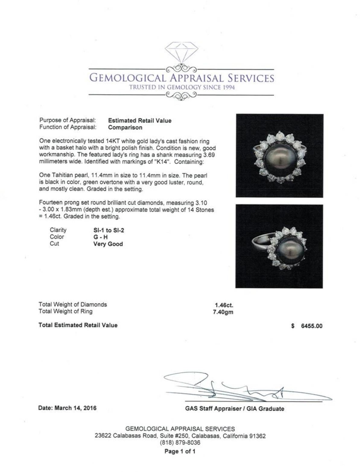 One electronically tested 14KT white gold lady's cast fashion ring with a basket halo with a bright polish finish. The featured lady's ring has a shank measuring 3.69 millimeters wide. Identified with markings of "K14". Condition is new, good workmanship. Containing: One Tahitian pearl, 11.4mm in size to 11.4mm in size. The pearl is black in color, green overtone with a very good luster, round, and mostly clean. Graded in the setting. Fourteen prong set round brilliant cut diamonds, measuring 3.10 - 3.00 x 1.83mm (depth est.) approximate total weight of 14 Stones = 1.46ct. Graded in the setting. Clarity: SI-1 to SI-2. Color: G - Very Good. Total Weight of Diamonds 1.46ct. Total Weight of Ring 7.40gm. GAS Appraised.