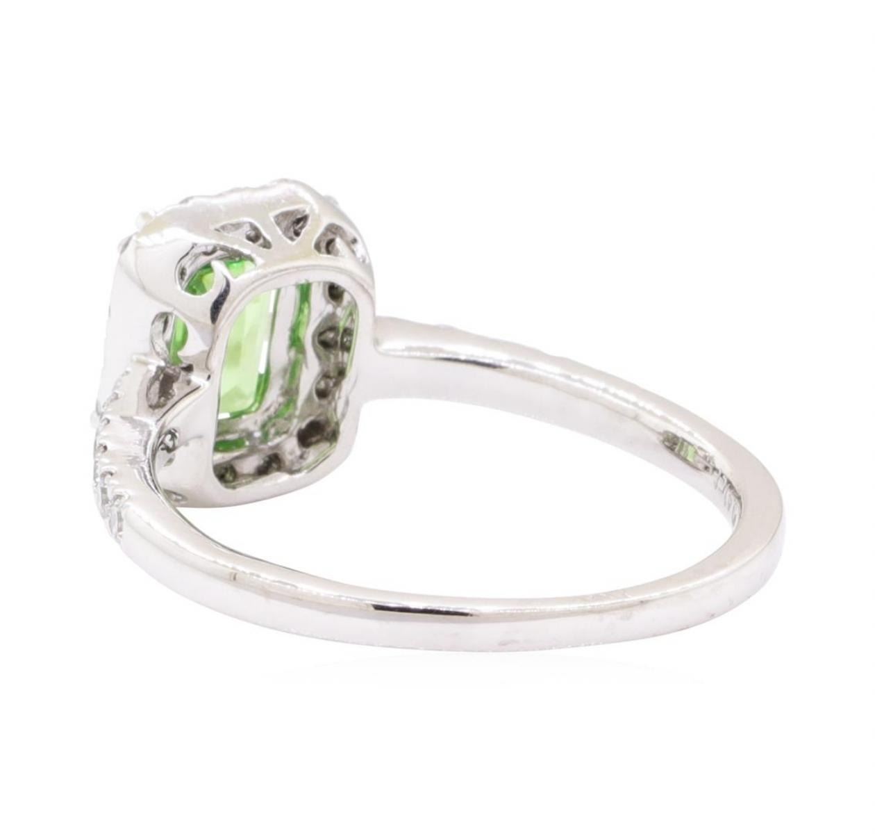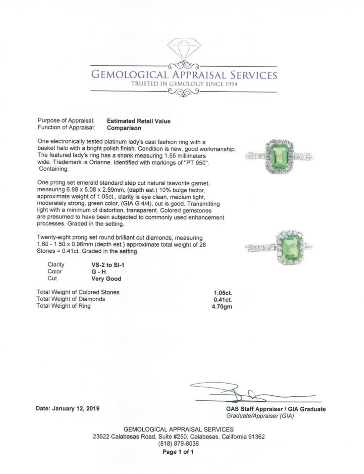 One electronically tested platinum lady's cast fashion ring with a basket halo with a bright polish finish. The featured lady's ring has a shank measuring 1.55 millimeters wide. Trademark is Orianne. Identified with markings of 'PT 950'. Condition is new, good workmanship. Containing: One prong set emerald standard step cut natural tsavorite garnet, measuring 6.88 x 5.08 x 2.89mm, (depth est.) 10%. bulge factor, approximate weight of 1.05ct., clarity is eye clean, medium light, moderately strong, green color, (GIA G 4/4), cut is good. Transmitting light with a minimum of distortion, transparent. Colored gemstones are presumed to have been subjected to commonly used enhancement processes. Graded in the setting. Twenty-Eight prong set round brilliant cut diamonds, measuring 1.60 - 1.50 x 0.96mm (depth est.) approximate total weight of 28 Stones = 0.41ct. Graded in the setting. Color G - H Clarity VS-2 to SI-1 Cut Very Good. Total Weight of Colored Stones 1.05ct.. Total Weight of Diamonds 0.41ct.. Total Weight of Ring 4.70gm GAS Appraised at $3815.00. GAS Appraised.