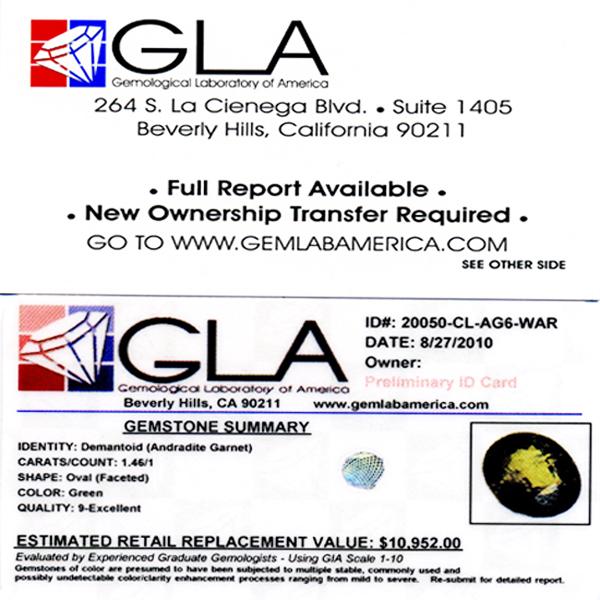 Excellent green colored specimen oval cut; lab quality evaluation 9; treatment as noted; Gem Guide wholesale $1460-$2190; full retail appraisal $10952; full lab evaluation available