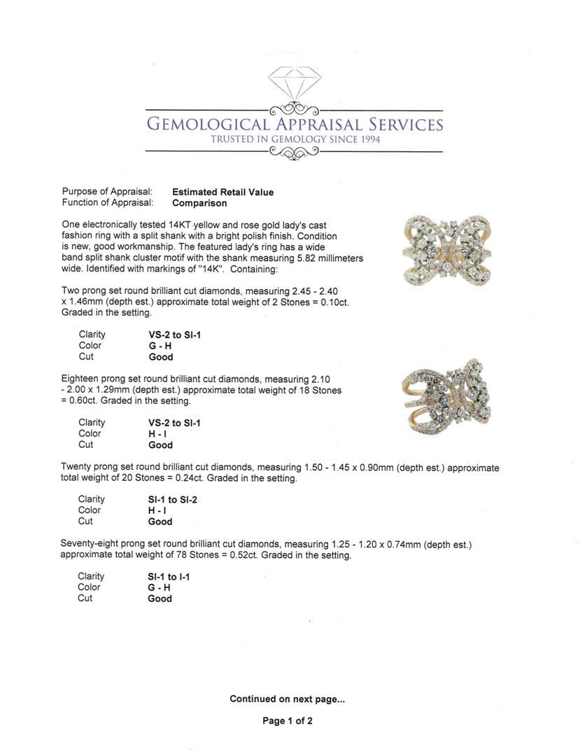 One electronically tested 14KT yellow and rose gold lady's cast fashion ring with a split shank with a bright polish finish. The featured lady's ring has a wide band split shank cluster motif with the shank measuring 5.82 millimeters wide. Identified with markings of "14K". Condition is new, good workmanship. Containing: Two prong set round brilliant cut diamonds, measuring 2.45 - 2.40 x 1.46mm (depth est.) approximate total weight of 2 Stones = 0.10ct. Graded in the setting. Clarity: VS-2 to SI-1. Color: G - Good Eighteen prong set round brilliant cut diamonds, measuring 2.10 - 2.00 x 1.29mm (depth est.) approximate total weight of 18 Stones = 0.60ct. Graded in the setting. Clarity: VS-2 to SI-1. Color: H - I. Cut Good Twenty prong set round brilliant cut diamonds, measuring 1.50 - 1.45 x 0.90mm (depth est.) approximate total weight of 20 Stones = 0.24ct. Graded in the setting. Clarity: SI-1 to SI-2. Color: H - I. Cut Good Seventy-Eight prong set round brilliant cut diamonds, measuring 1.25 - 1.20 x 0.74mm (depth est.) approximate total weight of 78 Stones = 0.52ct. Graded in the setting. Clarity: SI-1 to I-1. Color: G - Good. Total Weight of Diamonds 1.46ct. Total Weight of Ring 6.50gm. GAS Appraised at $5,105.00.