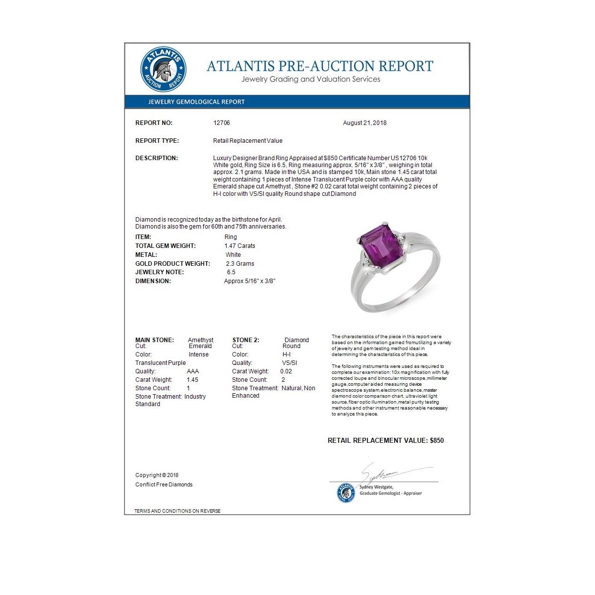 REF-13K3W -12706 ---- 1.47 CTW Amethyst & Diamond Ring 10K White Gold ---- Luxury Designer Brand Ring Appraised at $850 Certificate Number US12706 10k White gold, Ring Size is 6.5, Ring measuring approx. 5/16" x 3/8" , weighing in total approx. 2.1 grams. Made in the USA and is stamped 10k, Main stone 1.45 carat total weight containing 1 pieces of Intense Translucent Purple color with AAA quality Emerald shape cut Amethyst , Stone #2 0.02 carat total weight containing 2 pieces of H-I color with VS/SI quality Round shape cut Diamond