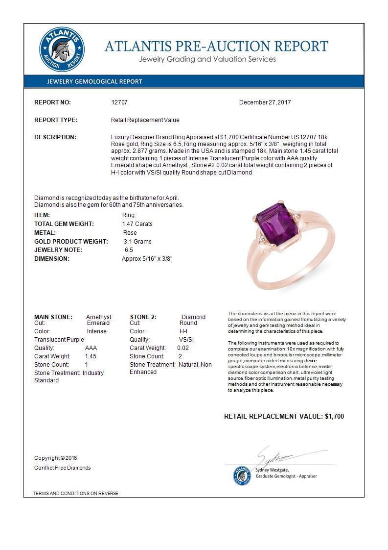 REF-25M5H -12707 ---- 1.47 CTW Amethyst & Diamond Ring 18K Rose Gold ---- Luxury Designer Brand Ring Appraised at $1,700 Certificate Number US12707  18k Rose gold,  Ring Size is 6.5, Ring measuring approx. 5/16" x  3/8" , weighing in total approx. 2.877 grams. Made in the USA and is stamped 18k, Main stone 1.45 carat total weight containing 1 pieces of Intense Translucent Purple color with AAA quality Emerald shape cut Amethyst , Stone #2 0.02 carat total weight containing 2 pieces of H-I color with  VS/SI quality Round shape cut Diamond