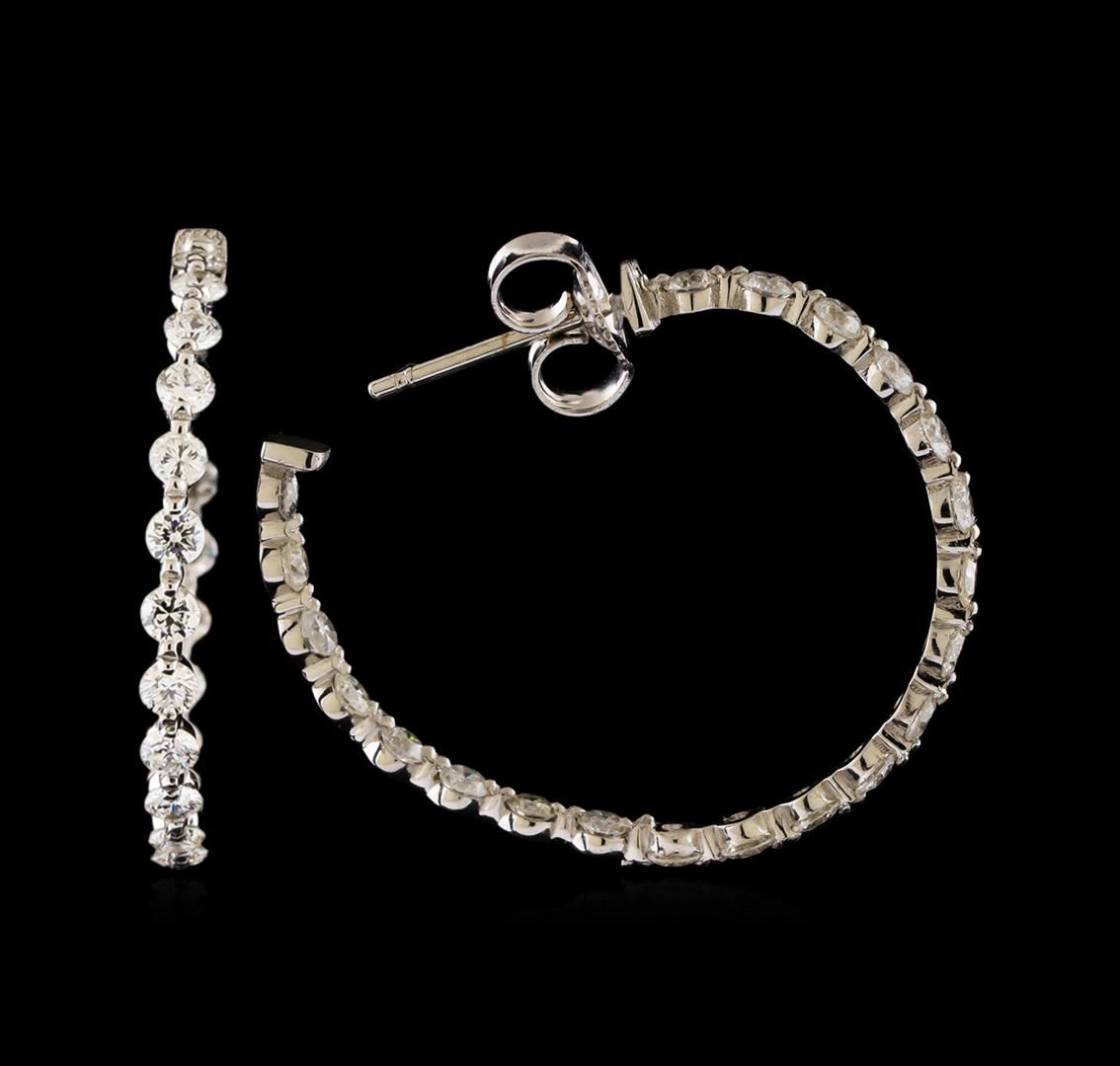 One pair electronically tested 14KT white gold ladies cast & assembled In and Out diamond hoop earrings with standard backs. Each earring features a two millimeter wide diamond ribbon hoop measuring one inch in diameter. Bright polish finish. Identified with markings of '14K'. Condition is good. Containing: Forty-Two prong set round brilliant cut diamonds, measuring 2.10 - 2.00 x 1.23mm (depth est.) approximate total weight of 42 Stones = 1.47ct. The clarity grade reflects the entire range of clarity for this group. Graded in the setting. Clarity SI-1 to I-2. Color: F - H. Total Weight of Diamonds 1.47ct.. Total Weight of Earrings 2.31gm. AIG Appraised at $4,130.00.