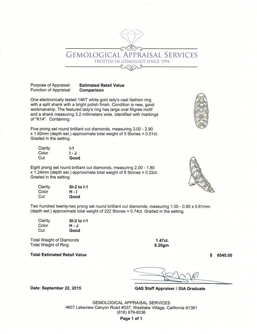 One electronically tested 14KT white gold lady's cast fashion ring with a split shank with a bright polish finish. The featured lady's ring has large oval filigree motif and a shank measuring 3.2 millimeters wide. Identified with markings of "K14". Condition is new, good workmanship. Containing: Five prong set round brilliant cut diamonds, measuring 3.00 - 2.90 x 1.92mm (depth est.) approximate total weight of 5 Stones = 0.51ct. Graded in the setting. Clarity: I-1. Color: I - Good Eight prong set round brilliant cut diamonds, measuring 2.00 - 1.80 x 1.24mm (depth est.) approximate total weight of 8 Stones = 0.22ct. Graded in the setting. Clarity: SI-2 to I-1. Color: H - I. Cut Good Two Hundred Twenty-Two prong set round brilliant cut diamonds, measuring 1.00 - 0.90 x 0.61mm (depth est.) approximate total weight of 222 Stones = 0.74ct. Graded in the setting. Clarity: SI-2 to I-1. Color: H - Good. Total Weight of Diamonds 1.47ct. Total Weight of Ring 9.20gm at $6545.00.. GAS Appraised at $6,545.00.