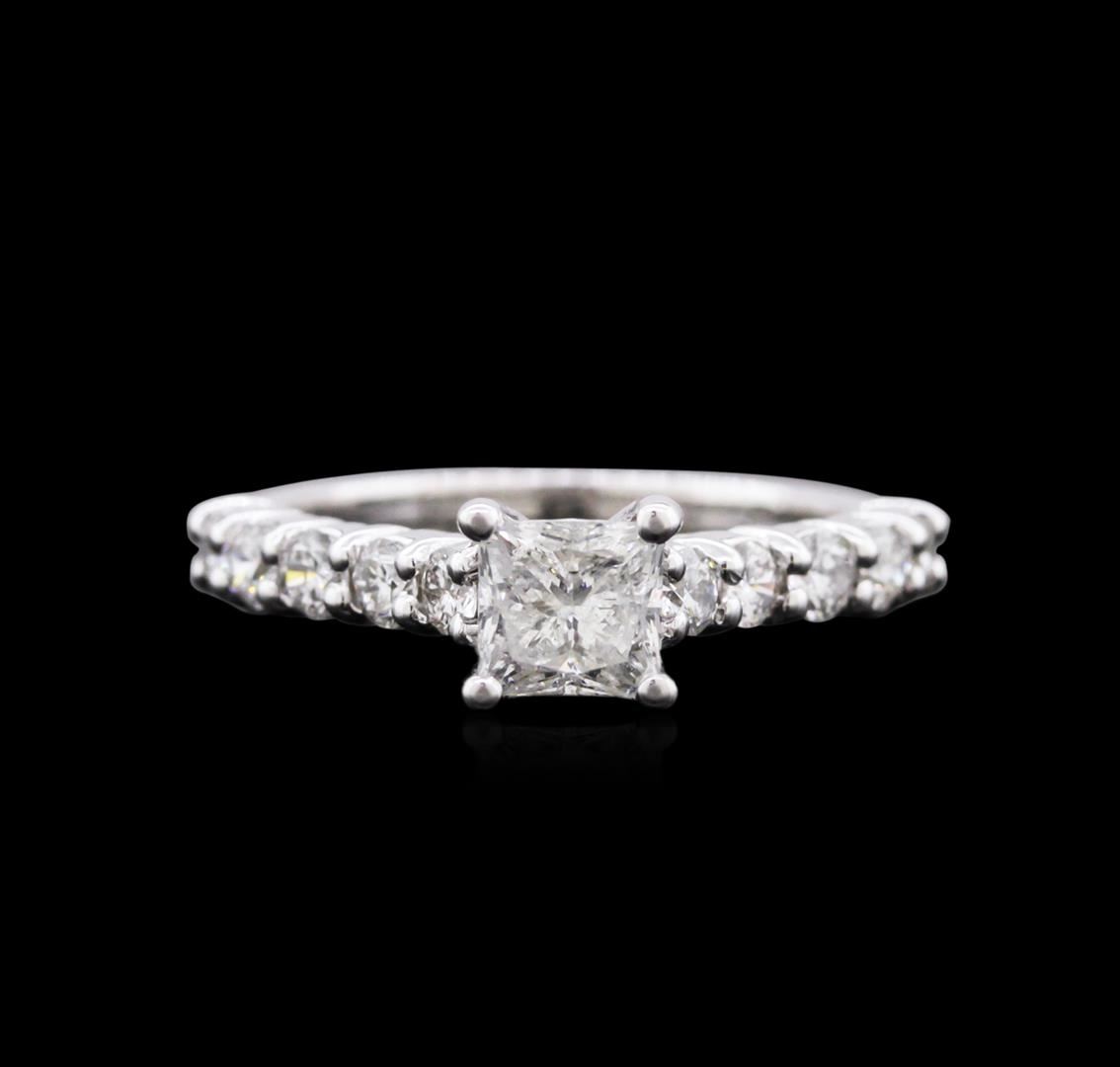 One electronically tested 14KT white gold ladies cast diamond engagement ring with a bright polish finish. Identified with markings of "14K". Condition is new. Containing: One prong set princess cut diamond, measuring 4.90 x 4.96 x 3.72mm (depth est.) approximate weight of 0.82ct. Clarity: I-2. Color: I, Cut is Good. Ten prong set round brilliant cut diamonds, measuring 2.50 - 2.50 x 1.50mm (depth est.) approximate total weight of 10 Stones = 0.65ct. Clarity: SI-1. Color: I - J, Cut is Good. Diamonds are graded in the mounting, unless otherwise stated. Total Weight of Diamonds 1.47ct. Total Weight of Engagement Ring 3.80 grams. GGL Appraised at $4,005.00.