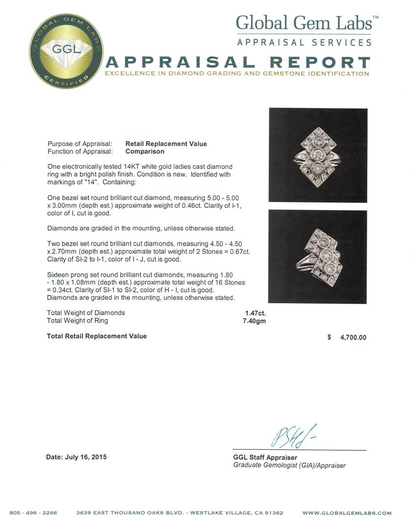 One electronically tested 14KT white gold ladies cast diamond ring with a bright polish finish. Identified with markings of "14". Condition is new. Containing: One bezel set round brilliant cut diamond, measuring 5.00 - 5.00 x 3.00mm (depth est.) approximate weight of 0.46ct. Clarity: I-1. Color: I, Cut is Good. Diamonds are graded in the mounting, unless otherwise stated. Two bezel set round brilliant cut diamonds, measuring 4.50 - 4.50 x 2.70mm (depth est.) approximate total weight of 2 Stones = 0.67ct. Clarity: SI-2 to I-1. Color: I - J, Cut is Good. Sixteen prong set round brilliant cut diamonds, measuring 1.80 - 1.80 x 1.08mm (depth est.) approximate total weight of 16 Stones = 0.34ct. Clarity: SI-1 to SI-2. Color: H - I, Cut is Good. Diamonds are graded in the mounting, unless otherwise stated. Total Weight of Diamonds 1.47ct. Total Weight of Ring 7.40 grams. GGL Appraised at $4,700.00.