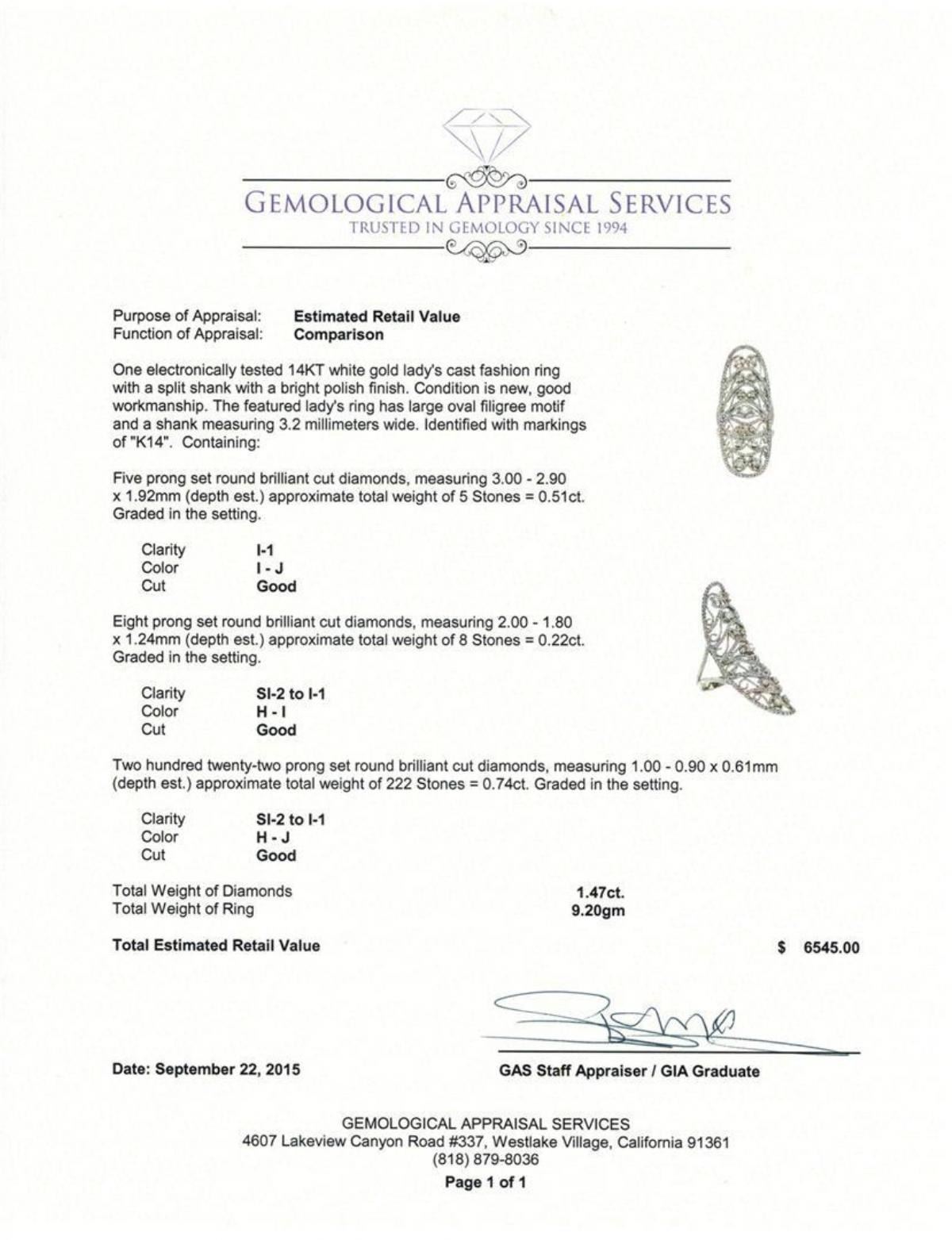 One electronically tested 14KT white gold lady's cast fashion ring with a split shank with a bright polish finish. The featured lady's ring has large oval filigree motif and a shank measuring 3.2 millimeters wide. Identified with markings of "K14". Condition is new, good workmanship. Containing: Five prong set round brilliant cut diamonds, measuring 3.00 - 2.90 x 1.92mm (depth est.) approximate total weight of 5 Stones = 0.51ct. Graded in the setting. Clarity: I-1. Color: I - Good Eight prong set round brilliant cut diamonds, measuring 2.00 - 1.80 x 1.24mm (depth est.) approximate total weight of 8 Stones = 0.22ct. Graded in the setting. Clarity: SI-2 to I-1. Color: H - I. Cut Good Two Hundred Twenty-Two prong set round brilliant cut diamonds, measuring 1.00 - 0.90 x 0.61mm (depth est.) approximate total weight of 222 Stones = 0.74ct. Graded in the setting. Clarity: SI-2 to I-1. Color: H - Good. Total Weight of Diamonds 1.47ct. Total Weight of Ring 9.20gm at $6545.00.. GAS Appraised.