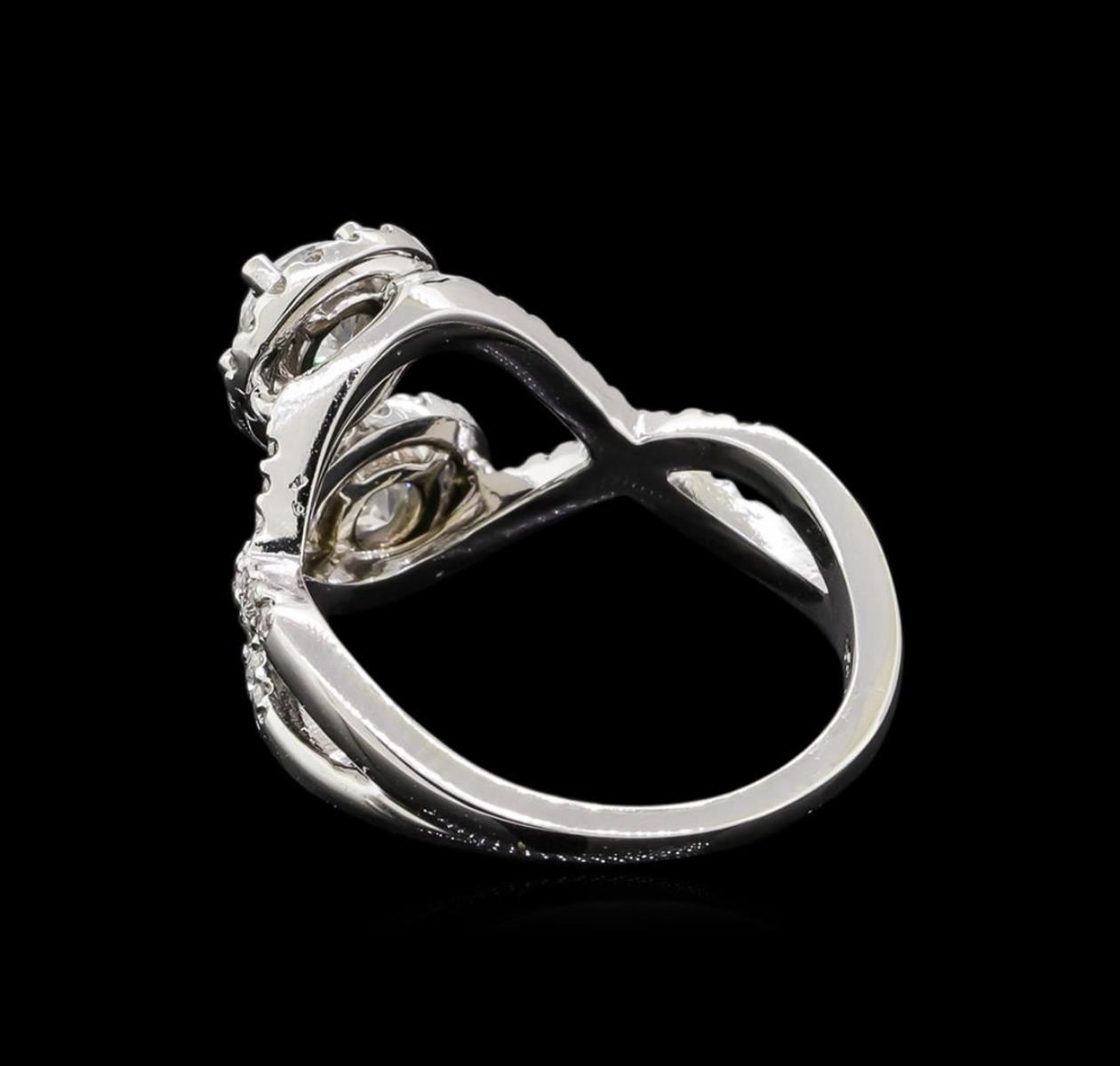 One electronically tested 14KT white gold lady's cast fashion ring with a crossover split shank with a bright polish finish. The featured lady's ring has a shank measuring 1.49 millimeters in width. Identified with markings of '14K'. Condition is new, good workmanship. Containing: Two prong set round brilliant cut diamonds, measuring 4.90 - 4.88 x 3.40mm (depth est.) , 5.00.%. GTCF approximate total weight of 2 Stones = 1.05ct. Graded in the setting. Clarity SI-2 to I-1. Color: I - J Cut Good Sixty-Six prong set round brilliant cut diamonds, measuring 1.25 - 1.15 x 0.74mm (depth est.) approximate total weight of 66 Stones = 0.42ct. Graded in the setting. Clarity SI-1 to I-1. Color: H - I Cut Good. Total Weight of Diamonds 1.47ct.. Total Weight of Ring 4.60gm. GAS Appraised.