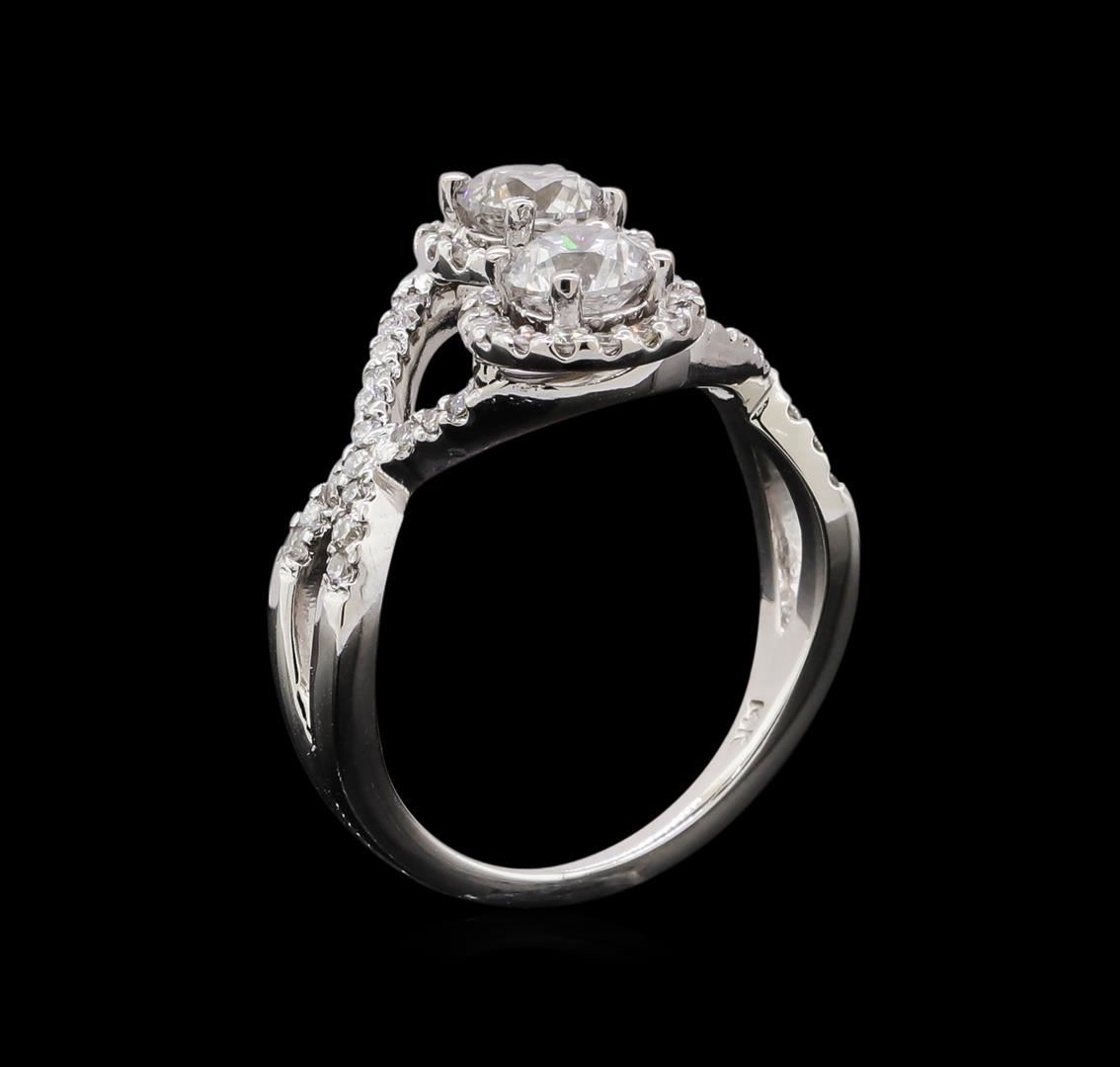 One electronically tested 14KT white gold lady's cast fashion ring with a crossover split shank with a bright polish finish. The featured lady's ring has a shank measuring 1.49 millimeters in width. Identified with markings of '14K'. Condition is new, good workmanship. Containing: Two prong set round brilliant cut diamonds, measuring 4.90 - 4.88 x 3.40mm (depth est.), 5.00.%. GTCF approximate total weight of 2 Stones = 1.05ct. Graded in the setting. Clarity SI-2 to I-1. Color: I - J Cut Good Sixty-Six prong set round brilliant cut diamonds, measuring 1.25 - 1.15 x 0.74mm (depth est.) approximate total weight of 66 Stones = 0.42ct. Graded in the setting. Clarity SI-1 to I-1. Color: H - I Cut Good. Total Weight of Diamonds 1.47ct.. Total Weight of Ring 4.60gm. GAS Appraised.
