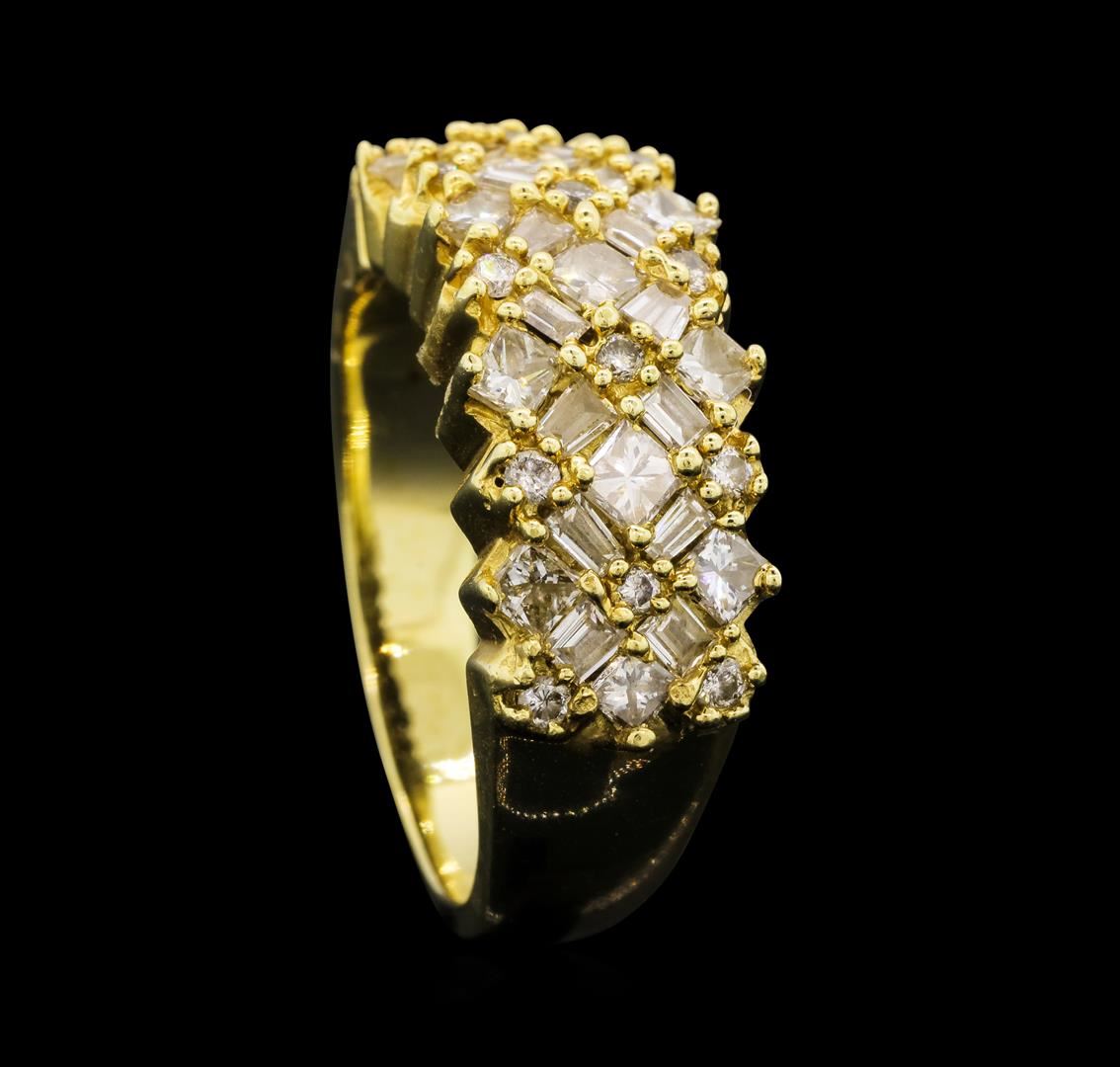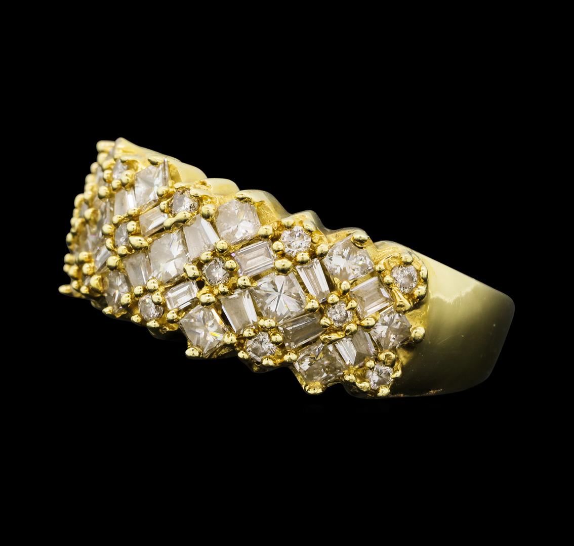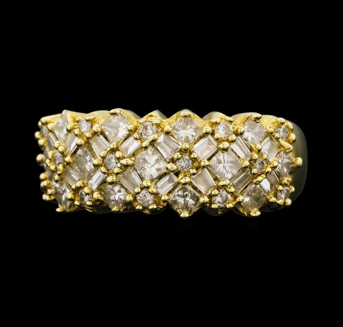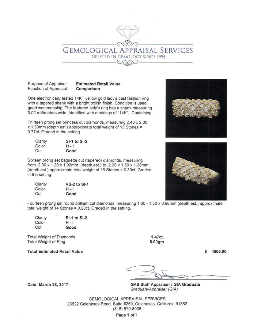 One electronically tested 14KT yellow gold lady's cast fashion ring with a tapered shank with a bright polish finish. The featured lady's ring has a shank measuring 3.02 millimeters wide. Identified with markings of '14K'. Condition is used, good workmans GAS Appraised at $4,505.00.