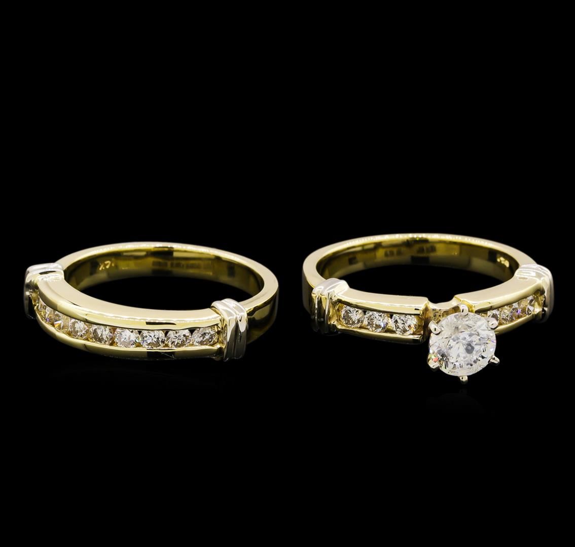 One set electronically tested 14KT yellow and white gold lady's combination cast & assembled straight line wedding ring with a bright polish finish. The featured lady's ring has a double shank measuring 6.0 millimeters in width. Identified with markings of "14K". Condition is new, good workmanship. Containing: One prong set round brilliant cut diamond, measuring 5.43 - 5.42 x 3.90mm (depth est.) approximate weight of 0.72ct. Graded in the setting. Clarity: I-1. Color: Good Fifteen channel set round brilliant cut diamonds, measuring 2.40 - 2.35 x 1.50mm (depth est.) approximate total weight of 15 Stones = 0.75ct. Graded in the setting. Clarity: VS-2 to SI-1. Color: H - I. Cut Good. Total Weight of Diamonds 1.47ct. Total Weight of 8.00gm. GAS Appraised at $6,365.00.