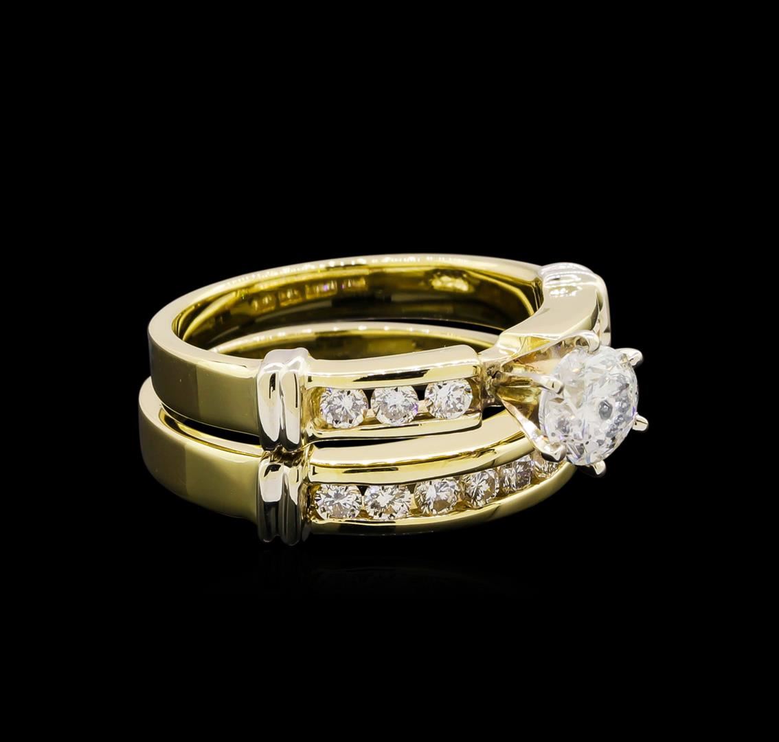 One set electronically tested 14KT yellow and white gold lady's combination cast & assembled straight line wedding ring with a bright polish finish. The featured lady's ring has a double shank measuring 6.0 millimeters in width. Identified with markings of "14K". Condition is new, good workmanship. Containing: One prong set round brilliant cut diamond, measuring 5.43 - 5.42 x 3.90mm (depth est.) approximate weight of 0.72ct. Graded in the setting. Clarity: I-1. Color: Good Fifteen channel set round brilliant cut diamonds, measuring 2.40 - 2.35 x 1.50mm (depth est.) approximate total weight of 15 Stones = 0.75ct. Graded in the setting. Clarity: VS-2 to SI-1. Color: H - I. Cut Good. Total Weight of Diamonds 1.47ct. Total Weight of 8.00gm. GAS Appraised at $6,365.00.