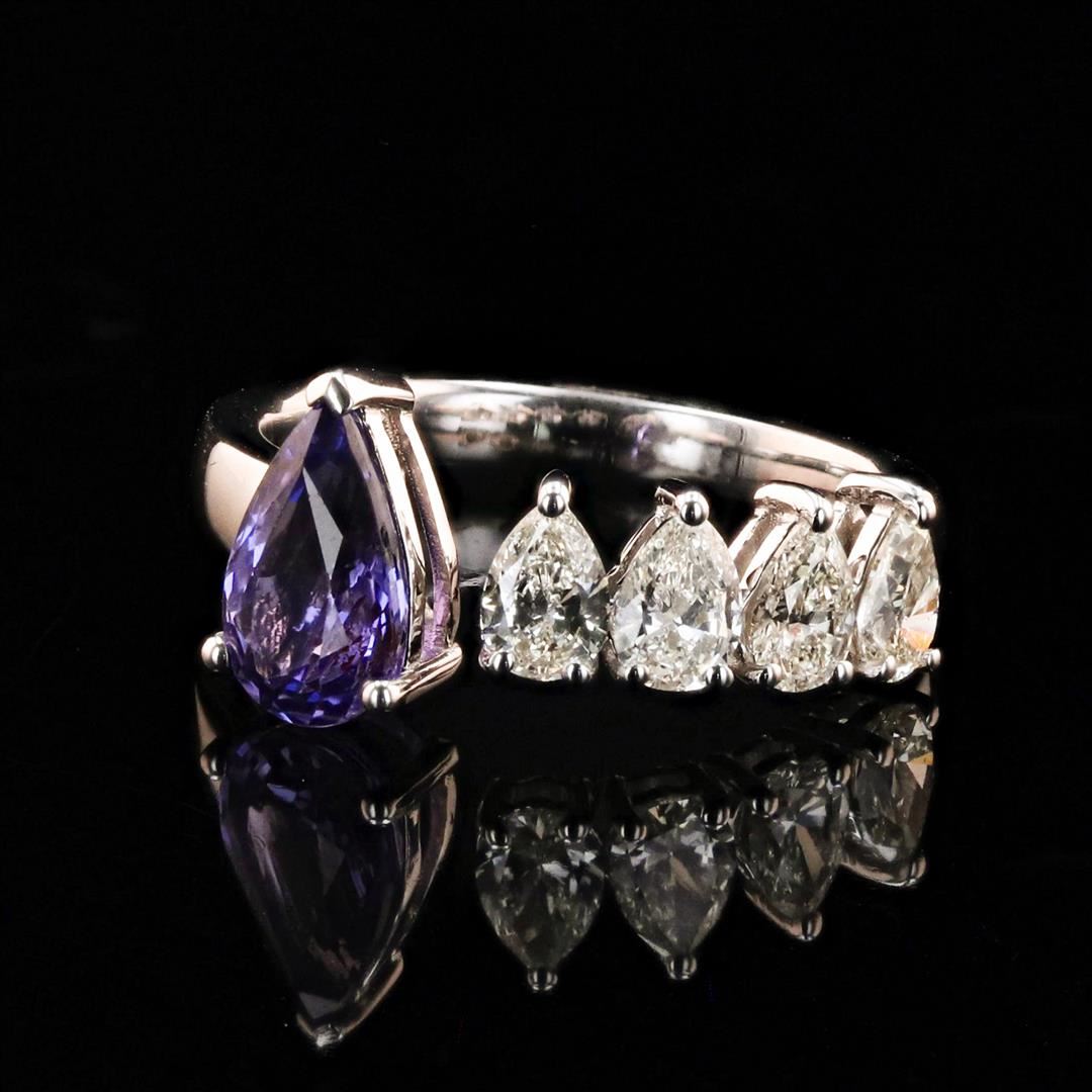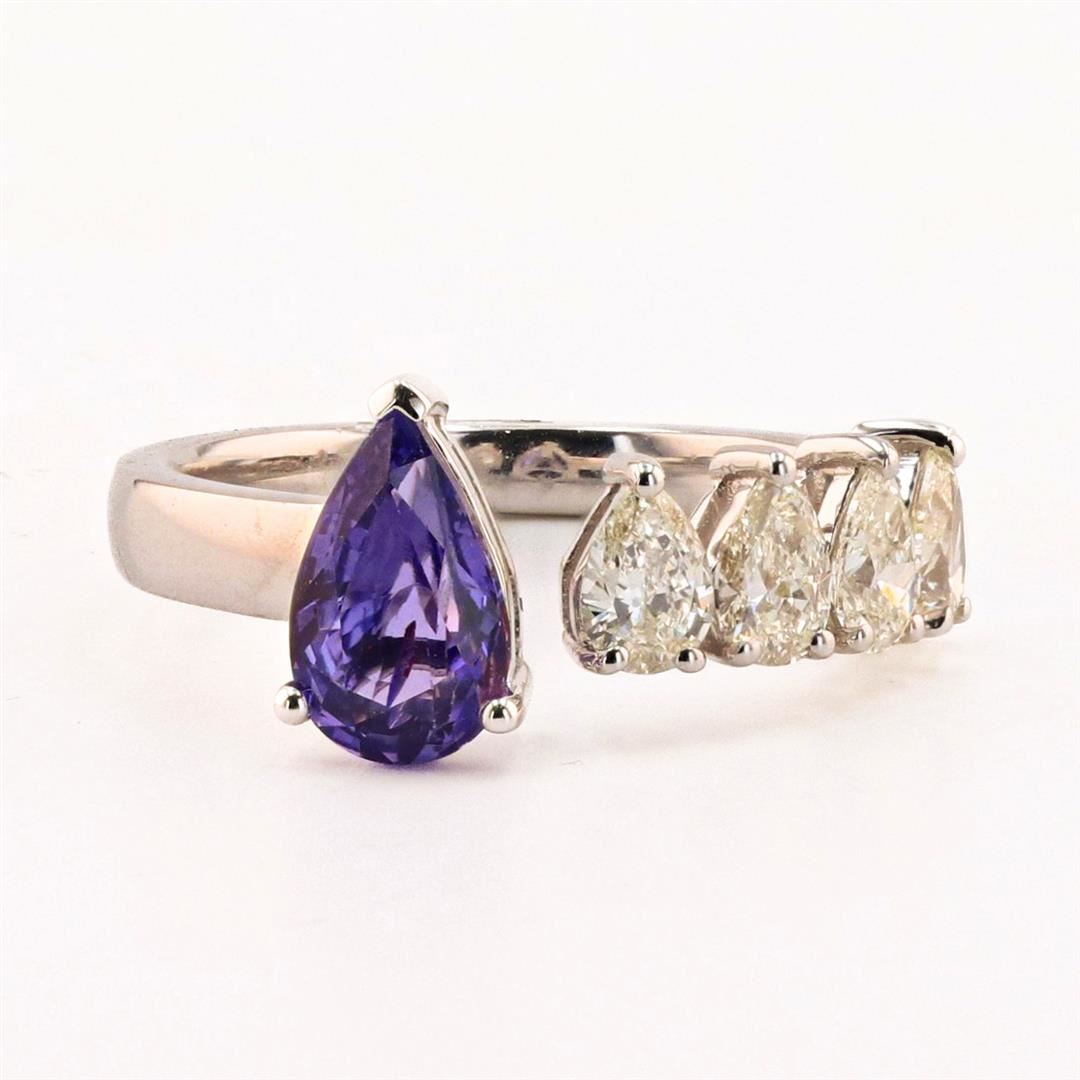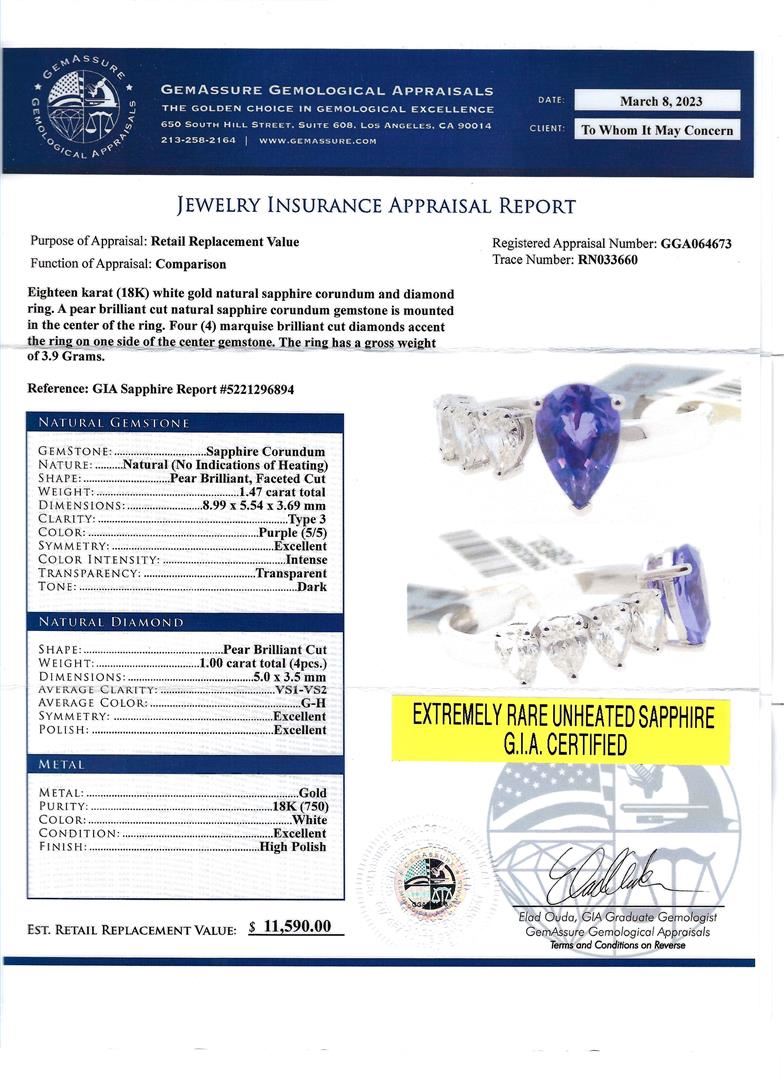 1.47ct UNHEATED Blue Sapphire and 1.00ctw Diamond 18K White Gold Ring (GIA CERTIFIED). Eighteen karat (18K) white gold natural sapphire corundum and diamond ring. A pear brilliant cut natural sapphire corundum gemstone is mounted in the center of the ring. Four (4) marquise brilliant cut diamonds accent the ring on one side of the center gemstone. The ring has a gross weight of 3.9 Grams. Reference: GIA Sapphire Report 5221296894 NATURAL GEMSTONE GEMSTONE: Sapphire Corundum NATURE: Natural (No Indications of Heating) SHAPE: Pear Brilliant, Faceted Cut WEIGHT: 1.47 carat total DIMENSIONS: 8.99 x 5.54 x 3.69mm CLARITY: Type 3 COLOR: Purple (5/5) SYMMETRY: Excellent COLOR INTENSITY: Intense TRANSPARENCY: Transparent TONE: Dark NATURAL DIAMOND SHAPE: Pear Brilliant Cut WEIGHT: 1.00 carat total (4pcs.) DIMENSIONS: 5.0 x 3.5mm AVERAGE CLARITY: VS1-VS2 AVERAGE COLOR: G-H SYMMETRY: Excellent POLISH: Excellent METAL METAL: Gold PURITY: 18K (750) COLOR: White CONDITION: Excellent FINISH: High Polish