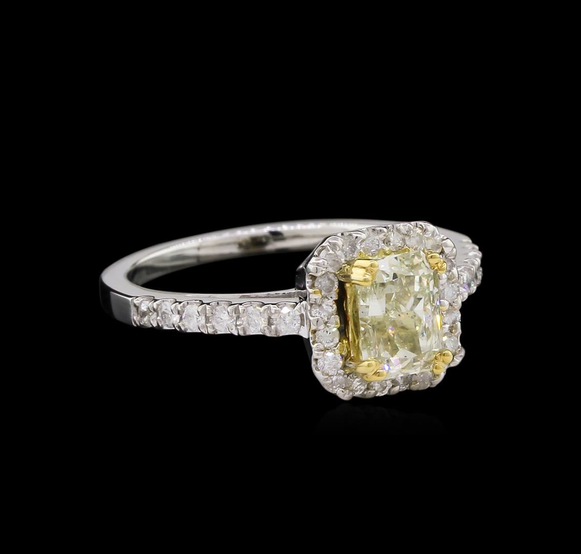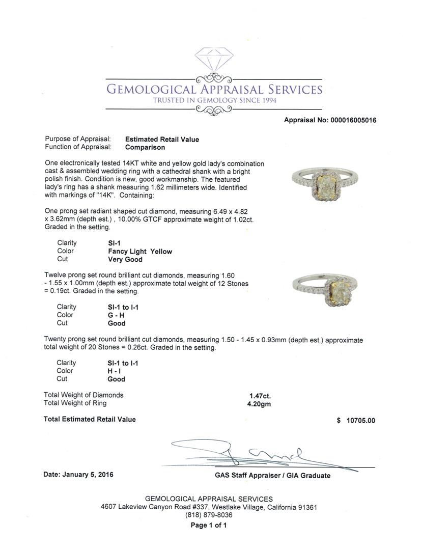 One electronically tested 14KT white and yellow gold lady's combination cast & assembled wedding ring with a cathedral shank with a bright polish finish. The featured lady's ring has a shank measuring 1.62 millimeters wide. Identified with markings of "14K". Condition is new, good workmanship. Containing: One prong set radiant shaped cut diamond, measuring 6.49 x 4.82 x 3.62mm (depth est.) , 10.00.%. GTCF approximate weight of 1.02ct. Graded in the setting. Clarity: SI-1 Cut Very Good Twelve prong set round brilliant cut diamonds, measuring 1.60 - 1.55 x 1.00mm (depth est.) approximate total weight of 12 Stones = 0.19ct. Graded in the setting. Clarity: SI-1 to I-1. Color: G - Good Twenty prong set round brilliant cut diamonds, measuring 1.50 - 1.45 x 0.93mm (depth est.) approximate total weight of 20 Stones = 0.26ct. Graded in the setting. Clarity: SI-1 to I-1. Color: H - I. Cut Good. Total Weight of Diamonds 1.47ct. Total Weight of Ring 4.20gm. GAS Appraised at $10,705.00.