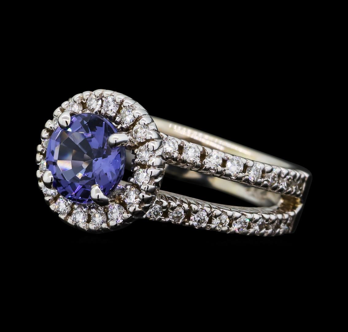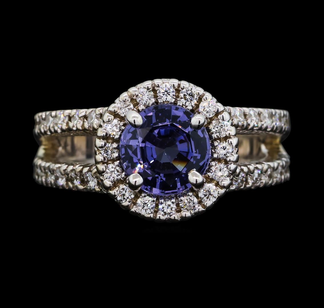 One electronically tested 14KT white gold ladies cast spinel and diamond ring with a bright polish finish. The featured spinel is set within a diamond bezel supported by a diamond set under gallery and diamond set split shoulders, completed by a four millimeter wide band. Identified with markings of '14K'. Condition is good. Containing: One prong set round mixed cut natural blue spinel, measuring 6.95 - 6.90 x 3.95 mm, approximate weight of 1.48ct., clarity is eye clean, type II, medium, very slightly grayish, violetish blue color, (GIA vB 5/3), cut is good. Transmitting light with no distortion, transparent. Graded in the setting. Fifty-Four prong set round brilliant cut diamonds, measuring 1.50 - 1.30 x 0.84mm (depth est.) approximate total weight of 54 Stones = 0.65ct. Graded in the setting. Clarity VS-1 to VS-2. Color: G - H. Total Weight of Colored Stones 1.48ct.. Total Weight of Diamonds 0.65ct.. Total Weight of Ring 6.56gm. AIG Appraised at $5,710.00.
