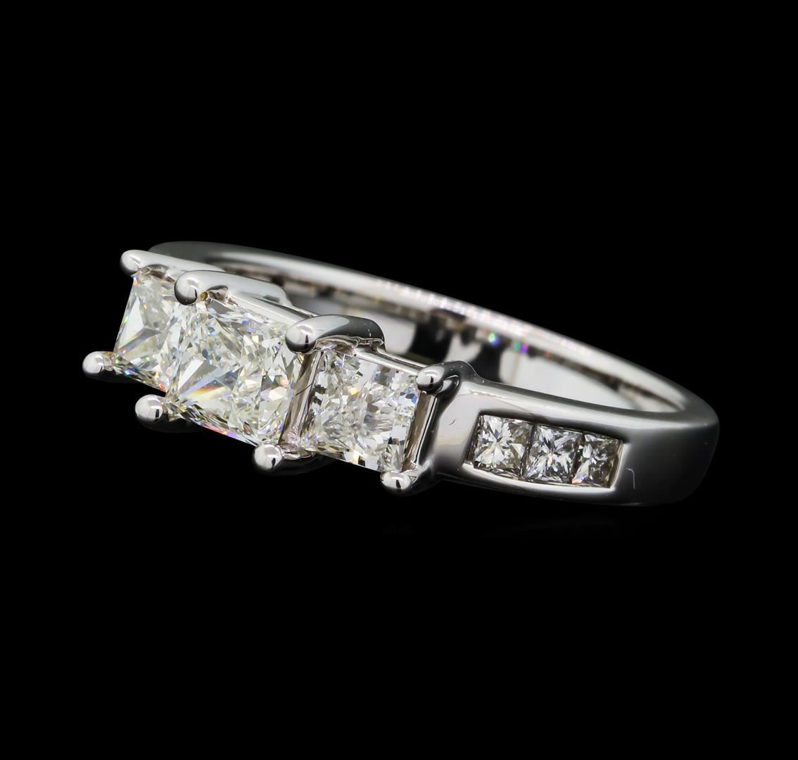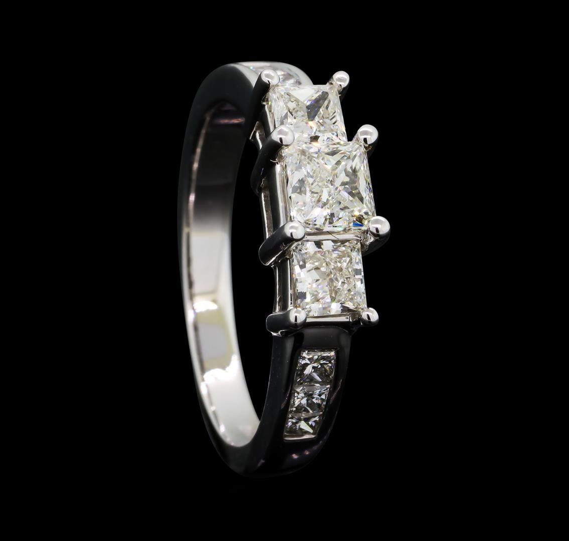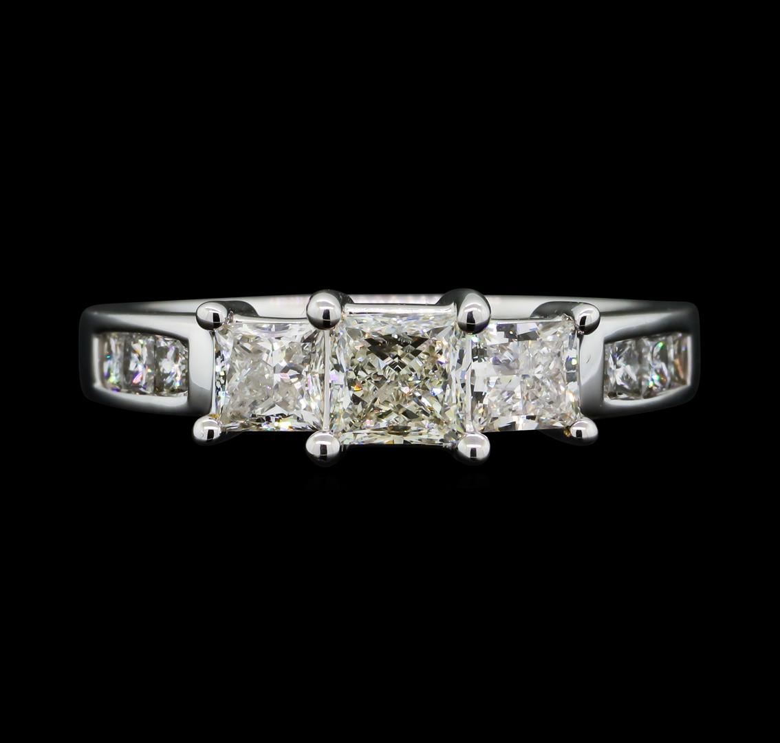 One electronically tested 14KT white gold ladies cast diamond unity ring with a bright polish finish. The ring features a princess cut diamond trio supported by diamond set shoulders, completed by a two millimeter wide band. Trademark is WDC. Identified with markings of '14K'. Condition is new, good workmanship. Containing: One prong set princess cut diamond, measuring 4.50 x 4.20 x 3.20mm (depth est.) approximate weight of 0.53ct. Clarity SI-1. Color: J Two prong set princess cut diamonds, measuring 3.80 x 3.50 x 2.60mm (depth est.) approximate total weight of 2 Stones = 0.61ct. Clarity SI-1 to SI-2. Color: H - I Six channel set princess cut diamonds, measuring 2.00 x 2.00 x 1.51mm (depth est.) approximate total weight of 6 Stones = 0.34ct. Graded in the setting. Clarity SI-2. Color: F - G. Total Weight of Diamonds 1.48ct.. Total Weight of Ring 4.56gm. AIG Appraised at $6,180.00.