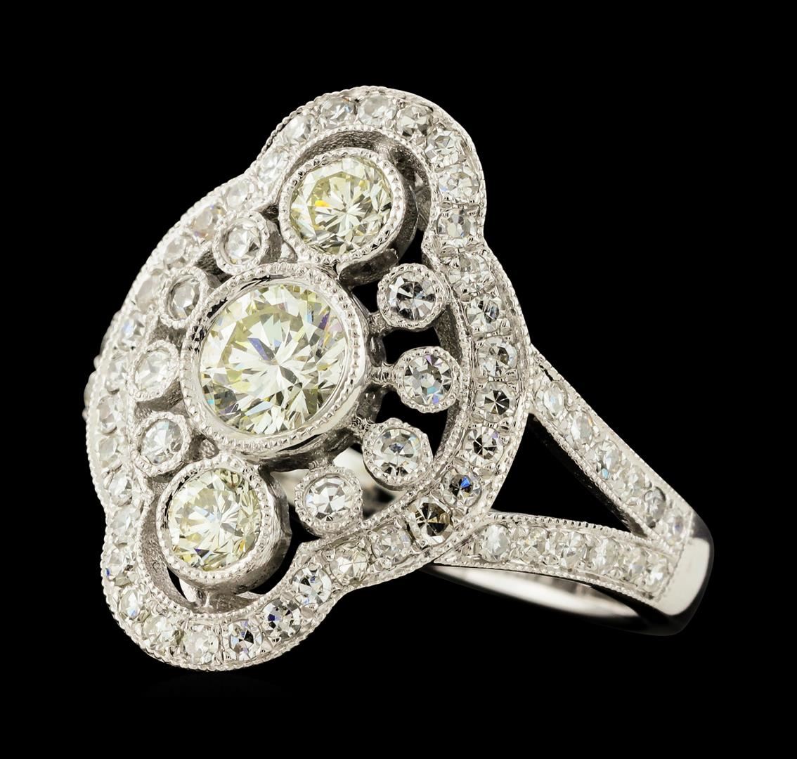 One electronically tested 18KT white gold lady's cast fashion ring with a split shank scalloped basket halo with a bright polish with milgrain detailing finish. The featured lady's ring has a shank measuring 2.62 millimeters wide. Trademark is MICHA. Identified with markings of '18K 750'. Condition is new, good workmanship. Containing: One bezel set round brilliant cut diamond, measuring 5.10 - 5.05 x 3.05mm (depth est.) approximate weight of 0.48ct. Graded in the setting. Clarity VS-2. Color: H - I Cut Good Two bezel set round brilliant cut diamonds, measuring 3.70 - 3.60 x 2.26mm (depth est.) approximate total weight of 2 Stones = 0.37ct. Graded in the setting. Clarity VS-2. Color: H - I Cut Good Eight bezel set single cut diamonds, measuring 1.70 - 1.60 x 1.02mm (depth est.) approximate total weight of 8 Stones = 0.14ct. Graded in the setting. Clarity VS-2 to SI-2. Color: H - I Cut Good Sixty-Two prong set single cut diamonds, measuring 1.30 - 1.25 x 0.79mm (depth est.) approximate total weight of 62 Stones = 0.49ct. Graded in the setting. Clarity VS-2 to SI-1. Color: G - I Cut Good. Total Weight of Diamonds 1.48ct.. Total Weight of Ring 6.70gm. GAS Appraised at $7,405.00.