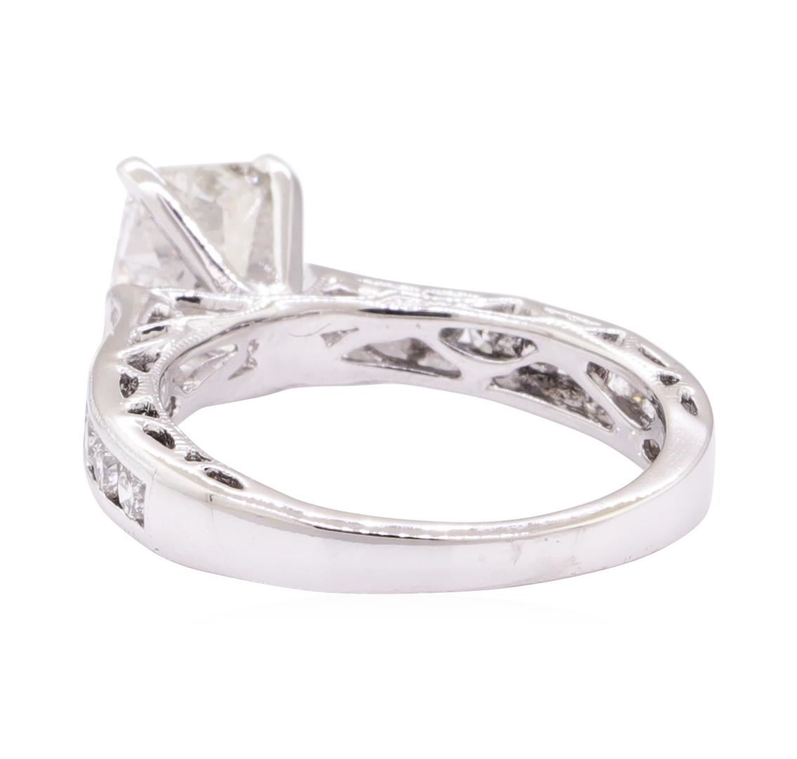 One electronically tested 18KT white gold lady's combination cast & assembled engagement ring with a cathedral shank with a bright polish finish. The featured lady's ring has a shank measuring 2.00 millimeters wide. Identified with markings of '750'. Condition is like new, good workmanship. Containing: One prong set radiant shaped cut diamond, measuring 7.26 x 5.71 x 3.16mm (depth est.) , 5.00.%. GTCF approximate weight of 1.15ct. Graded loose prior to setting in the EGLUSA Laboratory, Report #US918465710Girdle: Think to Very Thick, PolishedCulet: NonePolish: GoodSymmetry: GoodFluorescence: None. Color E Clarity I-1 Cut Good Ten channel set round brilliant cut diamonds, measuring 2.00 - 1.70 x 1.15mm (depth est.) approximate total weight of 10 Stones = 0.25ct. Graded in the setting. Color G - H Clarity VS-1 to VS-2 Cut Very Good Eight prong set round brilliant cut diamonds, measuring 1.50 - 1.20 x 0.84mm (depth est.) approximate total weight of 8 Stones = 0.08ct. Graded in the setting. Color G - H Clarity SI-1 to SI-2 Cut Very Good. Total Weight of Diamonds 1.48ct.. Total Weight of Ring 3.10gm GAS Appraised at $8940.00. GAS Appraised at $8,940.00.