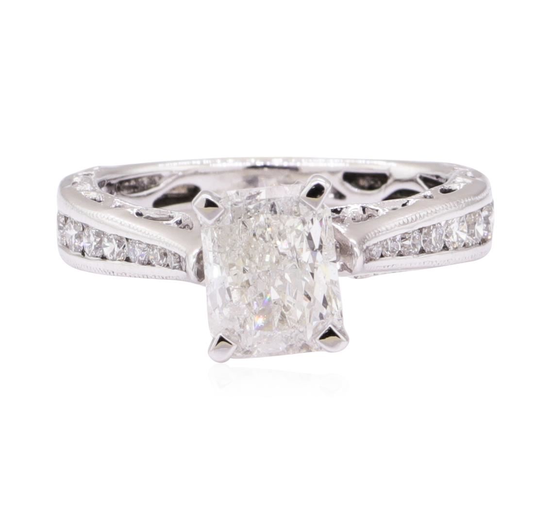 One electronically tested 18KT white gold lady's combination cast & assembled engagement ring with a cathedral shank with a bright polish finish. The featured lady's ring has a shank measuring 2.00 millimeters wide. Identified with markings of '750'. Condition is like new, good workmanship. Containing: One prong set radiant shaped cut diamond, measuring 7.26 x 5.71 x 3.16mm (depth est.) , 5.00.%. GTCF approximate weight of 1.15ct. Graded loose prior to setting in the EGLUSA Laboratory, Report #US918465710Girdle: Think to Very Thick, PolishedCulet: NonePolish: GoodSymmetry: GoodFluorescence: None. Color E Clarity I-1 Cut Good Ten channel set round brilliant cut diamonds, measuring 2.00 - 1.70 x 1.15mm (depth est.) approximate total weight of 10 Stones = 0.25ct. Graded in the setting. Color G - H Clarity VS-1 to VS-2 Cut Very Good Eight prong set round brilliant cut diamonds, measuring 1.50 - 1.20 x 0.84mm (depth est.) approximate total weight of 8 Stones = 0.08ct. Graded in the setting. Color G - H Clarity SI-1 to SI-2 Cut Very Good. Total Weight of Diamonds 1.48ct.. Total Weight of Ring 3.10gm GAS Appraised at $8940.00. GAS Appraised at $8,940.00.