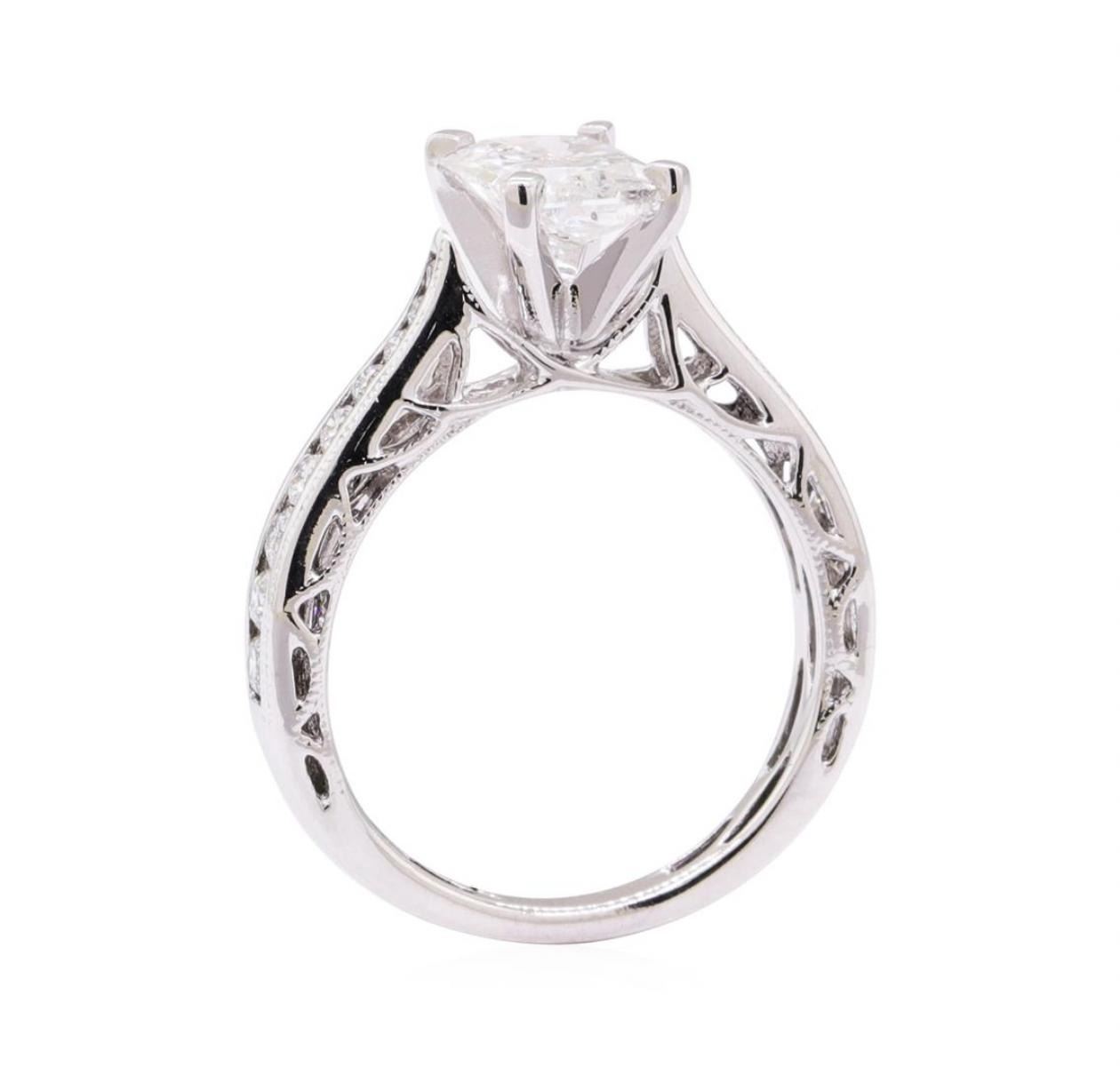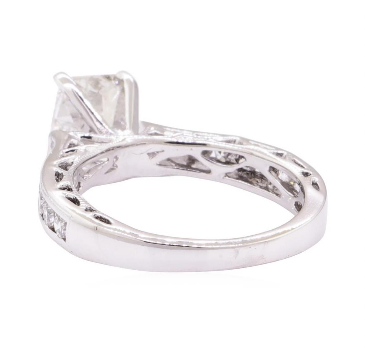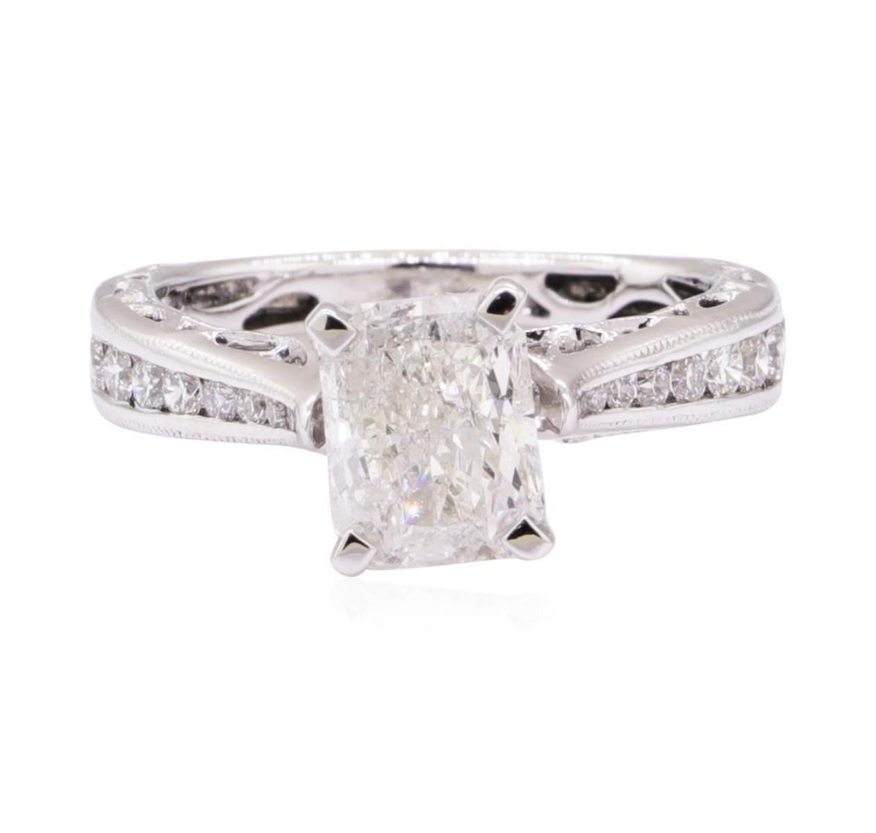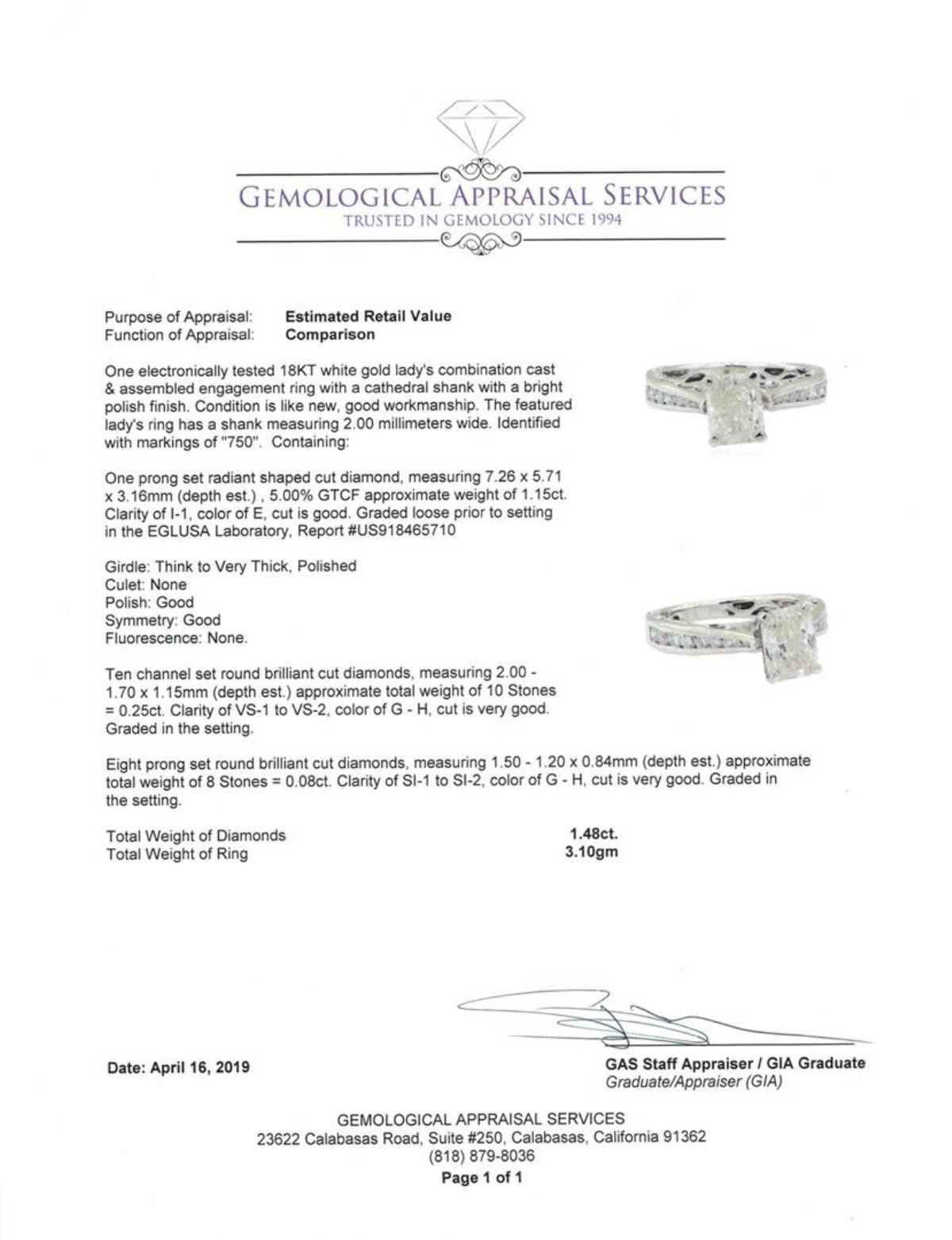 One electronically tested 18KT white gold lady's combination cast & assembled engagement ring with a cathedral shank with a bright polish finish. The featured lady's ring has a shank measuring 2.00 millimeters wide. Identified with markings of '750'. Condition is like new, good workmanship. Containing: One prong set radiant shaped cut diamond, measuring 7.26 x 5.71 x 3.16mm (depth est.) , 5.00.%. GTCF approximate weight of 1.15ct. Graded loose prior to setting in the EGLUSA Laboratory, Report #US918465710Girdle: Think to Very Thick, PolishedCulet: NonePolish: GoodSymmetry: GoodFluorescence: None. Color E Clarity I-1 Cut Good Ten channel set round brilliant cut diamonds, measuring 2.00 - 1.70 x 1.15mm (depth est.) approximate total weight of 10 Stones = 0.25ct. Graded in the setting. Color G - H Clarity VS-1 to VS-2 Cut Very Good Eight prong set round brilliant cut diamonds, measuring 1.50 - 1.20 x 0.84mm (depth est.) approximate total weight of 8 Stones = 0.08ct. Graded in the setting. Color G - H Clarity SI-1 to SI-2 Cut Very Good. Total Weight of Diamonds 1.48ct.. Total Weight of Ring 3.10gm GAS Appraised at $8940.00. GAS Appraised.