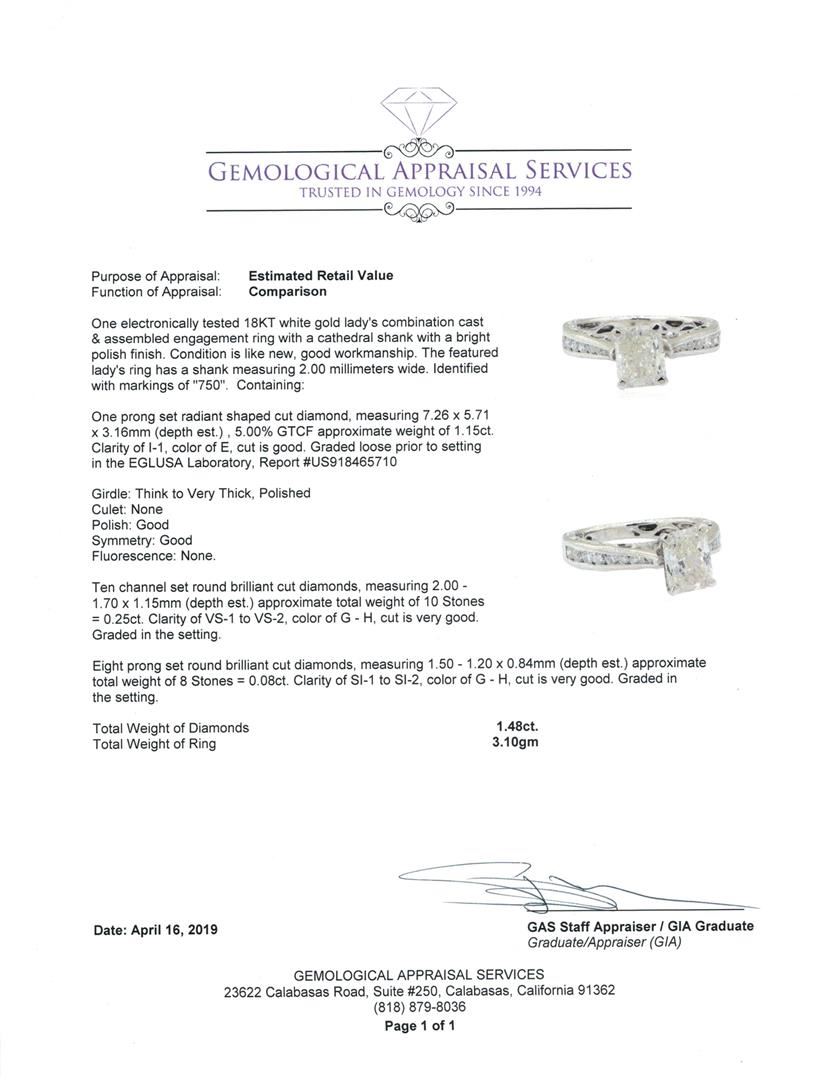 One electronically tested 18KT white gold lady's combination cast & assembled engagement ring with a cathedral shank with a bright polish finish. The featured lady's ring has a shank measuring 2.00 millimeters wide. Identified with markings of '750'. Condition is like new, good workmanship. Containing: One prong set radiant shaped cut diamond, measuring 7.26 x 5.71 x 3.16mm (depth est.) , 5.00.%. GTCF approximate weight of 1.15ct. Graded loose prior to setting in the EGLUSA Laboratory, Report #US918465710Girdle: Think to Very Thick, PolishedCulet: NonePolish: GoodSymmetry: GoodFluorescence: None. Color E Clarity I-1 Cut Good Ten channel set round brilliant cut diamonds, measuring 2.00 - 1.70 x 1.15mm (depth est.) approximate total weight of 10 Stones = 0.25ct. Graded in the setting. Color G - H Clarity VS-1 to VS-2 Cut Very Good Eight prong set round brilliant cut diamonds, measuring 1.50 - 1.20 x 0.84mm (depth est.) approximate total weight of 8 Stones = 0.08ct. Graded in the setting. Color G - H Clarity SI-1 to SI-2 Cut Very Good. Total Weight of Diamonds 1.48ct.. Total Weight of Ring 3.10gm GAS Appraised at $8940.00. GAS Appraised.