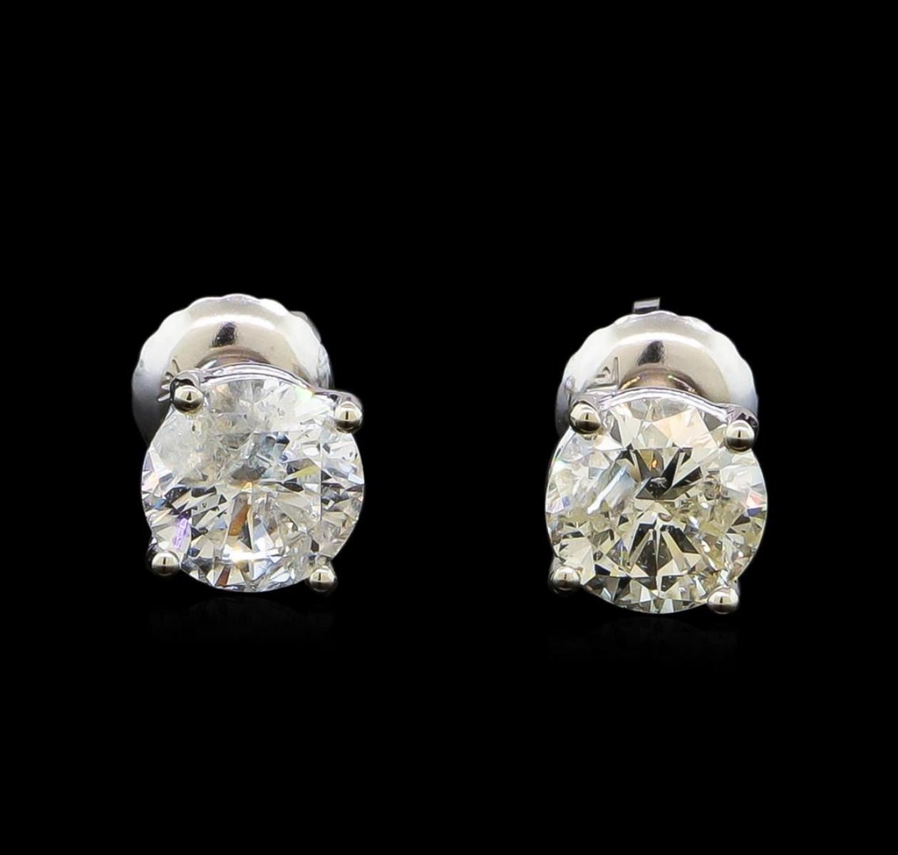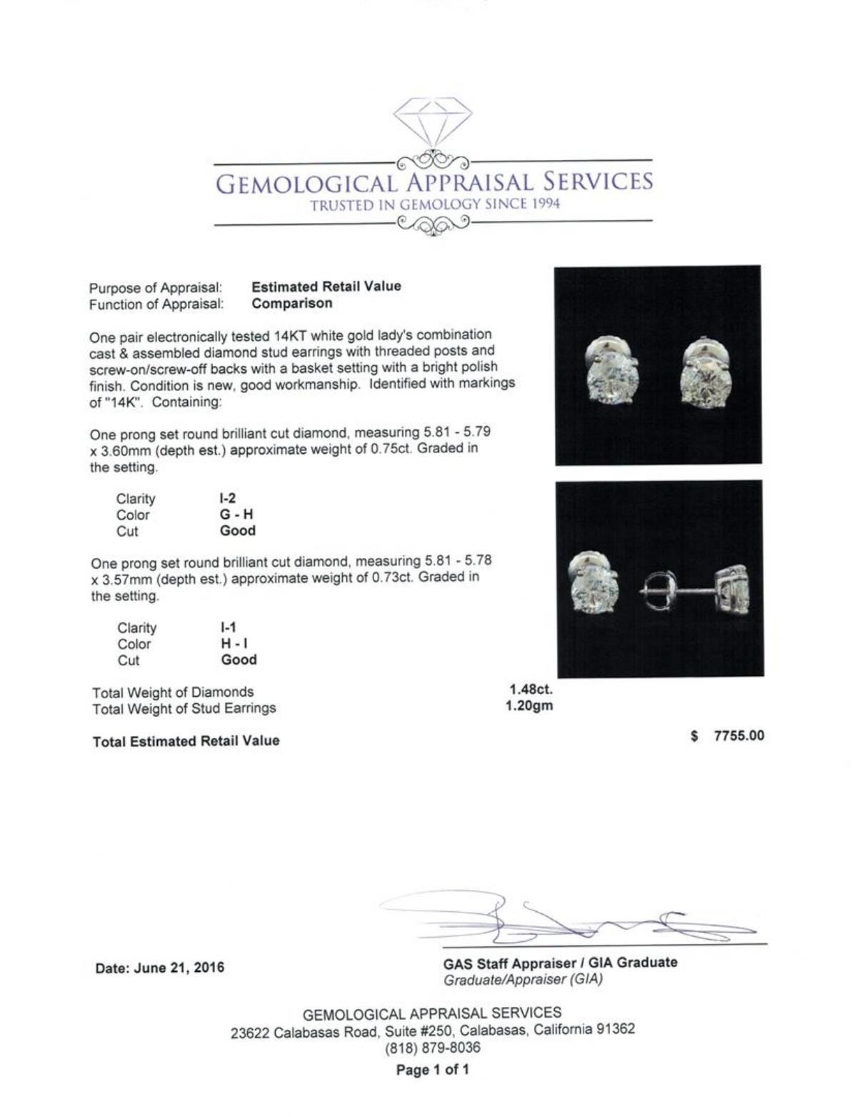 One pair electronically tested 14KT white gold lady's combination cast & assembled diamond stud earrings with threaded posts and screw-on/screw-off backs with a basket setting with a bright polish finish. Identified with markings of "14K". Condition is new, good workmanship. Containing: One prong set round brilliant cut diamond, measuring 5.81 - 5.79 x 3.60mm (depth est.) approximate weight of 0.75ct. Graded in the setting. Clarity: I-2. Color: G - Good One prong set round brilliant cut diamond, measuring 5.81 - 5.78 x 3.57mm (depth est.) approximate weight of 0.73ct. Graded in the setting. Clarity: I-1. Color: H - I. Cut Good. Total Weight of Diamonds 1.48ct. Total Weight of Stud Earrings 1.20gm. GAS Appraised.