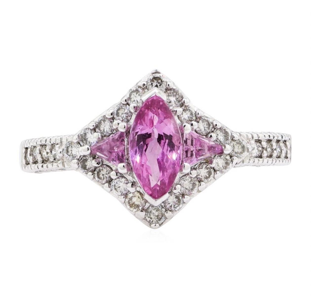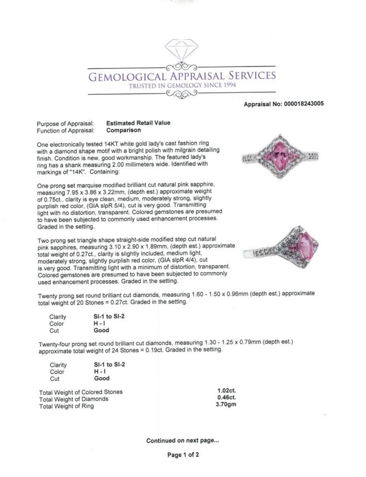 One electronically tested 14KT white gold lady's cast fashion ring with a diamond shape motif with a bright polish with milgrain detailing finish. The featured lady's ring has a shank measuring 2.00 millimeters wide. Identified with markings of '14K'. Condition is new, good workmanship. Containing: One prong set marquise modified brilliant cut natural pink sapphire, measuring 7.95 x 3.86 x 3.22mm, (depth est.) approximate weight of 0.75ct., clarity is eye clean, medium, moderately strong, slightly purplish red color, (GIA slpR 5/4), cut is very good. Transmitting light with no distortion, transparent. Colored gemstones are presumed to have been subjected to commonly used enhancement processes. Graded in the setting. Two prong set triangle shape straight-side modified step cut natural pink sapphires, measuring 3.10 x 2.90 x 1.89mm, (depth est.) approximate total weight of 0.27ct., clarity is slightly included, medium light, moderately strong, slightly purplish red color, (GIA slpR 4/4), cut is very good. Transmitting light with a minimum of distortion, transparent. Colored gemstones are presumed to have been subjected to commonly used enhancement processes. Graded in the setting. Twenty prong set round brilliant cut diamonds, measuring 1.60 - 1.50 x 0.96mm (depth est.) approximate total weight of 20 Stones = 0.27ct. Graded in the setting. Color H - I Clarity SI-1 to SI-2 Cut Good Twenty-Four prong set round brilliant cut diamonds, measuring 1.30 - 1.25 x 0.79mm (depth est.) approximate total weight of 24 Stones = 0.19ct. Graded in the setting. Color H - I Clarity SI-1 to SI-2 Cut Good. Total Weight of Colored Stones 1.02ct.. Total Weight of Diamonds 0.46ct.. Total Weight of Ring 3.70gm GAS Appraised at $3200.00. GAS Appraised.