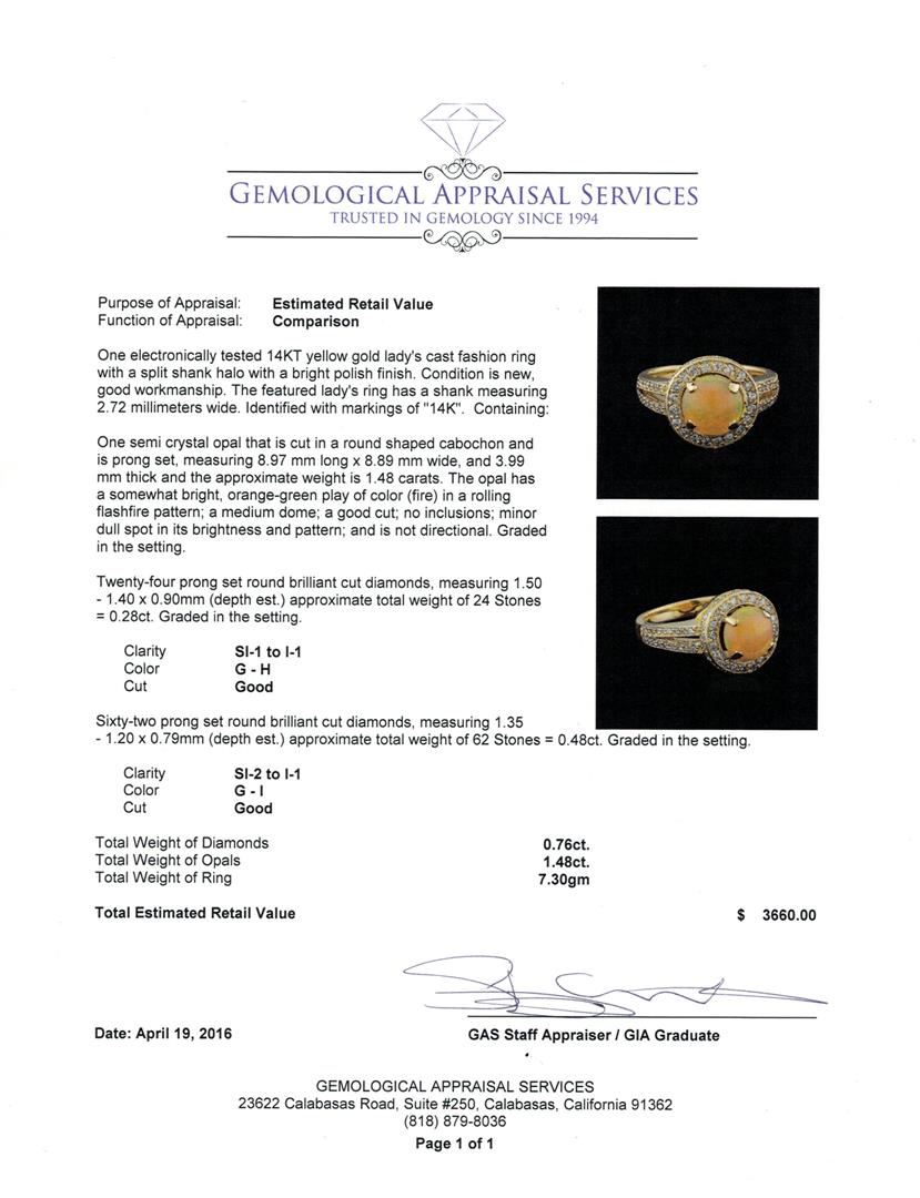 One electronically tested 14KT yellow gold lady's cast fashion ring with a split shank halo with a bright polish finish. The featured lady's ring has a shank measuring 2.72 millimeters wide. Identified with markings of "14K". Condition is new, good workmanship. Containing: One semi crystal opal that is cut in a round shaped cabochon and is prong set, measuring 8.97 mm long x 8.89 mm wide, and 3.99 mm thick and the approximate weight is 1.48 carats. The opal has a somewhat bright, orange-green play of color (fire) in a rolling flashfire pattern; a medium dome; a good cut; no inclusions; minor dull spot in its brightness and pattern; and is not directional. Graded in the setting. Twenty-Four prong set round brilliant cut diamonds, measuring 1.50 - 1.40 x 0.90mm (depth est.) approximate total weight of 24 Stones = 0.28ct. Graded in the setting. Clarity: SI-1 to I-1. Color: G - Good Sixty-Two prong set round brilliant cut diamonds, measuring 1.35 - 1.20 x 0.79mm (depth est.) approximate total weight of 62 Stones = 0.48ct. Graded in the setting. Clarity: SI-2 to I-1. Color: G - I. Cut Good. Total Weight of Diamonds 0.76ct. Total Weight of Opals 1.48ct. Total Weight of Ring 7.30gm. GAS Appraised.